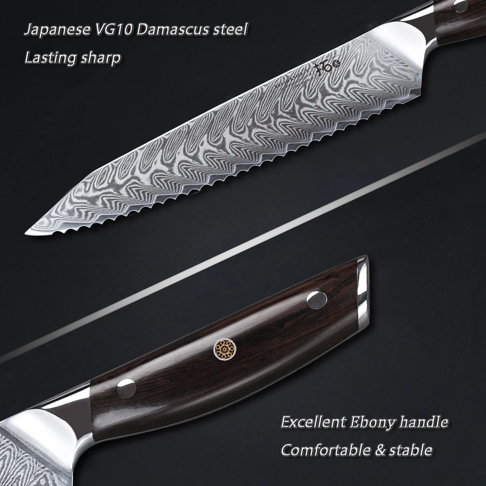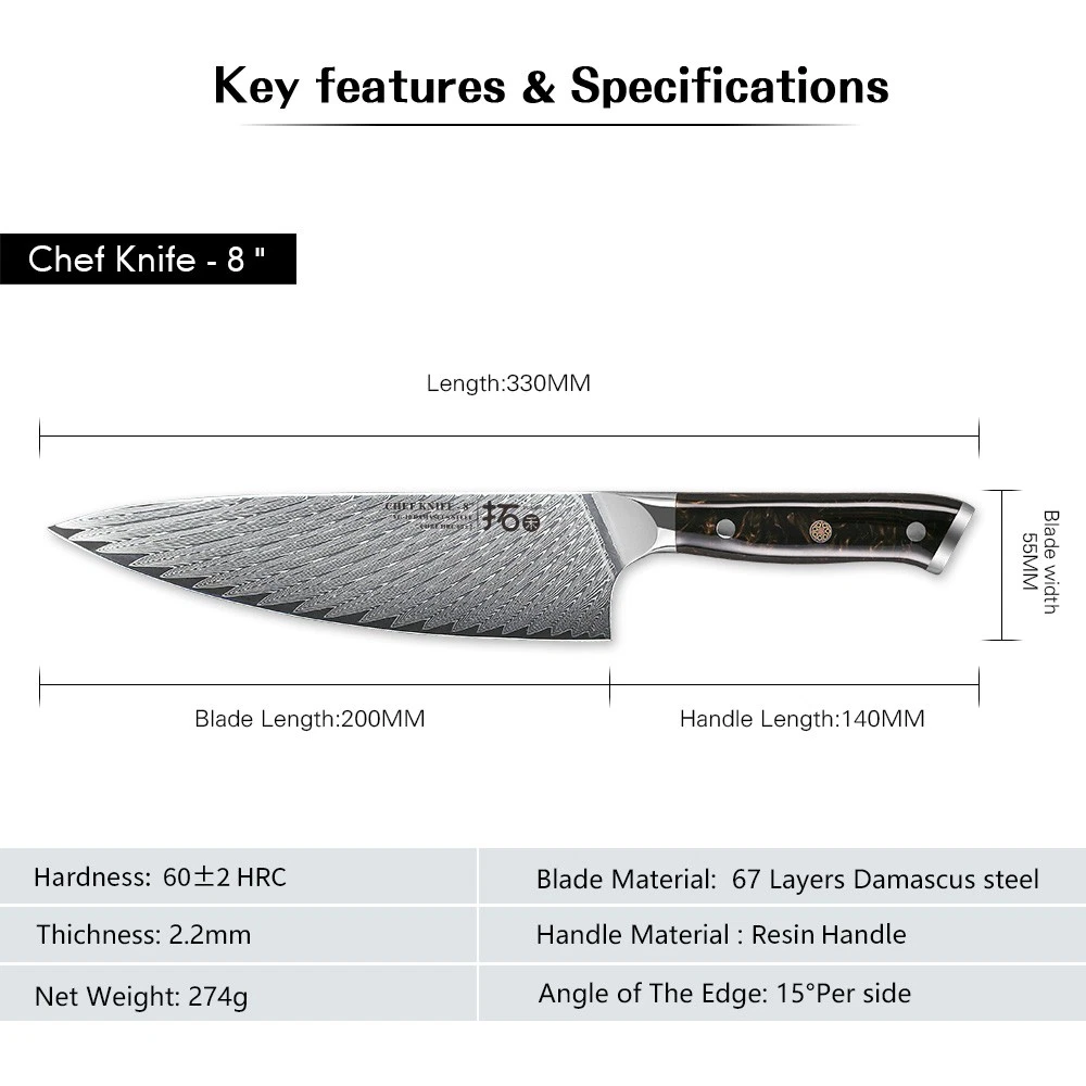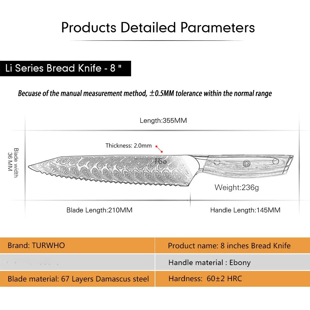 Color: Multicolor Room: Kitchen Manufacturer Warranty: Lifetime Handle Material: Resin Handle, Red G10 Handle, Ebony Handle Set Includes: Chef's Knife Making Method: Hot Air Blade Edge: Straight Features: Well Balance, Damascus Steel, Very Sharp gtin13: Does not apply Food Compatibility: Universal Type: Chef's Knife Material: Japanese VG10 Damascus Steel Number of Items in Set: 7 Blade Length: 3.5in, 6.5in, 8in, 8in, 8in Block Holder Material: Acacia Wood MPN: 113162126-7P UPC: Does not apply Bundle Description: 5x Knife, 1x Kitchen Shears, 1x Knife Block In Gift Box Cutting edge: 15 degrees Custom Bundle: Yes Brand: TURWHO
