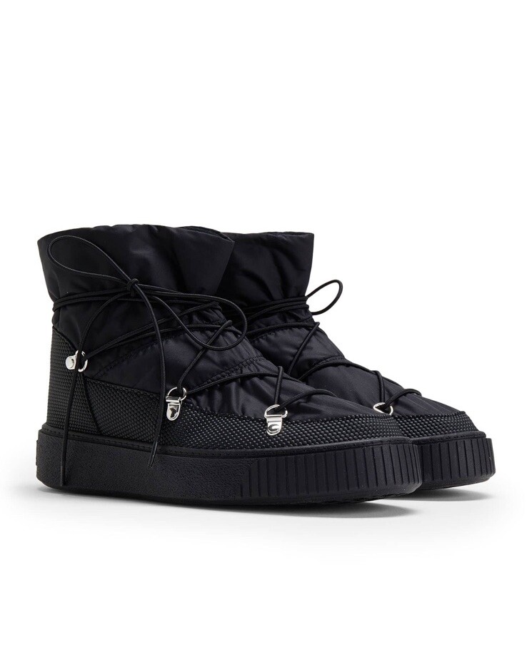 The 8 by YOOX Ankle Boots in size 11 (US) are stylish and practical black booties designed for women. These boots feature a flat heel and are made from nylon, suitable for casual occasions and outdoor activities. The ankle shaft style and sleek design make them a versatile addition to any wardrobe, offering both comfort and fashion-forward appeal.