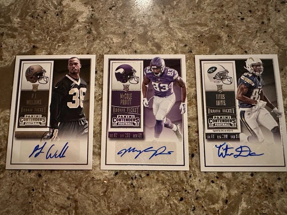 8 Card Lot 2015 Panini Contenders Rookie Ticket Autograph NFL 1 2015 Panini Contenders Rookie Ticket Autograph Bryan Bennett Card #165 - Indianapolis Colts 1 2015 Panini Contenders Rookie Ticket Autograph Josh Shaw Card #138 - Cincinnati Bengals 1 2015 Panini Contenders Rookie Ticket Autograph Owamagde Odighizuwa Card #128 - New York Giants 1 2015 Panini Contenders Rookie Ticket Autograph Levi Norwood Card #177 - Chicago Bears 1 2015 Panini Contenders Rookie Ticket Autograph Jordan Taylor Card #167 - Denver Broncos 1 2015 Panini Contenders Rookie Ticket Autograph PJ Williams Card #129 - New Orleans Saints 1 2015 Panini Contenders Rookie Ticket Autograph MyCole Pruitt Card #141 - Minnesota Vikings 1 2015 Panini Contenders Rookie Ticket Autograph Titus Davis Card #155 - New York Jets