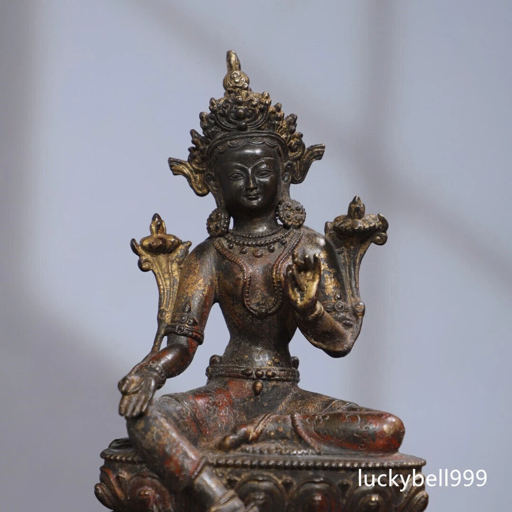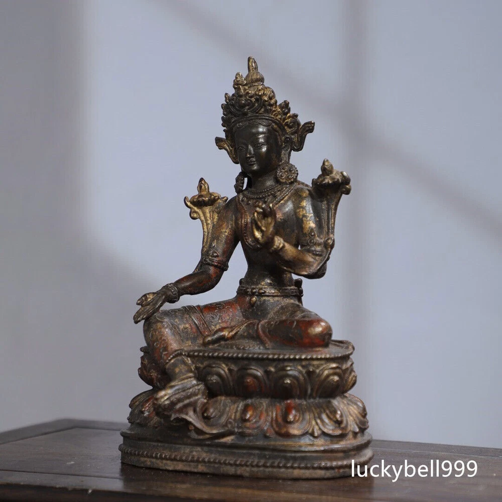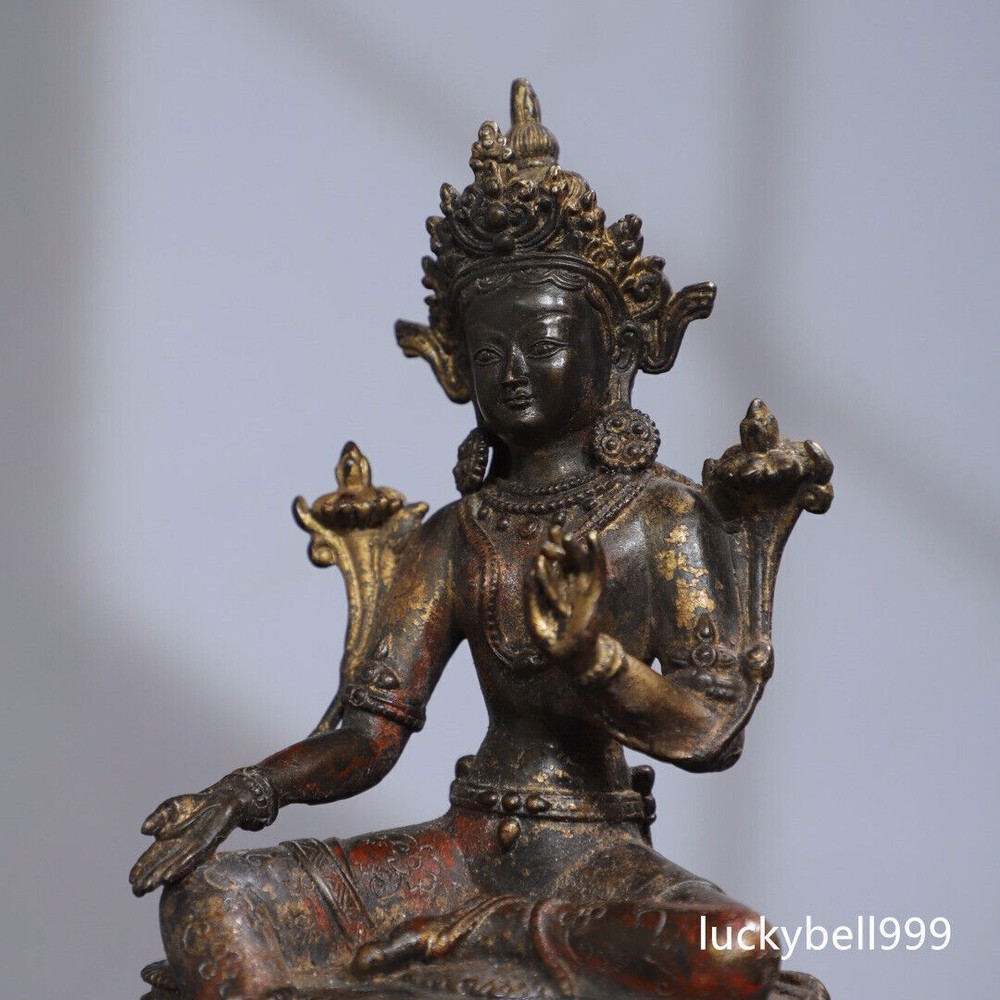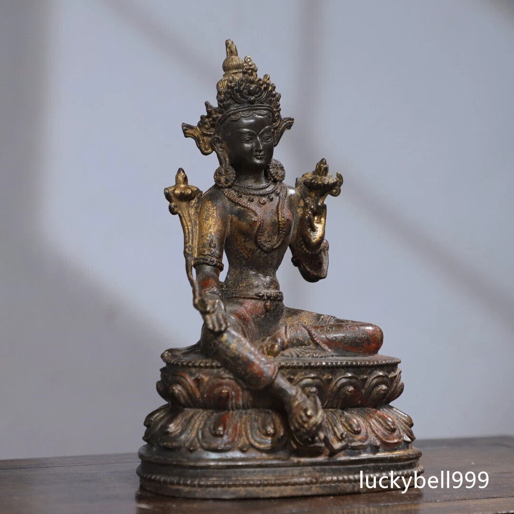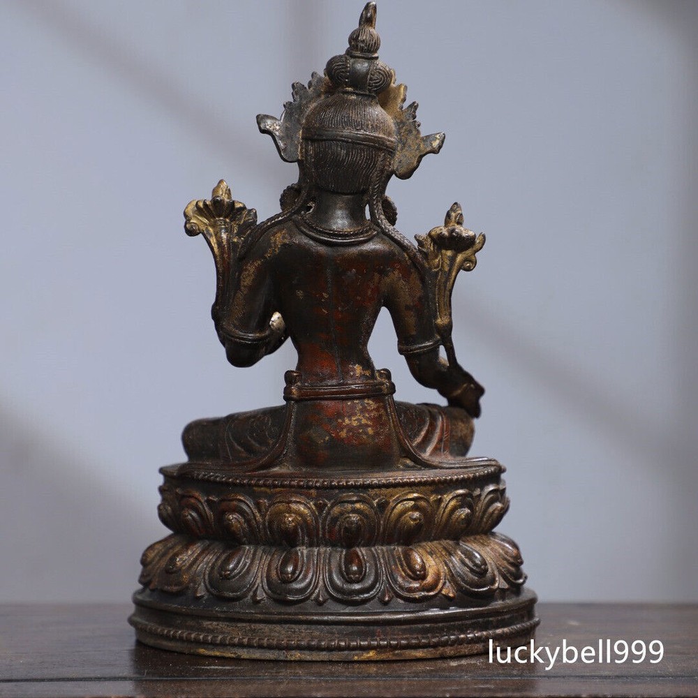 8" China Antique Tibetan Buddhism Temple Bronze gilt Green Tara Buddha statue Size: Height: 20cm wide: 14cm weight: 1.22kg Material:Bronze NOTE: Withno wood stand Condition: Good condition Origin: China