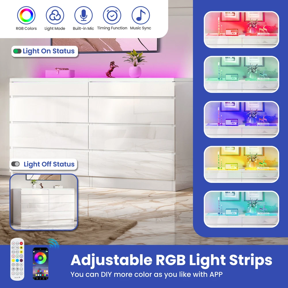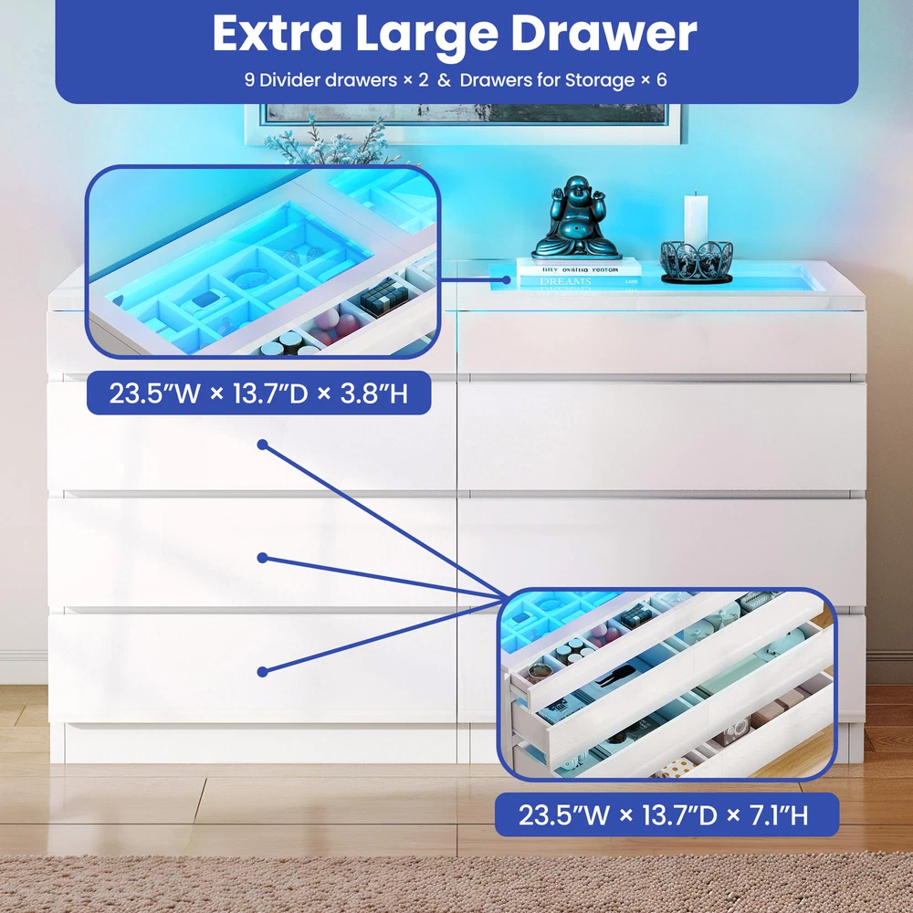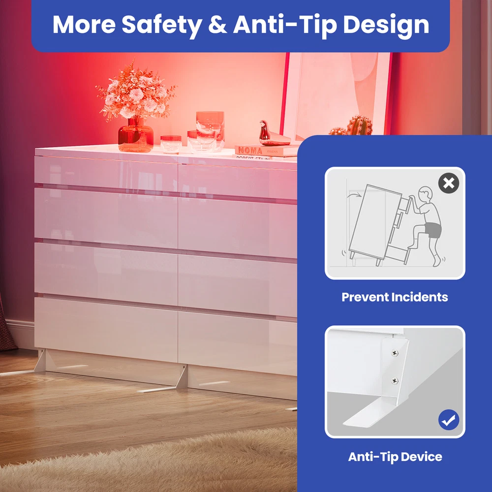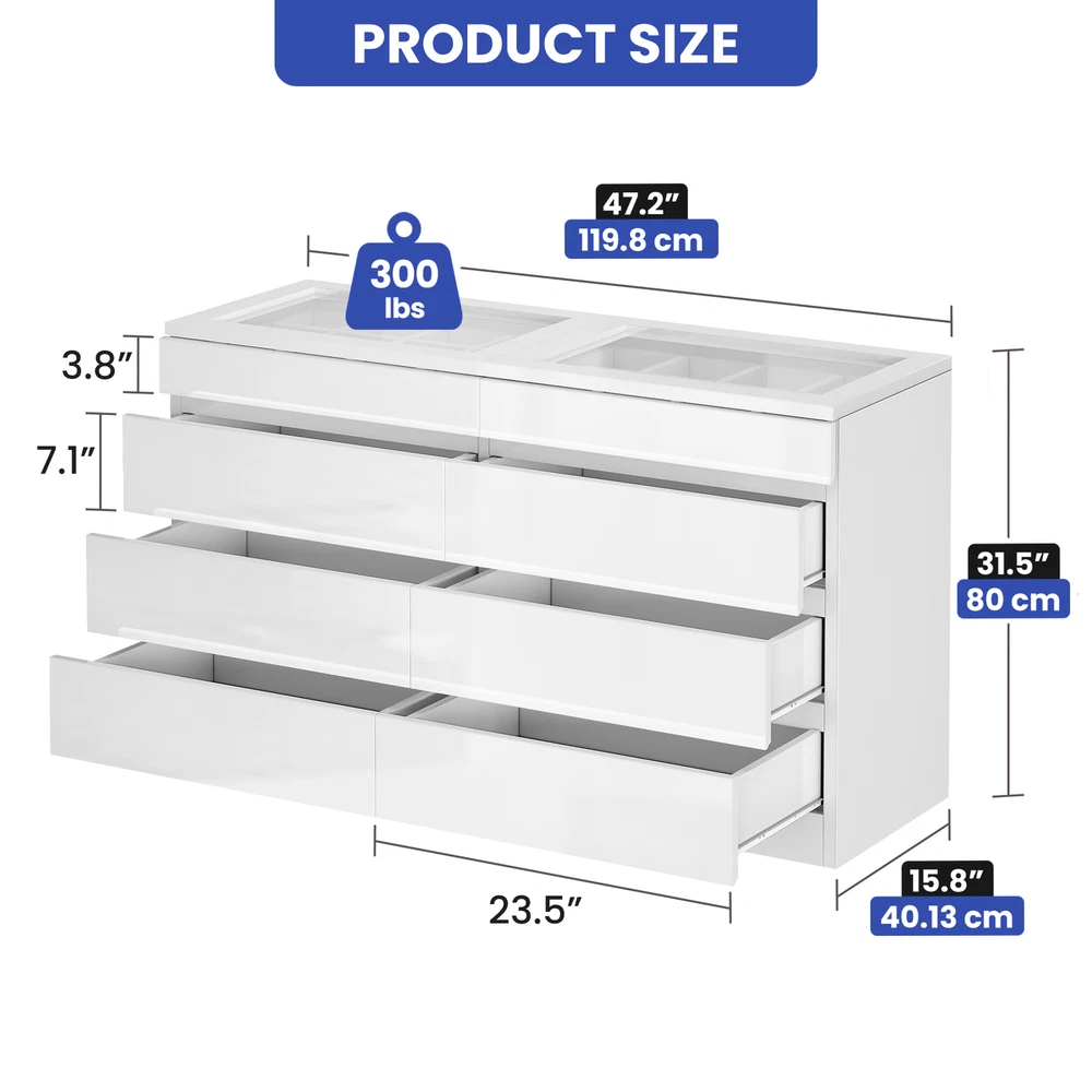 8 Drawer LED Chest of Drawers Dresser Vanity Cabinet White Storage Space Bedroom Product Description NOTE: Professional Installation would be Highly Recommended. Description: 1. Color: White 2. Material: MDF Wood 3. Ideal for: Chest of Drawer, Dresser Cabinet, Storage Cabinet, Vanity Cabinet, Chest of Storage 4. Recommendations Room: Entryway, Bedroom, Kitchen, Living Room, Home Office/Study, Hallway 5. Special Features: With 8 Divider Drawer, With Drawers Storage, With Anti Tipping Device, With LED Lights, With Extra Storage Drawer Features: 1. LED Illuminated Chest of Drawers: Elevate your space with our LED Illuminated Chest of Drawers , offering a stunning array of over 20 vibrant LED colors . The tempered glass top adds a touch of sophistication while providing easy viewing of drawer contents. 2. Robust & Sleek Design: Embrace durability and style with our white cabinet, expertly crafted from sturdy P2 MDF material . Supporting up to 300 lbs , its high gloss finish enhances its modern appeal, making it a versatile and chic addition to any room. 3. Versatile Storage Solution: Experience the perfect blend of functionality and style with 8 spacious drawers , ideal for organizing various items in offices, bedrooms, or kitchens. This dresser seamlessly combines practicality with a contemporary design aesthetic. 4. Effortless Assembly: Enjoy a hassle-free setup with clear instructions and labeled parts included. Our dedicated team is on standby to assist with any queries, ensuring a smooth and stress-free installation process for your new storage chest. Dimensions: 1. Product Dimensions: 47.2 " L x 15.8" W x 31.5" H 2. Large Drawer Dimensions: 23.5" L x 13.7" W x 7.1" H 3. Small Drawer Dimensions: 23.5" L x 13.7" W x 3.8" H 4. Overall Product Weight: 100.75 lbs. 5. Top Weight Capacity: 300 lbs. Package Included: 1 x Chest of Dresser 1 x Instructions 1 x Accessory Kit Shipping 1. Normally the item will be dispatched within 1 business day if payment is cleared before 12pm PST. 2. Please verify the correct shipping address in your PayPal account before making the payment. We only dispatch the item to the address that is sent to us at the time of checkout. 3. We don't ship to Hawaii, Alaska, Puerto Rico, APO/FPO/PO Boxes. 4. We don't provide local pick-up service. 5. Normally we will use USPS, UPS, FedEx & LTL to dispatch items. Payment 1. We accept PayPal and credit card. 2. We will ship to the confirmed Paypal shipping address that is provided with the payment only. Return 1. 30 days Money Back Guarantee. 2. Please contact our customer service to receive a RMA form first if want to return the item. 3. All returned items MUST in new condition with the original package. Contact If has any problem, please contact us by sending an ebay message. Our customer service will resolve the problem as soon as possible. On Nov 11, 2024 at 03:58:48 PST, seller added the following information: On Nov 19, 2024 at 01:27:53 PST, seller added the following information: On Nov 26, 2024 at 19:11:36 PST, seller added the following information: On Dec 2, 2024 at 17:45:26 PST, seller added the following information: