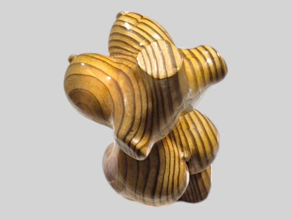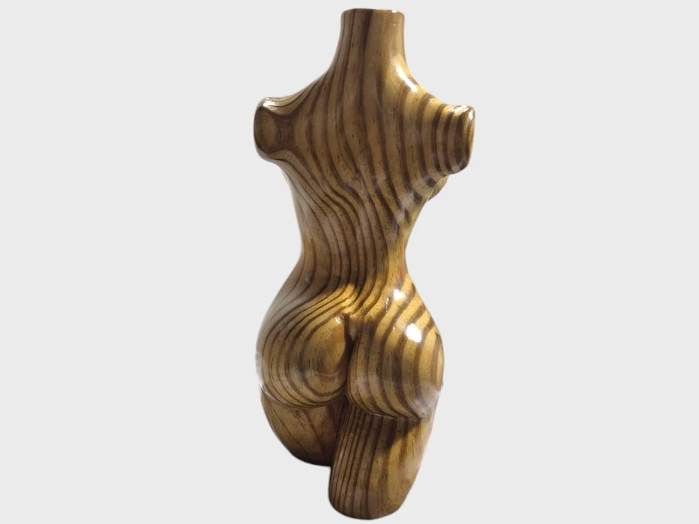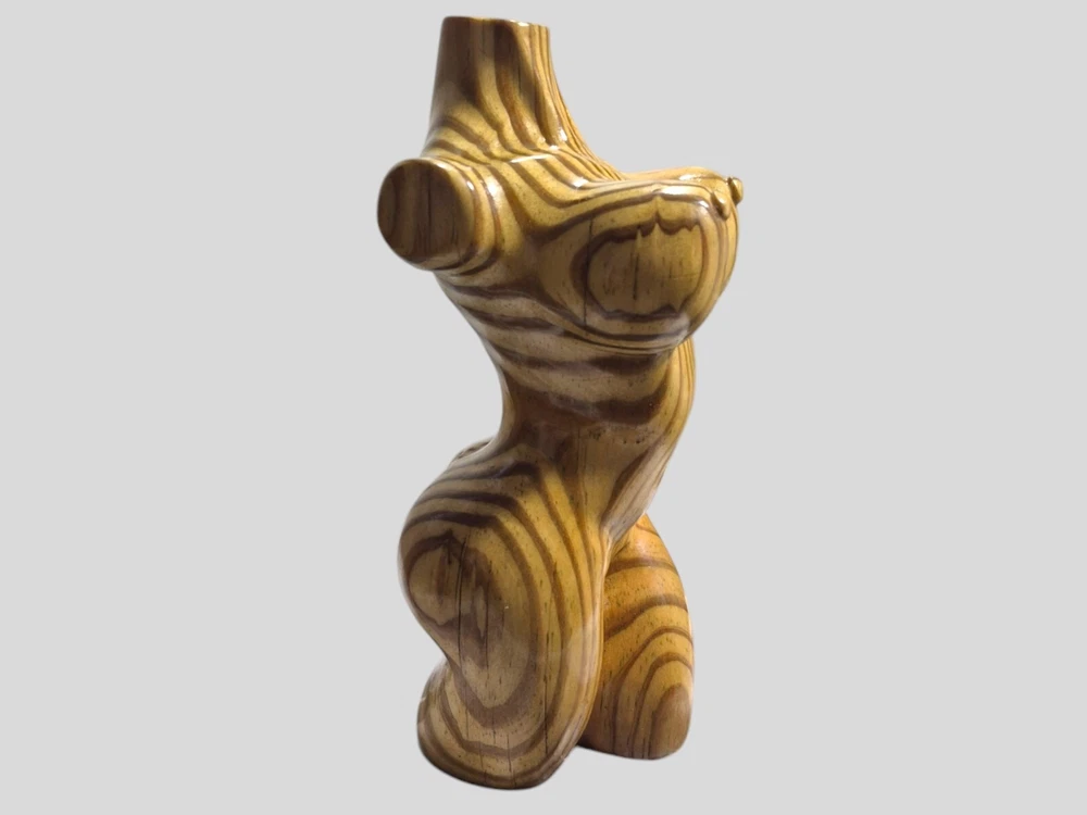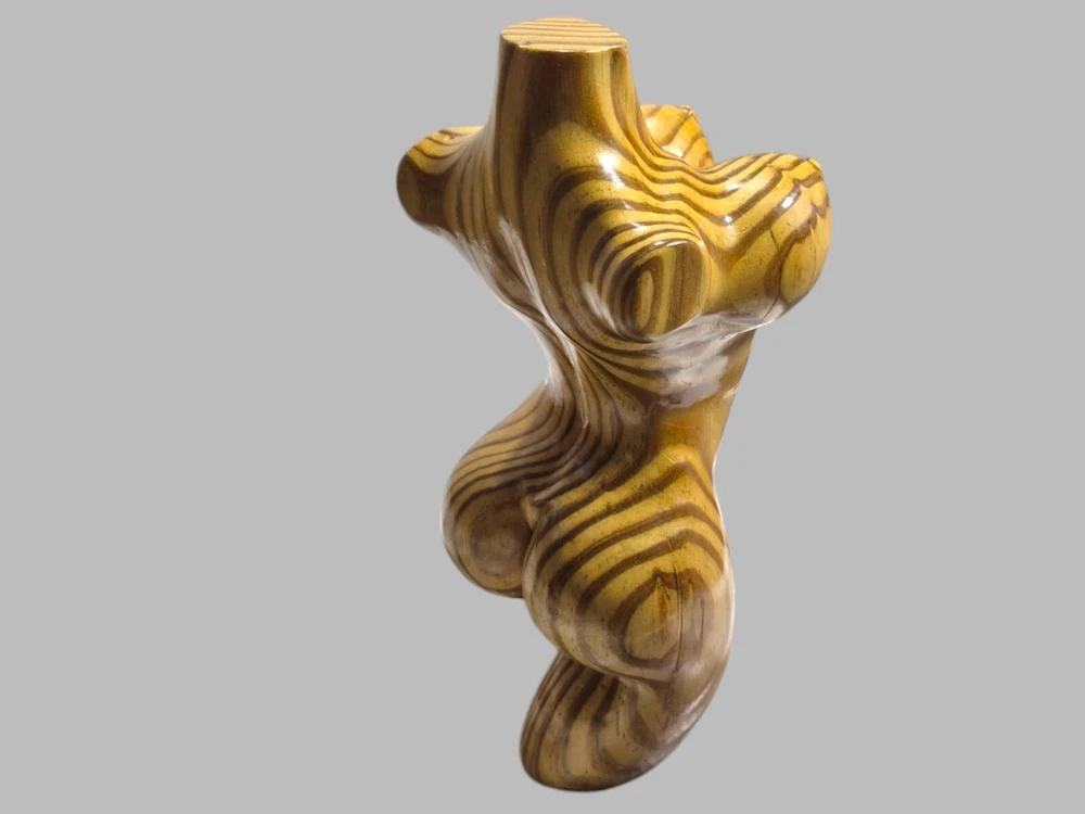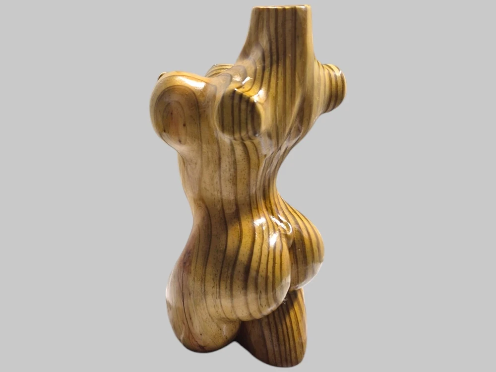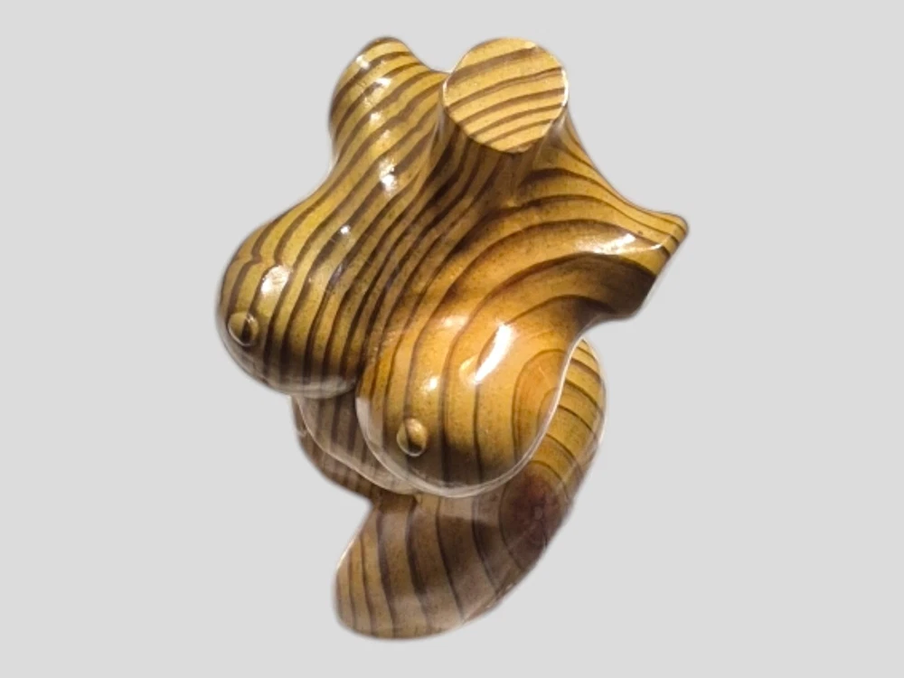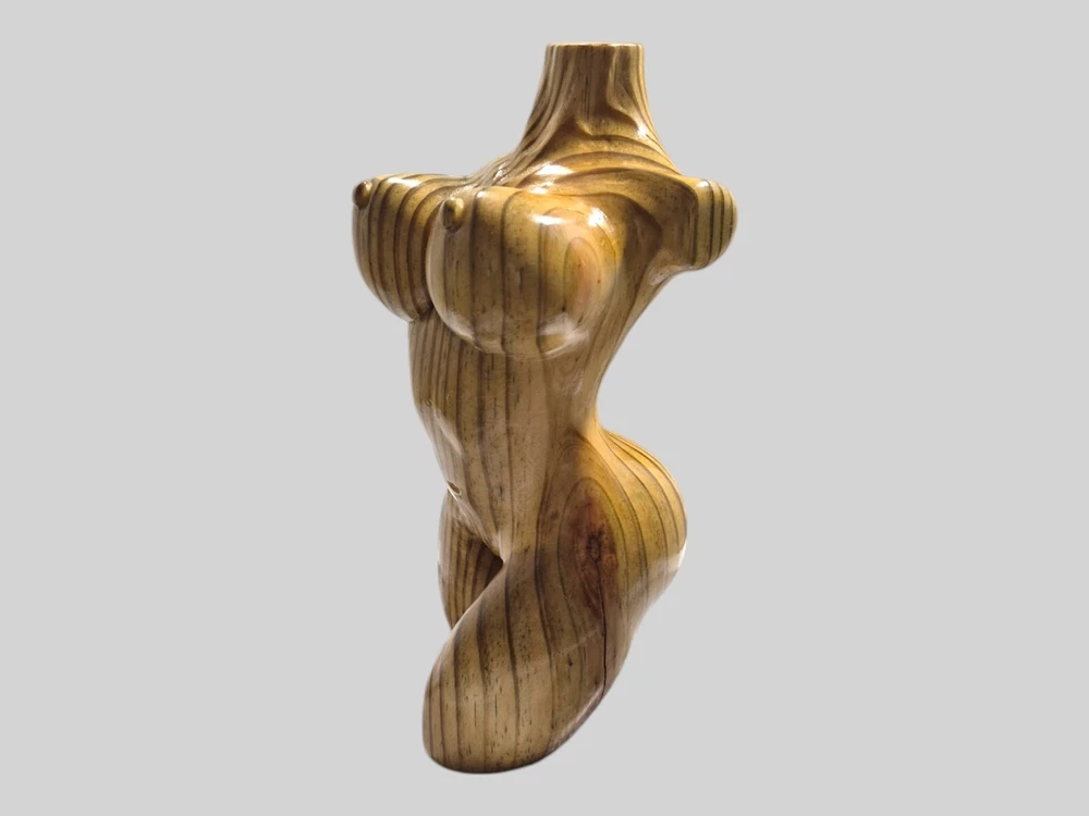"This captivating hand-carved wooden female torso sculpture is a unique and sensual work of art. Each curve has been carefully crafted to create a realistic and elegant representation of the female body. The wood used - recycled pine - provides a warm tone and a natural texture that enhances the beauty of the sculpture. This 8" high and 4" wide piece is perfect for those looking to add a touch of erotic and contemporary art to their home."