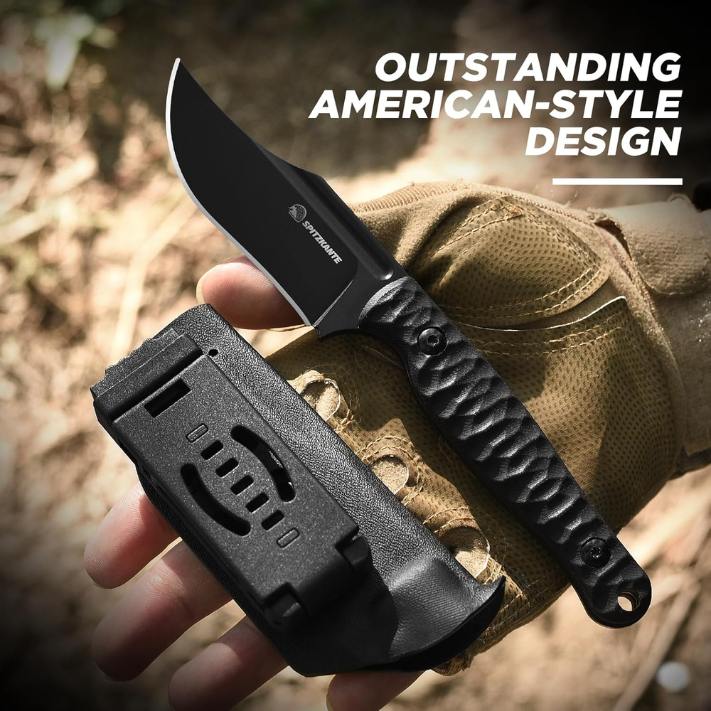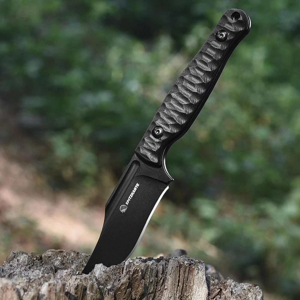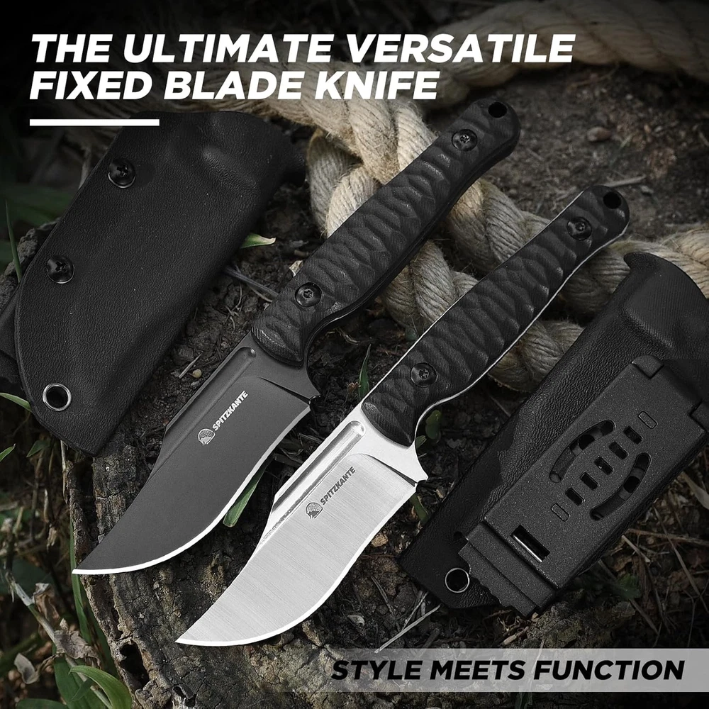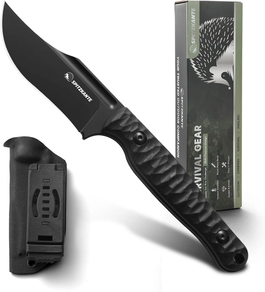 D2 Steel Blade: Crafted from high-quality D2 steel, the blade of the SPITZKANTE Fixed Blade Knife provides corrosion resistance, and durability. Designed for outdoor and tactical tasks, this blade performs reliably, whether in wilderness settings or everyday use. Full Tang Construction: This horizontal knife’s full tang design offers strength and stability, reducing the risk of breakage during tasks. Paired with a G10 handle, the full tang construction ensures a balanced, solid feel in the hand, making it a dependable tool for any challenging environment. Ergonomic G10 Handle with Non-Slip Grip: Choose a handle designed for comfort and safety. The textured ergonomic handle provides a non-slip grip that remains stable in wet or rough conditions, giving users greater control and confidence. Kydex Sheath with Horizontal Carry: The included Kydex sheath is designed for secure horizontal carry, keeping your edc fixed blade knife safe when not in use. Its durable construction protects the blade while allowing access, making it ideal for both tactical use and outdoor exploration. Versatile Outdoor and Tactical Tool: Ideal for survivalists, campers, hunters, and EDC enthusiasts, the SPITZKANTE tactical fixed blade knife with sheath is suited to a variety of tasks. From preparing firewood, this knife’s versatility and reliability make it a must-have for anyone who values gear. Product Description SPITZKANTE Knives Add to Cart Add to Cart Add to Cart Add to Cart Add to Cart Customer Reviews 4.5 out of 5 stars 27 — 4.2 out of 5 stars 4 4.5 out of 5 stars 2 4.7 out of 5 stars 4 3.7 out of 5 stars 14 4.1 out of 5 stars 45 Price $33.99 $ 33 . 99 — $35.99 $ 35 . 99 $22.99 $ 22 . 99 — $19.99 $ 19 . 99 $12.99 $ 12 . 99 Blade Material D2 Steel D2 Steel D2 Steel 5Cr14MoV Stainless Steel D2 Steel D2 Steel 5Cr14MoV Stainless Steel Whole Length 20.3 cm/ 7.99" 20.3 cm / 7.99" 17.6 cm / 6.92" 16.5 cm / 6.49" 21.2 cm / 8.35" 20.1 cm / 7.91" 14 cm / 5.51" Blade Length 8.9 cm / 3.5“ 8.9 cm/ 3.5“ 8.7 cm / 3.42" 6.2 cm / 2.44" 10.6 cm / 4.17" 9.4 cm/ 3.7" 7.1 cm/ 2.79" Handle Length 11.3 cm / 4.44" 11.3 cm/ 4.44" 10.5 cm /4.13" 9.4 cm / 3.7" 10.5 cm / 4.13" 11.3 cm/ 4.45" 7.4 cm/ 2.91" FULL TANG ✔ ✔ ✔ ✔ ✔ ✘ ✔
