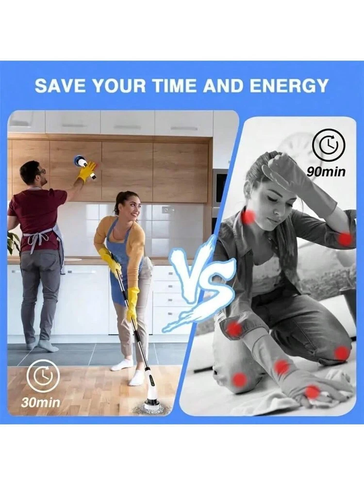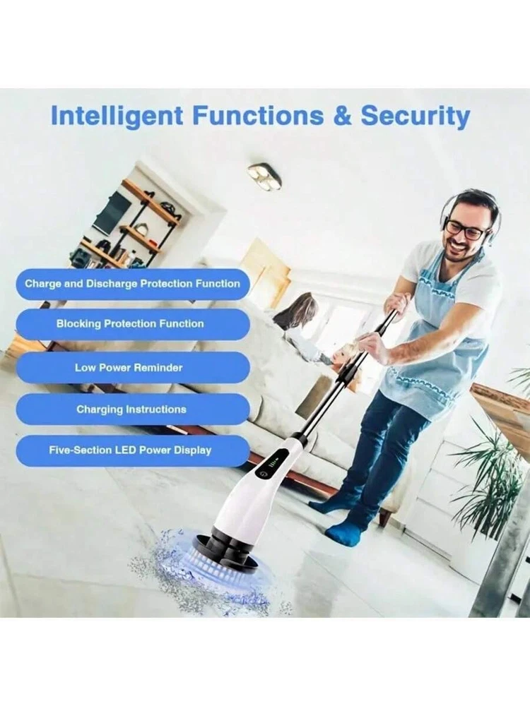 Description 【 - 】The electric spin scrubber is equipped with an upgraded motor and has 2 cleaning speeds, offering more powerful and faster speeds from the low-speed 400RPM to the high-speed 450RPM. Just press the button to adjust the speed, and the cleaning supplies electric scrubber will provide enough power for cleaning layers of dirt easily and cut your half cleaning time and energy. Enjoy the house-cleaning without suffering from soreness of the waist and arms. 【7 】This cleaning brush comes with 7 replaceable brushes for various scenarios: ①Large flat brush is suitable for cleaning large flat surfaces, such as floors, and staircases; ②Small flat brush for small flat surface; ③Sponge brush for glass, cars; ④Corner brush for corners, crevices, wheel hubs; ⑤Cloth brush for glass tiles; ⑥Fiber brush for oven stove, cooktop sink; ⑦Anti wool plate for the interior of the car. Makes the deep cleaning and the house sparkle a breeze with this power scrubber with versatile replaceable brushes. 【-- & 】No strain on your back and kneel during cleaning from now on. The shower scrubber is equipped with 3 detachable handles, the short one is ideal for the middle places, and connects with any two longer handles for the lower and higher areas without bending and kneeling cleaning. The length of scrub brush with an extendable handle is from 11 inches up to 51 inches, which is long enough for you to clean the ceiling easily. 【 & 】 Powered by 1800 mAh rechargeable battery, the electric scrubber after 3.5 hours of fast charging is available to work for up to 90 minutes. The shower scrubber for cleaning with 5 level battery display allows you to view the dump battery and able to recharge it in time. Thanks to the feature of waterproof IPX5, so there is no worry about malfunction due to ingress of water. 【 】The electric cleaning brush is also equipped with a hanger for hanging the shower cleaning brush on the wall and a mesh shrink pocket for storing the brush head which contributes to drying the replaceable brushes and no missing parts anymore. 【 】Makes a great gift for Mother's day, Father's day or Christmas Day to your family, friends or even yourselves who hate the cleaning tasks. This electric spin scrubber makes them light out of dirty works effectively. The premiun quality and thoughtful services are both our pursue. So if you have any problems, please don’t hesitate to contact us, and we will solve your problem within 24 hours. Package Includes: 1 x Electric Scrubber 7 x Replaceable Brush Heads 2 x Extension Rods 1 x USB Charging Cable Material: ABS, PC, RUBBER Input voltage: 5V/1A Capacity: 2500 mah Rated voltage: 2.9V-4.2V Rated power: 4W Waterproof level: IPX6 Input interface: USB Type-C (input interface with waterproof design) Working gear \ torque: 2 gears, first gear torque >=38kgf. cm, second gear 28kgf. cm Brush head White + Gray / Speed: 2 gears, first gear speed 420R / Min, second gear 330R / Min White + Black Usage: Long press the power switch, short press to switch high/low speed, the default is high speed when powered on. Battery life: 1st gear (high speed) continuous use of about 120MlN, 2nd gear (low speed) continuous use of about 10min Battery capacity: 2000mAh Head rotation angle: 3. , Rotational torque: ≥ 28kgf.cm Decibel value (rotating state): less than 70dB at one meter Charging time: about 210 minutes Size specification Color box: 445 * 170 * 80m Product weight including packaging: 1. 25kg