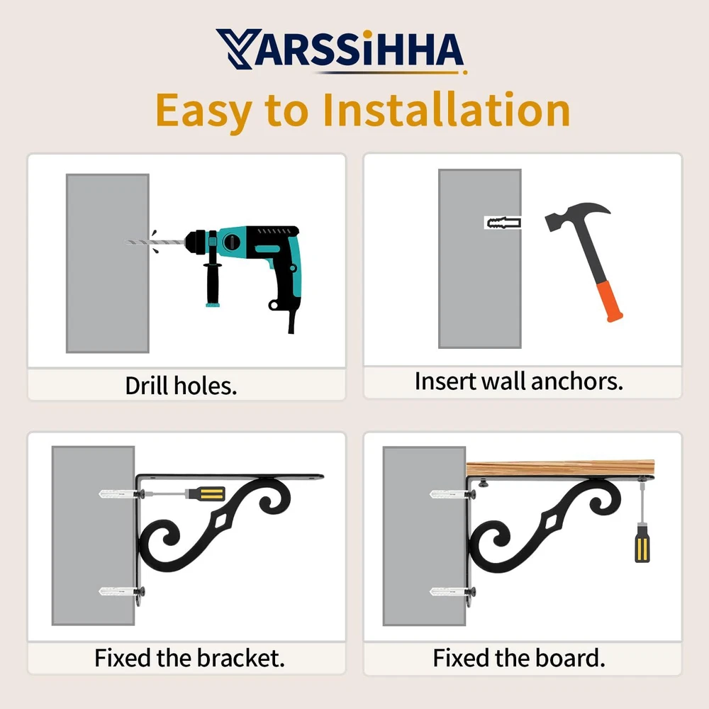 Attention: First, please confirm the sizes and quantities of wall shelf brackets you needed before purchasing. Second, the distance between shelf brackets and numbers of brackets will affect carrying capacity. Add more brackets to hold more weight easily Size & Specification: The dimensions of 8 inch decorative shelf brackets are 7.87"L x 5.51"H x 0.98"W, thickness are 0.1" (2.5 mm). They are made available for 6" to 10" deep shelves, both short and long sides can be used to install the floating shelves. Our heavy duty metal shelf brackets can hold up to 120 LBS per pair Advantage & Feature: Adopting fine cast iron materials, combining integral casting process, the shelf support has excellent bearing capacity. Vintage slant support is welded and fixed, right triangle structure increases stability and will not deform easily. coated glossy black surface brings you a completely new enjoyment, it is fine workmanship with smooth edges, never hurt your hands, durable and has long service life Installation Guideline: Comes with all installation hardware (Board is NOT included): 8 inch wall mounted shelf brackets, four long screws, four short screws as well as four concrete anchors, the shelving brackets are quick and easy to install. Brackets for shelves can be used on most walls, such as wall, ceramic tile wall, brick wall, solid wall Used Widely: Best for study decoration, living room decoration, kitchen storage, bathroom storage, supermarket shelves, bar storage, balcony or outdoor potted plants placement. DIY your space by decorative shelving brackets. Our decorative brackets will maximize the use of your space, bring you a tidy and orderly home