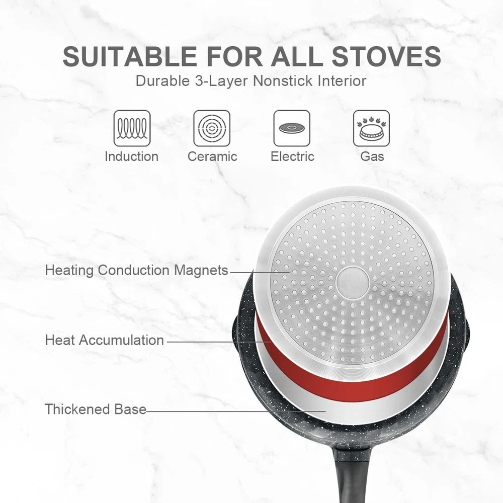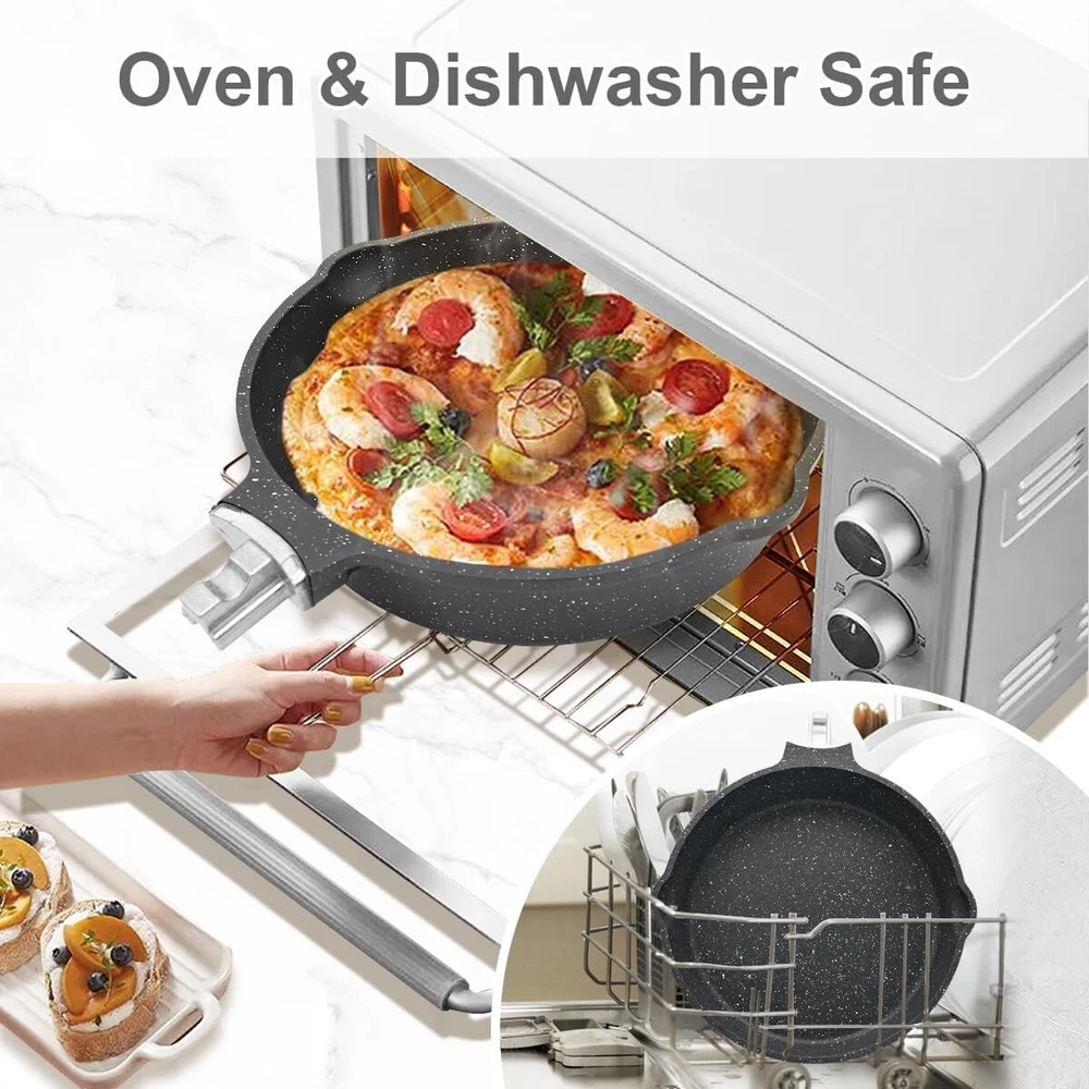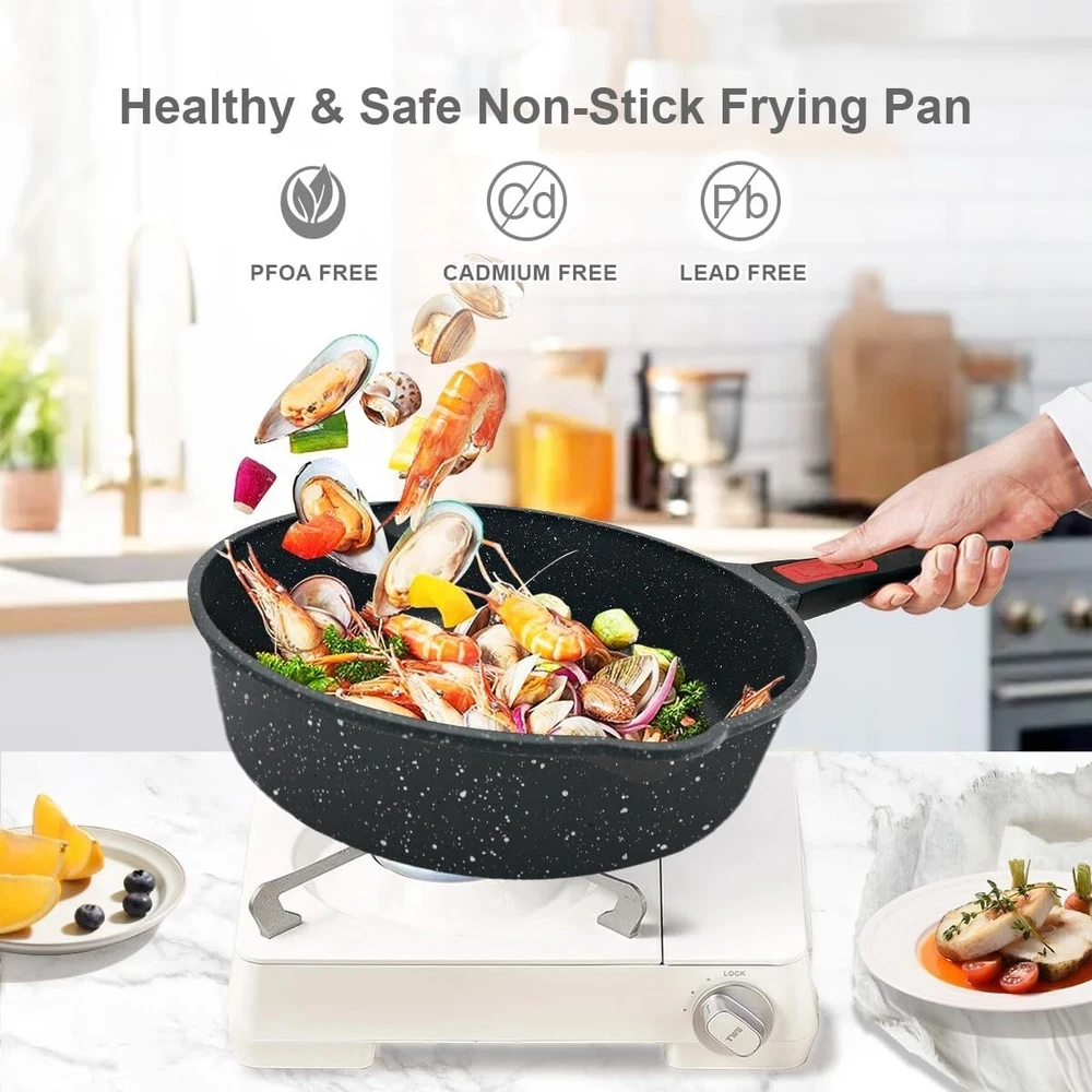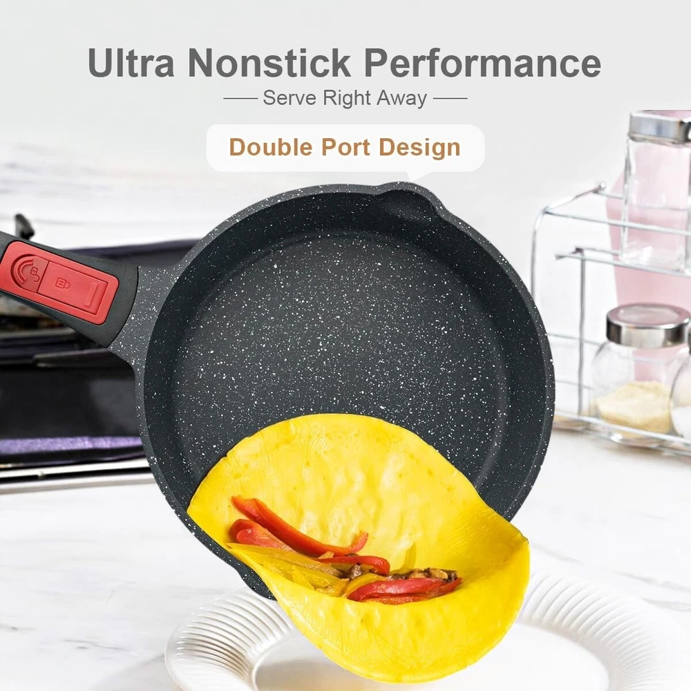 8 Inch Nonstick Deep Frying Pan, Egg Pan with Removable Handle, Aluminum Sauté Pan Compatible with All Stovetops, Dishwasher& Oven Safe (Black) 【Durable Non-stick Coating Performance】The surface of the 8 inch deep frying pan is made of granite non-stick coating, 100% PFOA, PTFE, lead and cadmium free, ideal for healthy cooking. Meet the various needs of the whole family for saute, steam, boil and shallow fry. 【Nonstick Stone Frying Pan with Removable Handle】Easily removable by pressing the red button. Removable handle is more stability and no wobbling. The ergonomic Bakelite grain handles for you to grip comfortably. 【Oven & Dishwasher Safe】The 8 inch deep frying pan can be placed in the oven for baking. Ovenproof up to 500℉ (Note: Please make sure you remove the handle before putting it in the oven!) In addition, two pouring ports of egg frying pan are very convenient when you pouring out food, such as oil and soup. 【Suitable for All Stoves】Premium aluminium alloy combined with magnetized base enables fast and even heat transfer. The 8 inch egg omelet pan coated made of cast aluminum, which is durable. Suitable for all types of stoves, gas, ceramic, electric, induction. 【Service & Guarantee】 Each nonstick frying pan passes strict multi inspection process. In case you received defect items caused by delivery, please don't hesitate to reach out, thanks. You will be guaranteed to get 100% refund or a new replacement. Shipping We offer FREE shipping on all orders! We ship within Five business days of payment, usually sooner. We use a selection of shipping services such as UPS, FedEx, USPS etc. We only ship to the lower 48 states, no APO/FPO addresses or PO Boxes allowed. Local pickups and combined shipping options are not provided at this time. Return You can return a product for up to 30 days from the date you purchased it. Any product you return must be in the same condition you received it and in the original packaging. Please keep the receipt. Payment We accept payment by any of the following methods: PayPal Please pay as soon as possible after winning an auction, as that will allow us to post your item to you sooner! Feedback Customer satisfaction is very important to us. If you have any problem with your order, please contact us and we will do our best to make you satisfied. Contact Us If you have any queries, please contact us via ebay. We usually respond within 24 hours on weekdays. Please visit our eBay store to check out other items for sale! Thank you for shopping at our store.