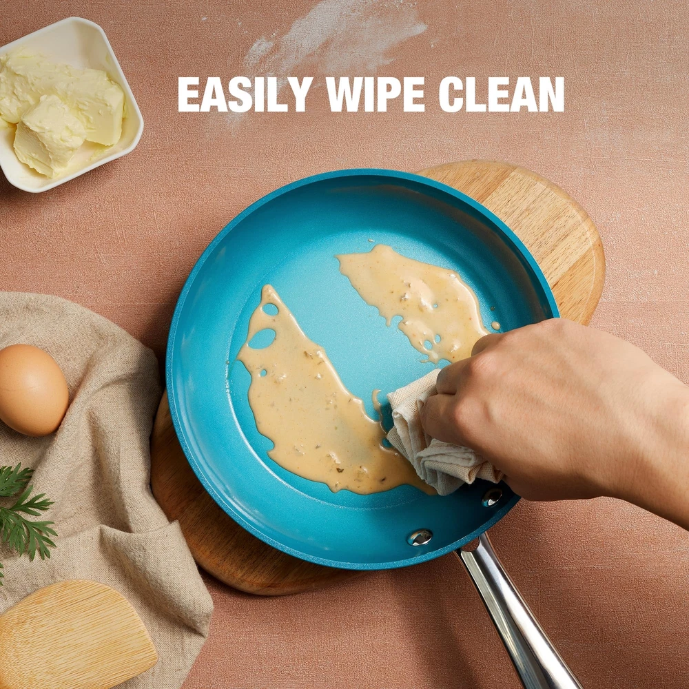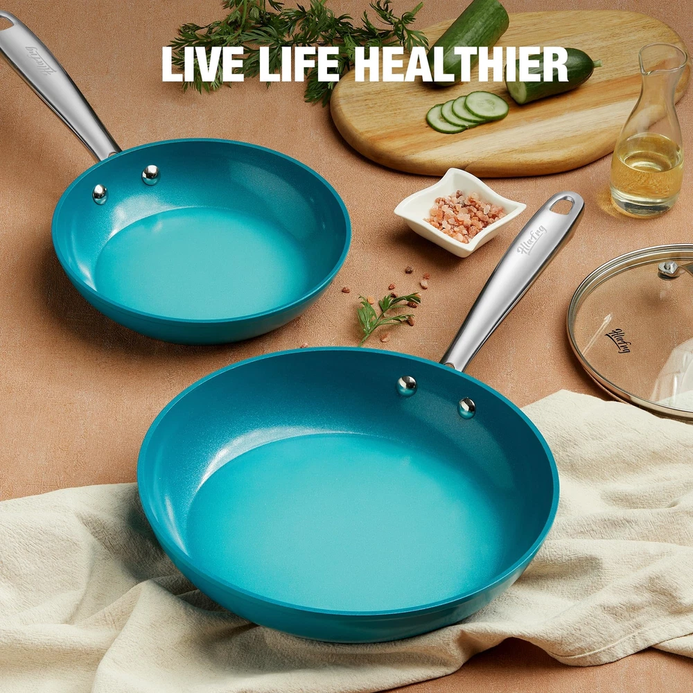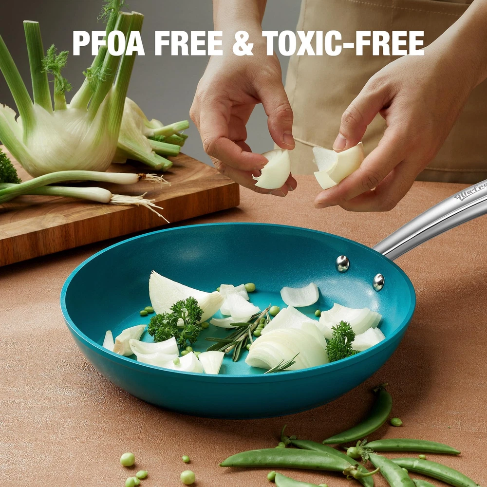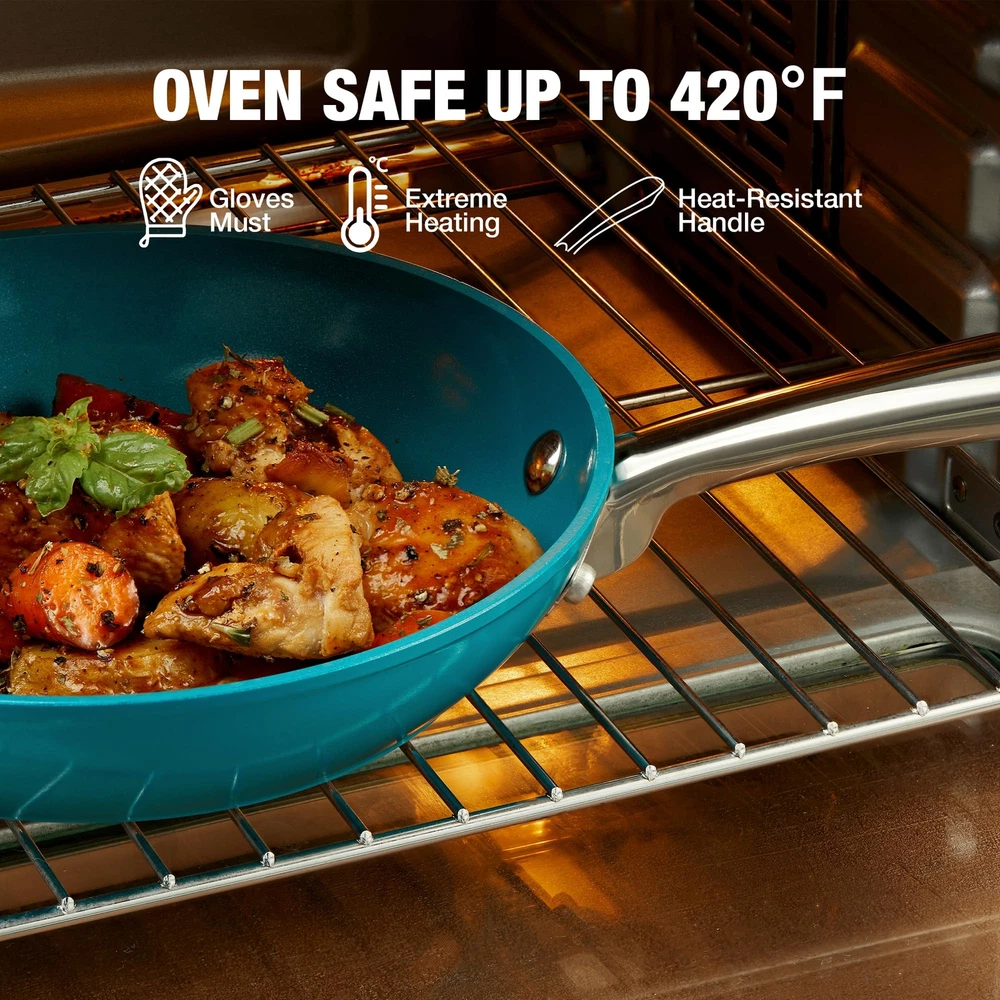 STAINLESS STEEL HANDLE: The double-riveted stainless steel handle is ergonomically designed to ensure firm and comfortable grip. Please note that pads or gloves are required to prevent burns after long-time open-flame cooking ULTRA NON-STICK PERFORMANCE: 8 inch ceramic frying pan with ultra non-stick performance enables easy food release with little oil, giving you a hassle-free and more enjoyable cooking experience HEALTHY CERAMIC COATING: 8 inch skillet with healthy ceramic nonstick coating is free of PTFE, PFOA, PFAS, lead, cadmium and other toxic materials, ensuring your safety and health with every meals EFFORTLESS CLEAN & DISHWASHER SAFE: With nonstick surface, frying pan requires easy wipe or simple rinse clean, reducing water waste. It is also dishwasher safe for minimum after-meal work, saving you time and effort FOR ANY KITCHEN & COOKTOP: nonstick fry pan is compatible with induction, gas, electric and ceramic cooktops while being oven safe up to 420 ℉. Aluminum core make it heat up evenly and quickly for efficient cooking