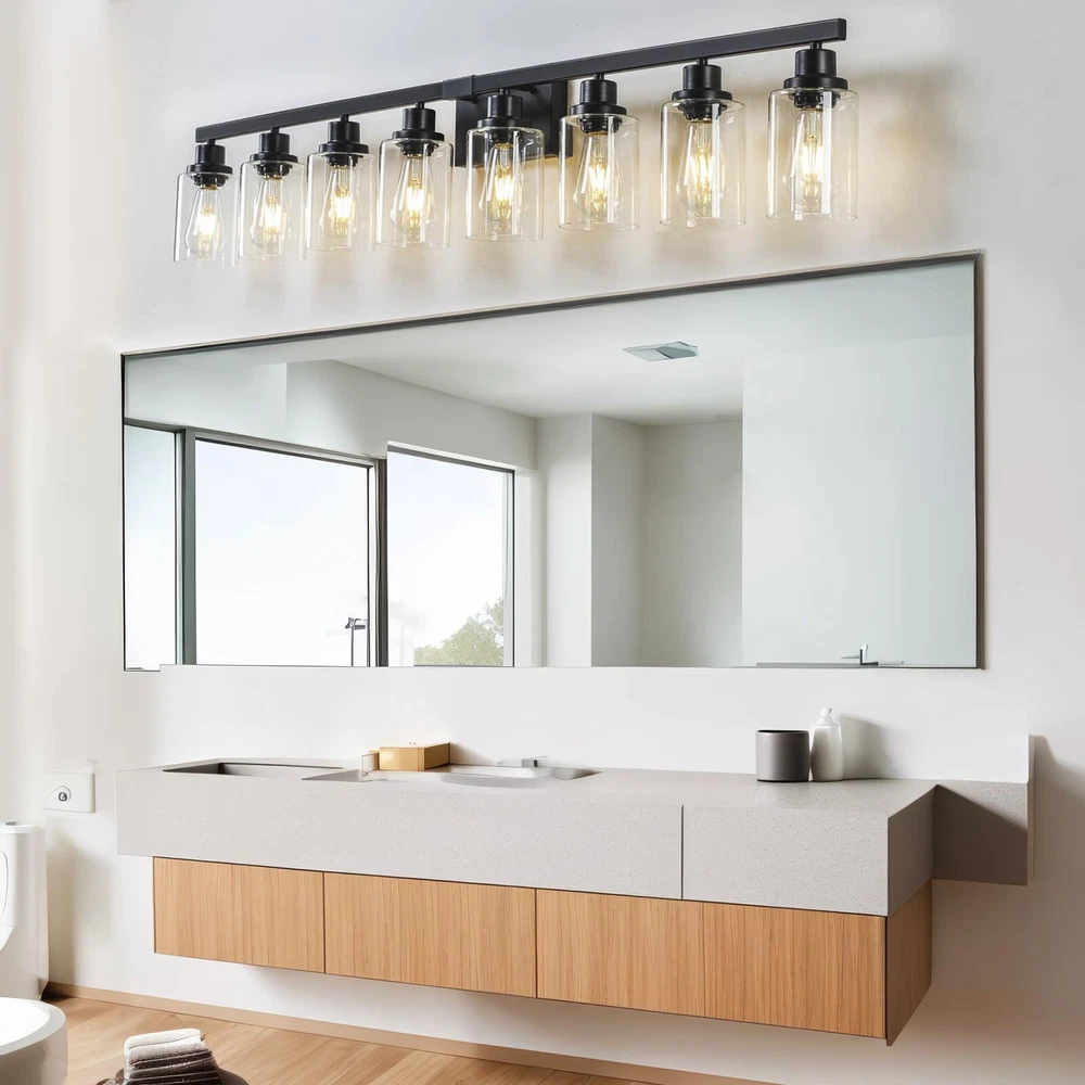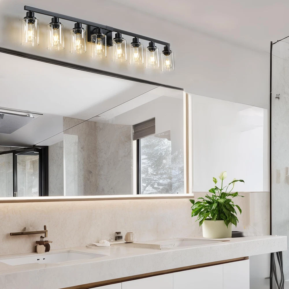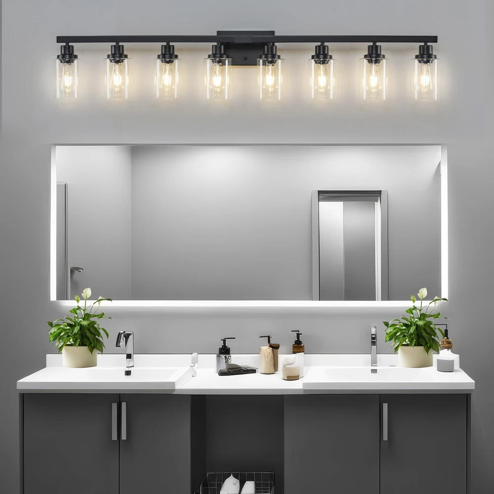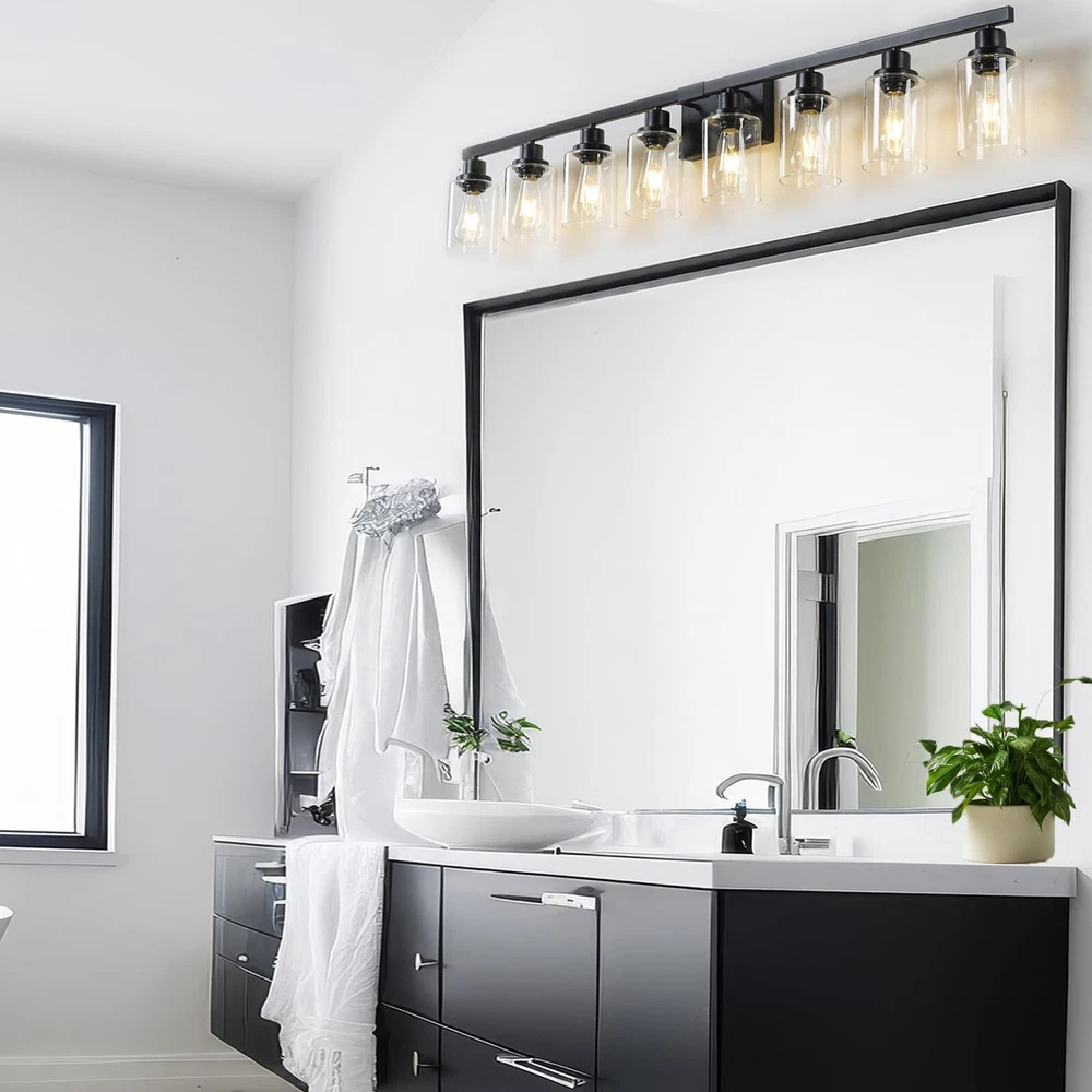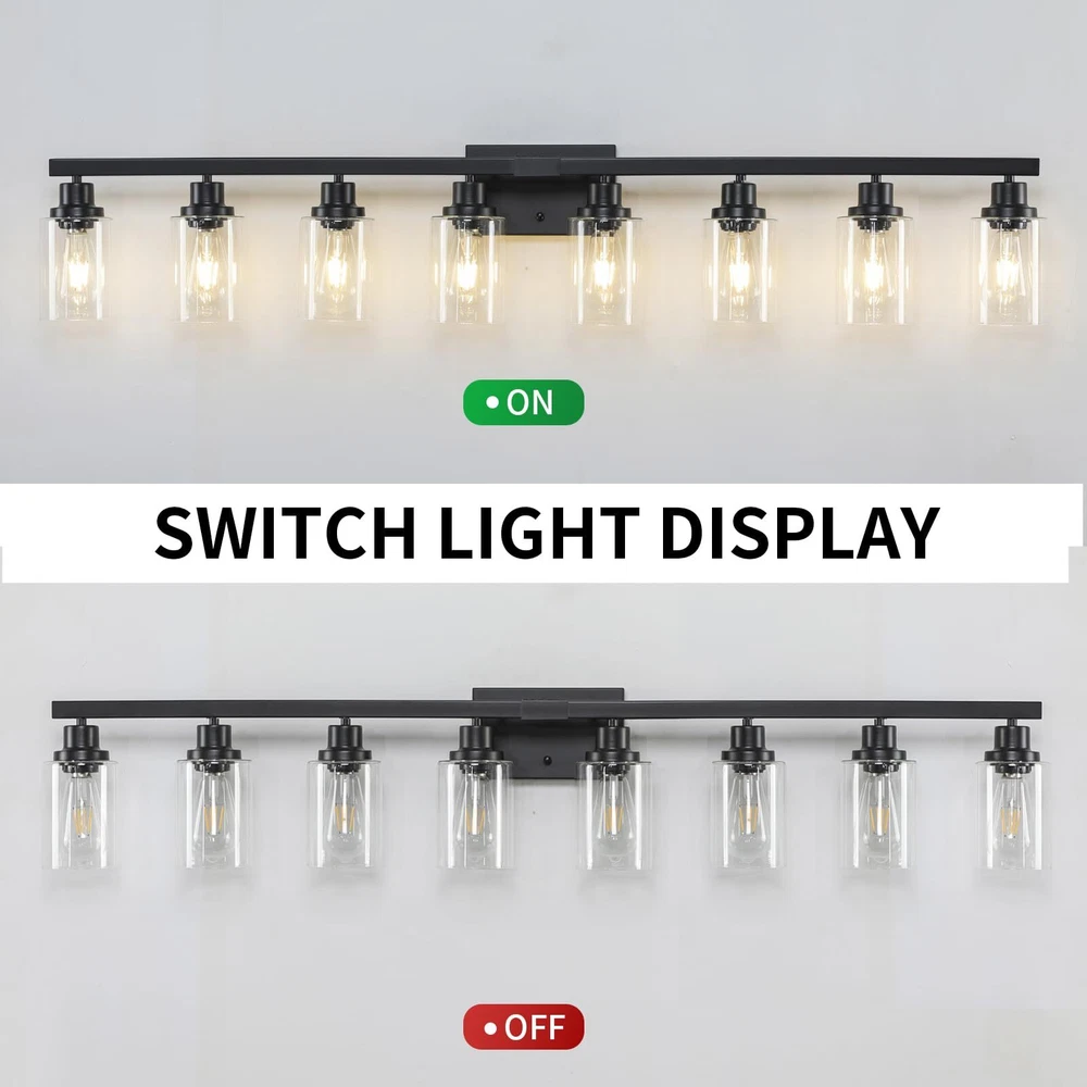Sturdy Metal Construction: 8-Light Bathroom lighting fixture is made of sturdy metal in a matte black finish with no need to worry about oxidation and color fading. Additionally, High-quality clear glass shades will protect the bulb maximize its light, and increase the classic ambiance in any space. The bathroom vanity light perfectly fits any style. It will bring more exquisite and luxury to your home lighting E26 Heat-Resistance Base and Fantastic Size: Bathroom vanity light size 51.18''x 5.74''x9.05''. Black Bathroom vanity light compatible with any E26 base bulb (Incandescent, CFL, halogen, LED bulbs suitable, Max 60W for each bulb, Not included). The wall light is fully dimmable when used with a dimmer bulb and switches(not included) so that you can choose different style bulbs and control desired brightness Modern Wall Light-Black Vanity Light: Wall mount Lamp can be mounted facing upward or downward to suit your needs, no matter how can emit aesthetic and ample glow to create a beautiful lighting atmosphere. Have an excellent idea for your bathroom mirror or bedroom, living room, dressing table, vanity table, mirror cabinets, doorway or entryway, corridor, or foyer Easy Installation-Bathroom Light Fixtures Over Mirror: Farmhouse matte black bathroom light fixture, wall-mounted and hardwired design. All mounting hardware required for installation is included in the package, just need to connect the wire and assemble the shade only. Perfect bath wall decor for bathroom over the mirror, vanity, closet, foyer, stairs, and art display. This bathroom wall lighting fixture comes with an open bottom, which allows you to change bulbs(E26 Base)easily We Are Here: Bathroom Vanity Light x1, Accessories x1, Instruction x1. provides customers with service for 24 MONTHS. If you have any problems with our bathroom light fixtures, please notify us via the Amazon message box, and we will reply within 24 hours. (If glass shades were broken, we will ship you a new glass shade) Thanks