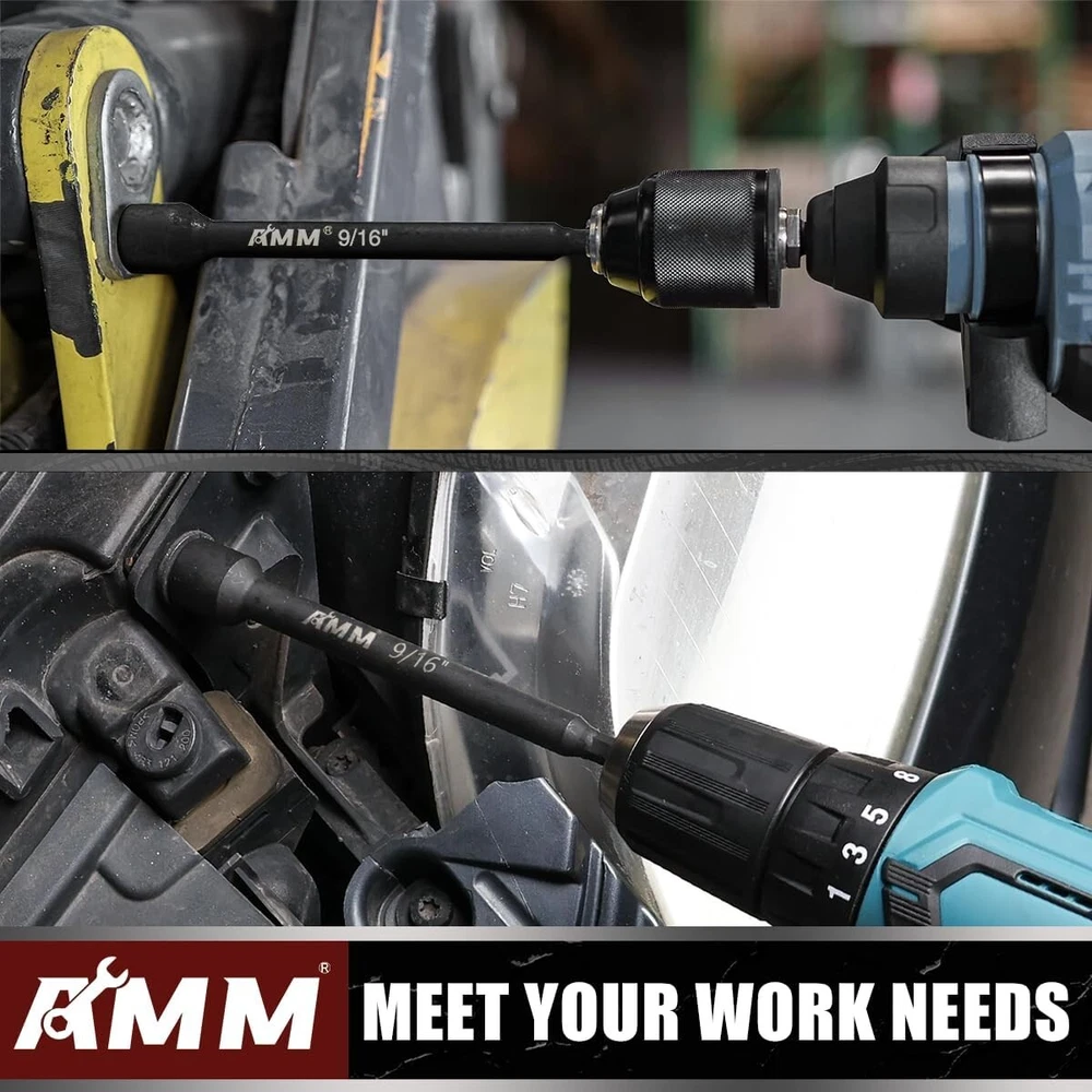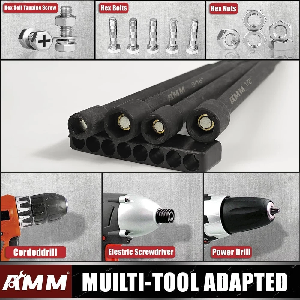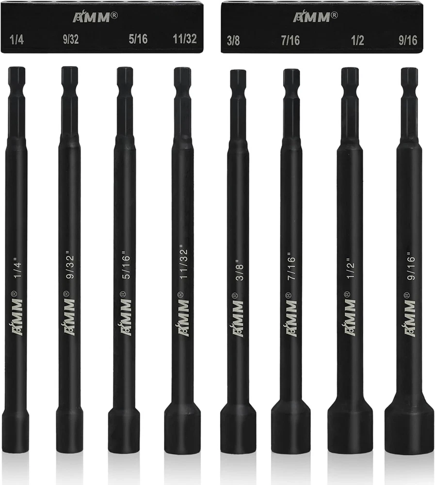8PCS SAE Magnetic Nut Driver Set for impact drill, Long Nut Drivers 6 INCH (1/4" - 9/16"), 1/4” Hex Shank Nut Driver Bit, Cr-V Steel VARIOUS SIZES: AMM 8 PCS SAE impact nut driver setter includes 1/4", 9/32", 5/16", 11/32", 3/8", 7/16", 1/2", 9/16" nut drivers with handy storage rails. BUILT TO LAST: The impact driver set is crafted from Cr-V steel with Black Phosphate Coating. This material ensures longer service-life, higher shock-resistance, and strong resistance to oxidation and corrosion. MAGNETIC EXCELLENCE: Each impact nut driver set contains a high-strength magnet and the nut driver bit set has a deep interior to keeps the bits securely in place while loosening or tightening nuts or bolts. By using gravity-pressed embedded magnets, there is no risk of the magnet falling off. EXTRA LONG 6 INCH: 6" long nut drivers provide easy maneuvering in narrow spaces and hard to reach areas. Each impact drill bit tool is laser-etched for easy identification. WIDELY USED: The impact nut driver set magnetic features a universal 1/4" hex shank for easy attachment to a variety of tools, including drills, electric screwdrivers, socket wrenches, pneumatic impact wrenches, cordless drills, and screw guns.