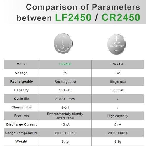 High-Performance 2450 Rechargeable Batteries Experience the next level of power with our advanced 2450 rechargeable batteries. Designed for efficiency and longevity, these batteries are perfect for a variety of devices. Key Features: Exclusive Patent: Utilizing cutting-edge technology, our batteries provide superior performance and longevity compared to standard disposable options. Stable 3V Voltage Output: Ideal for precision devices, these lithium rechargeable batteries ensure consistent voltage for medical equipment, key fobs, IoT sensors, and more—eliminating weak power fluctuations. Fast Charging: Minimize downtime! Charge from 0% to 80% in just 1 hour, with a full charge achieved in 2 hours—perfect for high-drain gadgets. Reusable & Eco-Friendly: Make a sustainable choice! Each battery supports over 1000 charge cycles, significantly reducing waste and saving you money. Certifications: Rigorously tested to meet CE, RoHS, UL, and IEC standards, ensuring safety for sensitive electronics with explosion-proof design. Upgrade your power solutions today and enjoy the benefits of reliable, eco-friendly energy!