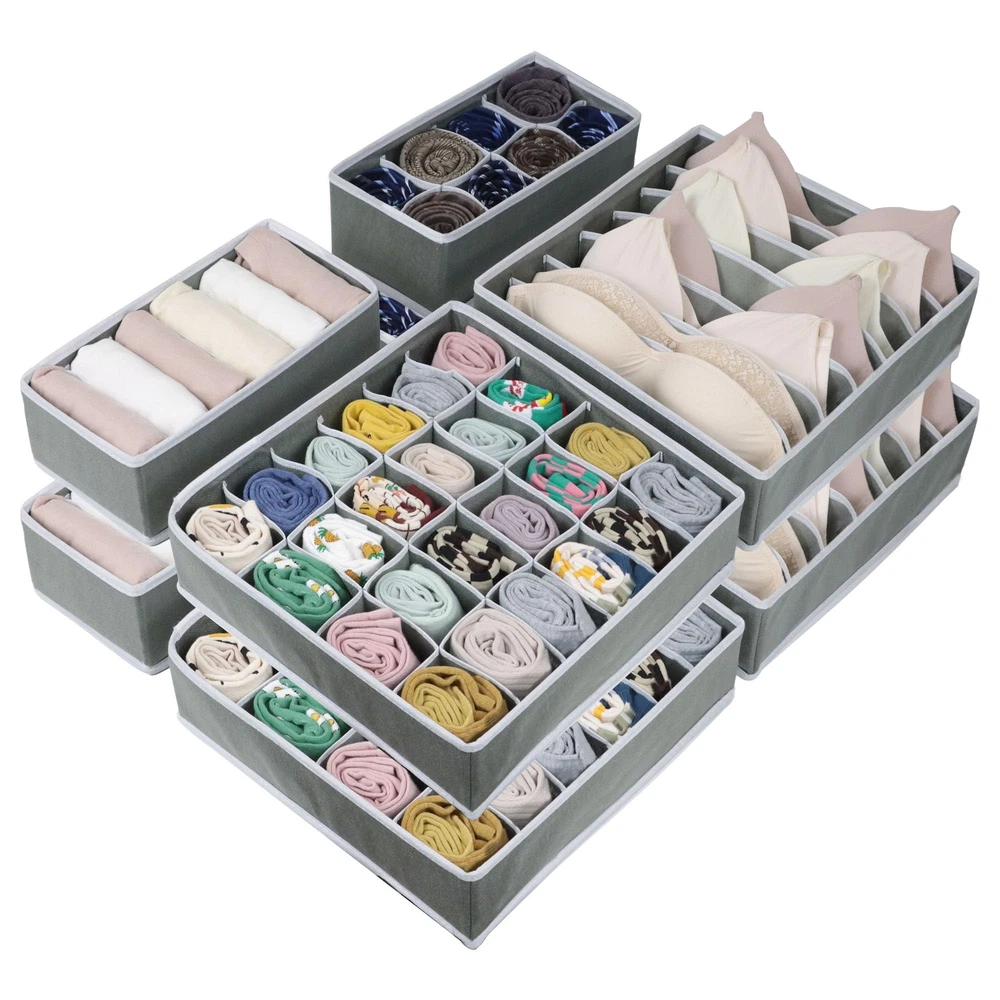 【MULTI USES CABINET ORGANIZER】Our drawer dividers are very suitable for wardrobe/ drawer/ table/ closet/ dresser and can underwear, bras, ties, socks, belts, scarves, t-shirts, towels, baby clothes, etc. Your closet and drawers won't be a mess anymore. 【DRAWER ORGANIZERS FOR CLOTHING】With our organizer bins, your drawer or wardrobe will be tidy and clean, greatly improving the utilization of your drawer space and helping you find what you want. This will greatly reduce the time spent searching for clothes. 【DRAWER ORGANIZER IN 4 SIZES】This 8-pack clothes organizer set includes 2 x 6-compartment T-shirt/underwear organizers, 2 x 7-compartment bra/scarf/belt/baby clothes organizers, 2 x 24-compartment sock organizers, 2 x 8-compartment tie/underpants organizer. 【FOLDABLE DRESSER ORGANIZER】The fabric drawer organizer is collapsible to save space when not in use, freeing up closet and dresser space for easy storage. When using them, just unfold them and zip them up the bottom. 【STURDY CLOSET ORGANIZERS】The dresser drawer organizers are made of breathable non-woven fabric, keeping the air flowing and clothes don't smell. This wardrobe dresser organizer with exquisite stitching is sturdy and can be reused for a long time. 【WHAT YOU WILL GET】8 pcs set: 2 x 6 compartment-11.03*5.52*3.94 inch/ 28*14*10 cm, 2 x 7 compartment-12.61*12.61*3.94 inch/ 32*32*10 cm, 2 x 24 compartment-12.61*12.61*3.94 inch/ 32*32*10 cm, 2 x 8 compartment-11.03*5.52*3.94 inch/ 28*14*10 cm, -year , and after-sales service.
