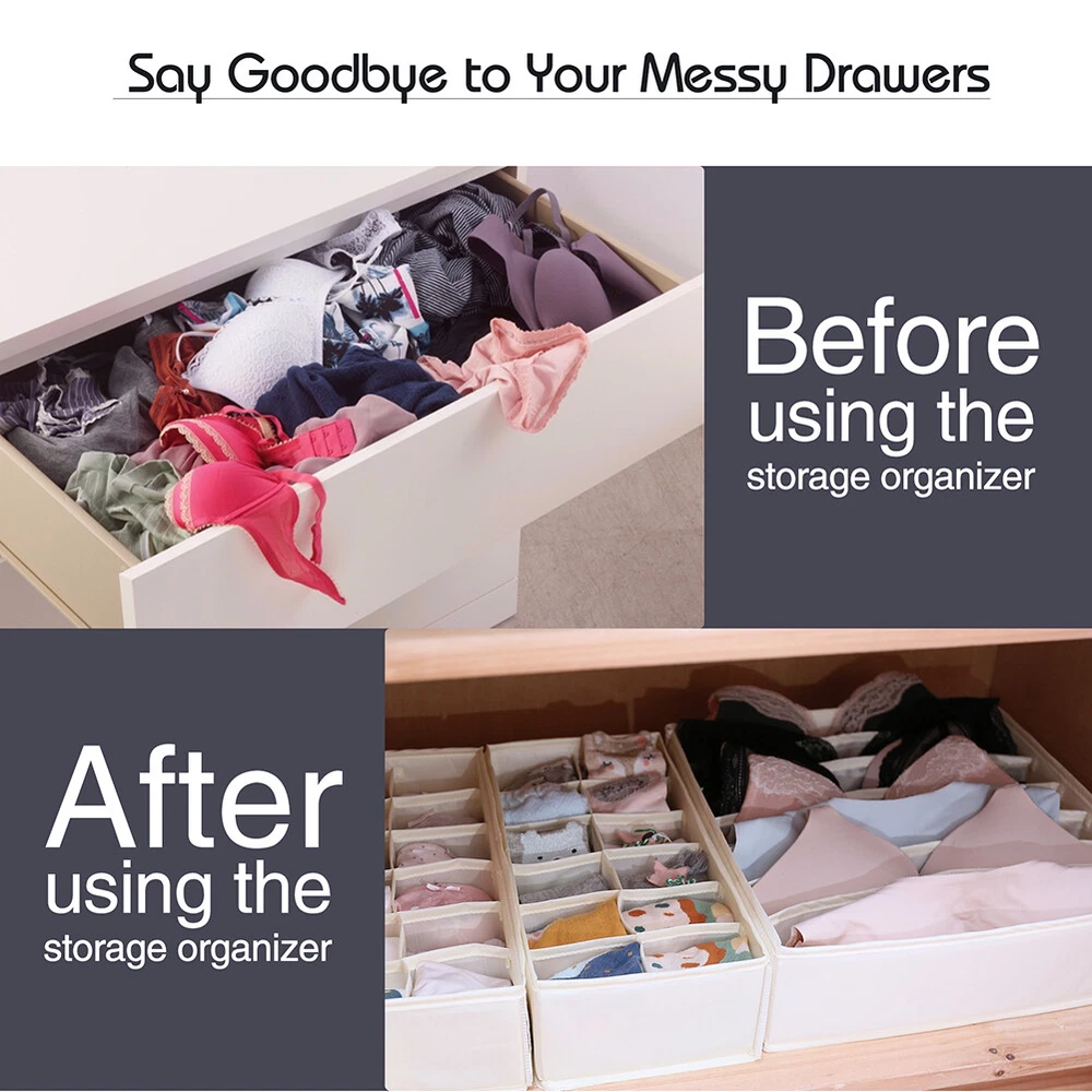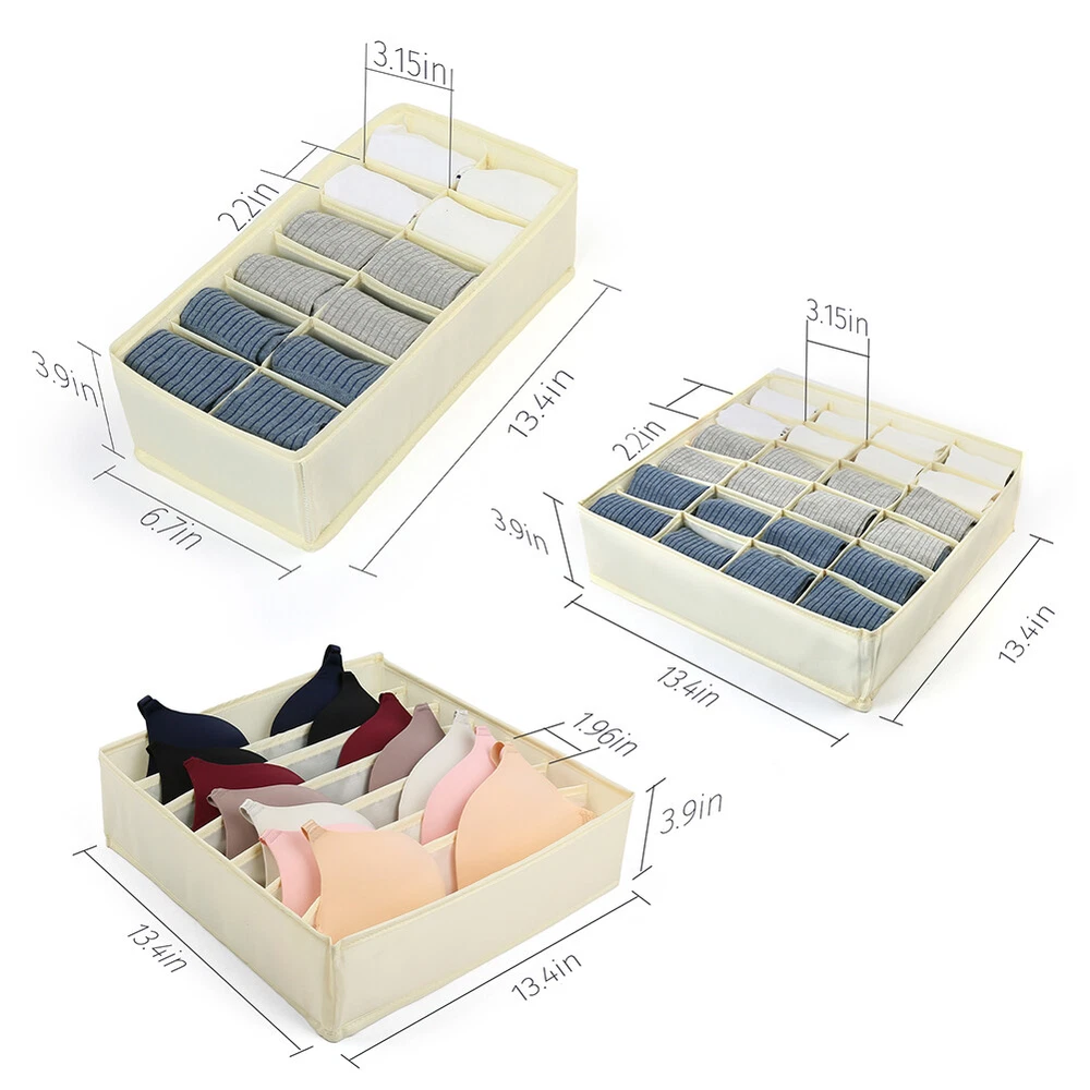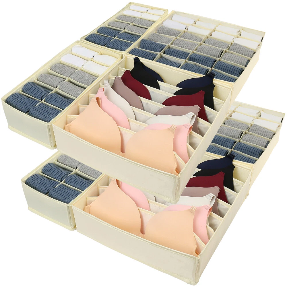 A Perfect Solution for Making Your Drawers or Closet Tidy and Neat 4pcs per set, 2 sets in total Specifications: Color: Beige 1 set contents: 1pc × 24 compartment bin(socks): 13.4”L×13.4“W×3.9”H ( 34 ×34×10 cm) 1pc × 7 compartment bin(bra):13.4”L×13.4“W×3.9”H ( 34 ×34×10 cm) 2pc × 12 compartment bin (underwear,briefs, ties):13.4”L×6.7”W×3.9”H ( 34×17×10cm) Premium Material Made of quality polyester fabric and PP plastic board inserts, our sock dividers are light, durable, water-proof, moisture-proof and high heat-proof. Foldable & Washable Our panty drawer organizers can be folded flat for easy storage when not in use. Wipe clean with a damp cloth and allow to air dry. Fabric frame can be machine washed if necessary. Easy to Assemble Our large bra organizers are designed with removable side panels and a bottom zipper, you can easily zip up the zipper, and insert the PP support board to finish assembly.