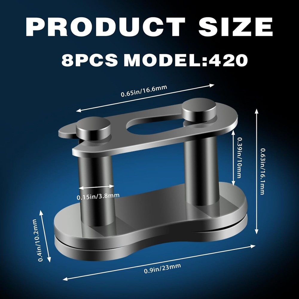 8 Pcs 420 Chain Master Links, Motorcycle Chain Connector, Master Link Replacement for 50cc-125cc ATV Quad 4 Wheeler Pocket Bike Description Our 420 chain master link set includes 8 pieces master links for 420 chian, which can fulfill your daily repair and replacement needs. Crafted from high-quality steel alloy, these 420 master links are wear-resistant, anti-corrosion, and anti-rust, ensuring long-lasting performance. Perfect for connecting the two ends of a 420 chain to form a closed loop, our 420 master links allow for easy removal and installation without the need for tools or complicated steps. Compatible with a wide range of motorcycles, ATVs, quads, scooters, go-karts, mopeds, pit bikes, dirt bikes, and pocket bikes that use 420 chains. Specifications: Material: Steel Alloy Size: Showed in the picture Packing List: 8 * 420 Chain Master Links Features: 420 Chain Master Link: The package includes 8 pieces of 420 chain master link, which can meet your needs of daily repair and replacement. High-quality Material: Crafted from high-quality steel alloy, our master links for 420 chain are wear resistant, anti-corrosion and anti-rust, ensuring a long-lasting service. Used to Join Existing Chain: Suitable for connecting the two ends of a chain to form a closed loop, our 420 master link allows for easy removal and installation of your existing chain. Easy to Install: It is easy to install the 420 roller chain master link to 420 chain by yourself. No tools needed and no complicated installation steps. Wide Compatibility: Our chain master links are compatible with 50cc, 70cc, 90cc, 110cc, 125cc motorcycle, atv, quad, scooter, go kart, moped, pit bike, dirt bike, pocket bike that uses 420 chain. Product Details: Package Dimensions : 2.8 x 2.01 x 0.59 inches; 2.4 ounces Item model number : CM-01 Manufacturer : Maodai Load Capacity: 5E+2 lbf Brand: Darlingao Material: Alloy Steel Strand Type: Single Handling We will ship all orders within 1 business day of payment. Delivery We Do Not Ship Outside of the Continental US. Return Policy All items qualify for returns within 30 days of receipt. Buyer is responsible for return shipping on any item that is not damaged. Feedback We take our reputation seriously, we buy and sell online, so we understand the value of trust. If you are unsatisfied with your order, please contact us and we will work with you to resolve it to your satisfaction.