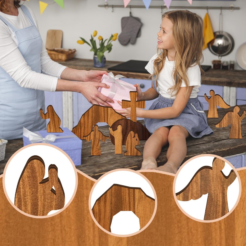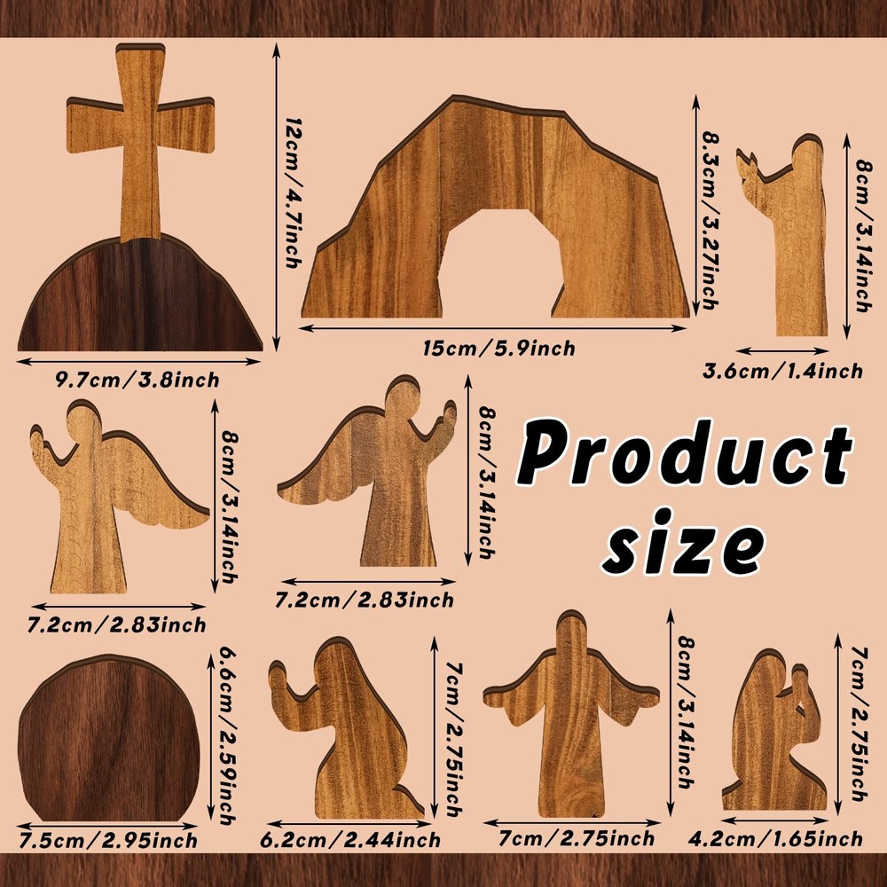 Features: If you're looking for a present that signifies the spirit of Easter, then look no further. the Easter religious decorations illuminate the key elements of the resurrection theme. Specifications: Material: main wood Color: wood color Size: as pictures shown Package includes: 8 x Easter religious decorations Notes: Manual measurement, please allow slight errors on size. The color may exist a slight difference due to different screen displays Easter Decor: you will receive 8 pcs Easter jesus symbols, ideal symbols for your Easter home decoration, exquisitely handmade and full of Christian resurrection meaning and atmosphere(excluding lights). Reliable Material to Use: the Easter resurrection scene sets are made of quality wood, feature simple and classical appearance, strong and reliable, not easy to break or deform, well polished and won't scratch your hands or furniture, so you can choose them with confidence Festival Highlight: The wooden resurrection scene set is a premium addition to your Easter home decorations , placing it on window sill, shelf, fireplace, or dining table, and making your bedroom, living room, or kitchen full of festive ambiance Trustworthy Quality for You: crafted from quality wood, this Easter scene wooden decoration is as robust as it is symbolic; The wooden material not only adds durability but also exhibits a rustic charm Meaningful Ways to Apply: these empty tomb Easter scene decorations are suitable for multiple locations in your home; Whether it's your living room centerpiece, mantelpiece, or dining table decor, these Easter pieces are a wonderful addition to your Easter decoration