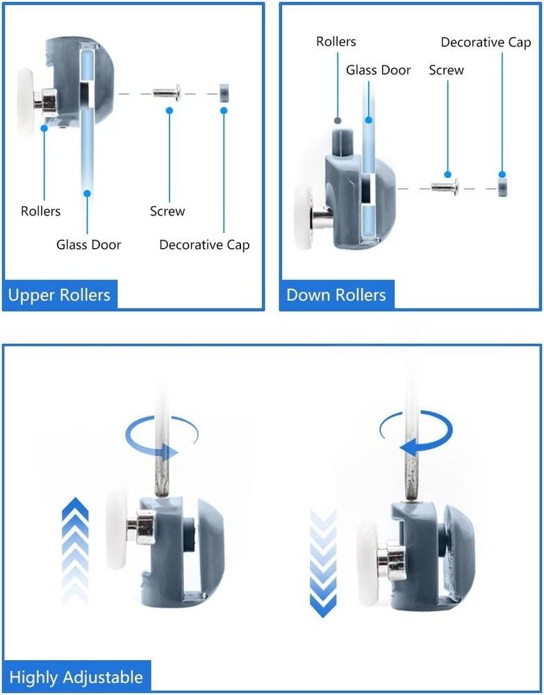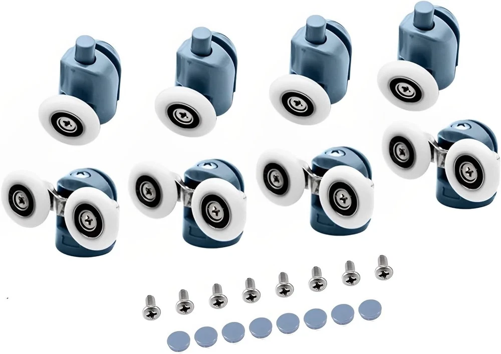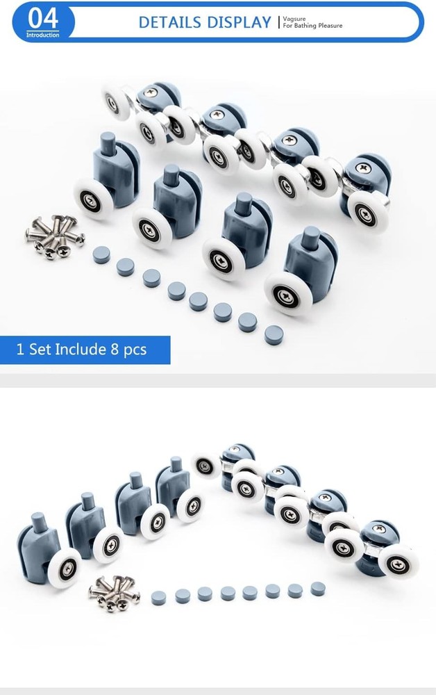 About this item Package includes: 4 double upper rollers and 4 single bottom rollers, in total 8 pcs Comes with screw cover caps. Spring loaded action can also fit curved showers. Designed with a nut and a plastic cover. Material: Plastic, Nylon, and stainless steel Diameter of the wheel: 23mm; Width of the wheel: 6mm. Minimum Hole size in the glass: 11mm. Maximum glass thickness: 6mm 8 pcs Double Shower Door Wheels Size: 2.36 x 0.79 x 0.79 inches