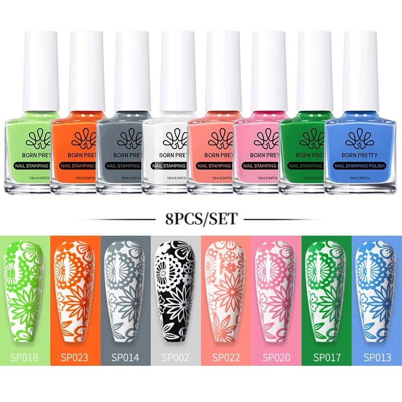 Type: Stamping Nail Polish Color: 8 Colors for Choose Quantity: : 8 Bottles Volume: Approx. 10ml Using Tools: Dry by natural, matched with Stamper&Scraper and Stamping Plates(not including) Package Contents: 8 Bottles 10ml BORN PRETTY Stamping Nail Polish Why Choose Our Nail Polish? Made of high quality material, the nail polish is of high pureness , making your nail with bright colors. Easy to apply, quick-drying. Special nail polish for nail art stamping and printing colors. Simple to use: Shake or stir very well before use. Comes with brush making nail art fast and easy for everyone. Allow you to create beautiful nail designs in short time. How To Use Our Nail Polish? Step 1: Apply the base gel and color polish on your nails. Step 2: Apply the nail latex. Step 3: Apply stamping polish on stamping plates. Step 4: Use scraper to scrape the excessive stamping polish. Step 5: Press the stamper quickly to pick up the pattern. Step 6: The pattern is completed and transfer on nail surface. Step 7: Peel off the nail latex and apply the top coat to finish the nail design.