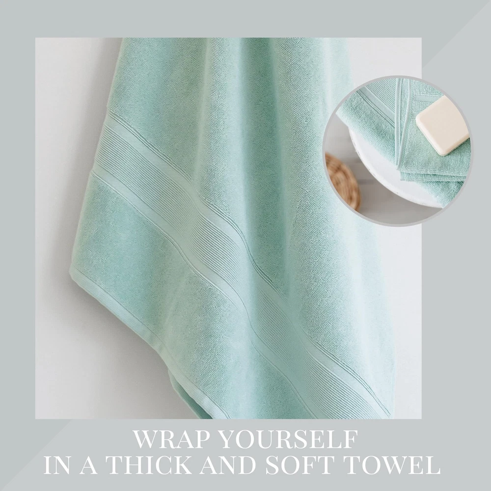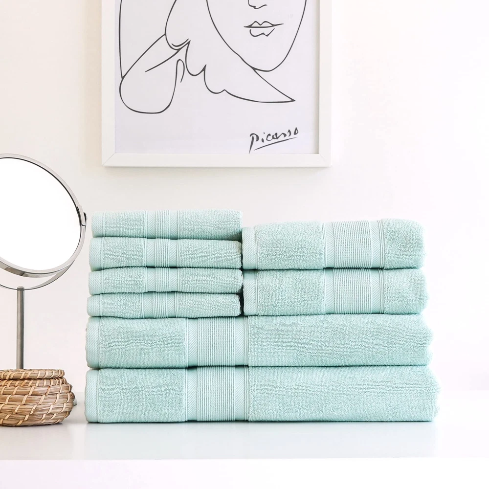 : Exceptional Blend of Comfort and Style - If you’re looking for stylish, top notch, practical and beautiful towels, is the one for you. These super soft, ultra-absorbent and extra plush towels are specially designed for your comfort. - towels are perfectly machine washable, easy to care and dry fast. They are always ready for your next shower. - All towels in the set are generously sized and they have a great softness without being overly heavy. - This 8-piece premium towel set provides a complete package of two bath towels (or bath sheets), two hand towels and four washcloths. - These towels are also great for morning routine, traveling, beach and poolside fun, or to use at gym or yoga studio. They can be a perfect gift for wedding, housewarming and holiday party. Fabulous Towels with Elegant Texture and Superior Feel - Turkish cotton is a premium long-fiber cotton grown exclusively in Turkey. The long fibers of Turkish cotton yield stronger and smoother threads than regular cotton. Using breathable Turkish cotton is one the secrets behind beautiful towels. - Turkish cotton towels are known for providing a perfect combination of both softness and absorbency – particularly those with a GSM of 600 like . Long staple cotton also made these classic Turkish towels very durable and long lasting. - Suggestions: Wash before use, gently cycle, machine wash warm with similar colors, tumble dry low, avoid contact with bleach and chemicals (that contain Benzoyl peroxide), do not use liquid fabric softeners. We Care About Our World - We are committed to protect the environment and make a positive impact wherever we can. - towels are sourced and manufactured sustainably and responsibly at ISO 9001:2015, Fairtrade and STeP by OEKO-TEX certified plants in accordance with the industry’s highest standards. COMPLETE 8-PIECE TOWEL SET FOR BATHROOMS & GIFTS: This towel set includes 2 large bath towels (30” x 60”), 2 hand towels (16” x 30”), and 4 washcloths (12” x 12”), offering great value. Ideal for families, guest bathrooms, vacation rentals, or as a perfect gift set. SOFT & ABSORBENT TURKISH COTTON TOWELS: Made with 600 GSM high-density Turkish cotton, towels are exceptionally soft, thick, and absorbent. Enjoy a spa-like experience at home with towels that are quick-drying, durable, and luxuriously fluffy. PREMIUM QUALITY DURABLE TOWELS: Engineered for longevity, our plush bath towels maintain their softness and vibrant color after repeated washings. These towels add a durable and stylish touch to your everyday bathroom essentials. MEDITERRANEAN-INSPIRED BATHROOM DECOR: Elevate your bathroom with our luxurious towels, available in a range of soothing and elegant colors inspired by the Mediterranean. These towels are designed to bring a stylish and calming vibe to any bathroom decor. LONG-LASTING LUXURY TOWELS: To ensure your towels remain plush and colorful, we recommend washing before first use. Machine wash in warm water with like colors on a gentle cycle, tumble dry low, and avoid bleach or liquid fabric softeners to maintain their premium quality and softness for years to come.