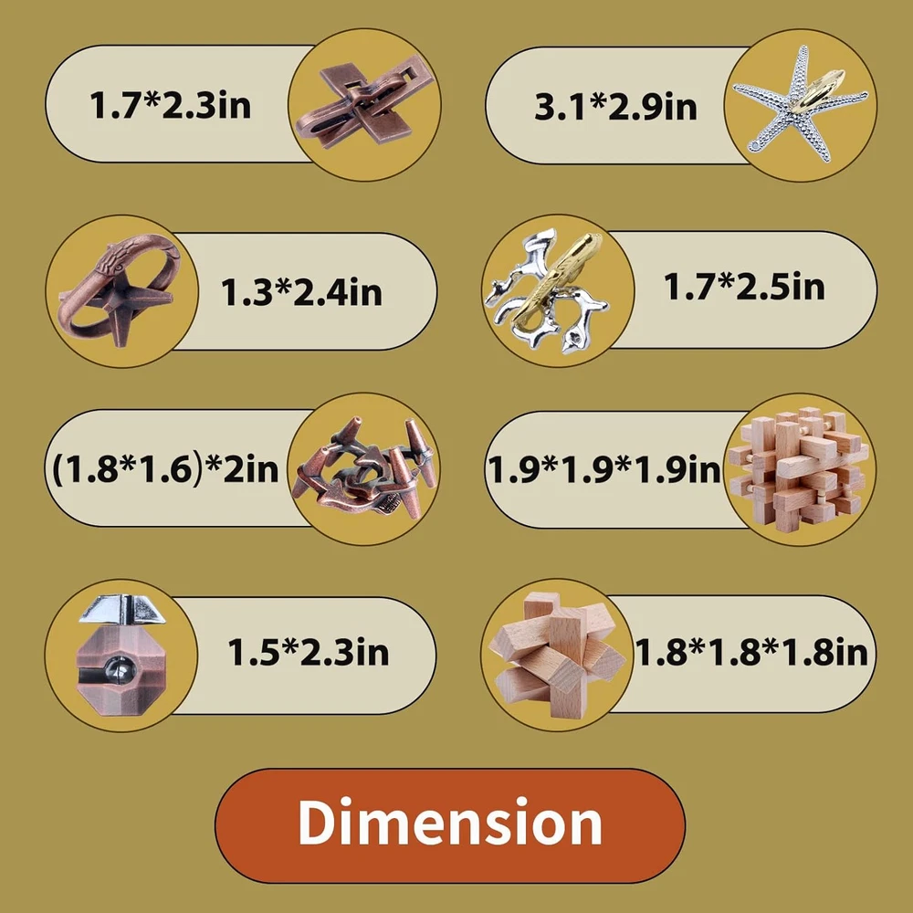 Menu Other Items Feedbacks About Us Contact Us Add To Favorites 8 Pieces Wooden and Metal Brain Teaser Puzzles 3D Education Toys for Adults and Kids IQ Logic Training Family Game Party Favor Coffee Table Time Unlock Interlock Mind Puzzles Box Brain Puzzles Game, 3D puzzles kits are smooth and not easily bend or break, durable and safe, easy to take everywhere you want, get them as a brain challenge, brain puzzles time are the good way to practice concentration and create your mind. It’s also a perfect way to relieve stress and keep your hands busying. Brain teasers benefit, engaging and fun for most ages, educational puzzle toys set will challenge your intellect by stimulating amazing creativity, and understand the inter structure. Mind will be sharpened enough to develop their problem-solving capacity through reasoning, development of mental stamina, and boosting their self-confidence, improve IQ and EQ. Puzzle time, enjoy puzzles brain teaser game time can avoid gadgets and electronics, passing time with meaningful games, learning with novelty idea, exercise dynamic brain skills. Cool puzzles gift for any occasions, perfect for Christmas gifts, office gifts, birthday gift, classroom rewards, stocking stuffer and kinds of anniversary. Everyone can play the puzzles comfortably and enjoy different level of puzzles challenge. Satisfy service, if you are not completely satisfied with your brain puzzles Toy, please feel free to . Let us know and we'll give you a satisfactory solution. Add it to your shopping cart now and enjoy yourself. Product Description Brain Teaser Puzzle Games Wooden Puzzles and Metal Puzzles Package Include Wooden Puzzle 2 PCS Metal Puzzle 6 PCS Instruction Sheet 1 PCS Store Bag 1PCS CAUTION Children must be used under the adult's tutelage and do not keep the toy in the mouth to prevent children devour small parts of the toy. Keep away from children and pets. Puzzle Games and Perfect Gift Play puzzle game with your friends or your family, enjoy puzzles entertainment passing time avoid gadgets and electronics. Puzzles box is a great gift for all occasions for Christmas gifts, office gifts, birthday gift, class rewards, stocking stuffer and kinds of anniversary. Item Specification Item Shape 3D Unit Count 8.0 Count Style CORAL STARFISH Number of Items 8 Age Range Description Kids, Teens, Adults. Educational Objective Logical Thinking Material Wood, Metal Puzzle Type Assembly and Disassembly Theme Adults and Kids Toys Package Type standard Skill Level Expert Play Activity Location Tabletop Manufacturer Minimum Age (MONTHS) 96.00 Special Features Portable Number of Pieces 8 Item Dimensions L x W 5.5"L x 5.1"W Included Components stock bag Dimensions Shipping Returns Additional Info Product Dimensions: 5.1 inches x 5.5 inches x 2.1 inches. Weight: 1.26 lb Fast shipping is very important for us. Our standard shipping service is FREE. Your order will be shipped within 1-3 business days upon full payment received. Most items are delivered within 3-5 business days, however, please allow 3-10 business days. We are shipping only to USA. We only ship to the confirmed Paypal address. We reserve the right to cancel any order for any reason at any time. We are not responsible for undeliverable addresses. We offer a 30 day return policy from checkout winning date. Your satisfaction is guaranteed! If for any reason you are unhappy with your item, just return it within 30 days for a full refund, minus shipping cost. Please contact us prior to initiating a return so that we can issue you a refund authorization. Items defective upon receipt must be packaged in their retail packaging as if new and returned with a detailed description of the problem. Return shipping fees are not refundable. We reserve the right to decline any returns if the above guidelines are not followed. All of our items, unless otherwise stated, will only run on 120 volts. Please check to make sure your country complies with these specifications. If you have a problem or question regarding your transaction please contact us before leaving any type of feedback. We will work with you to resolve any problem you may have.