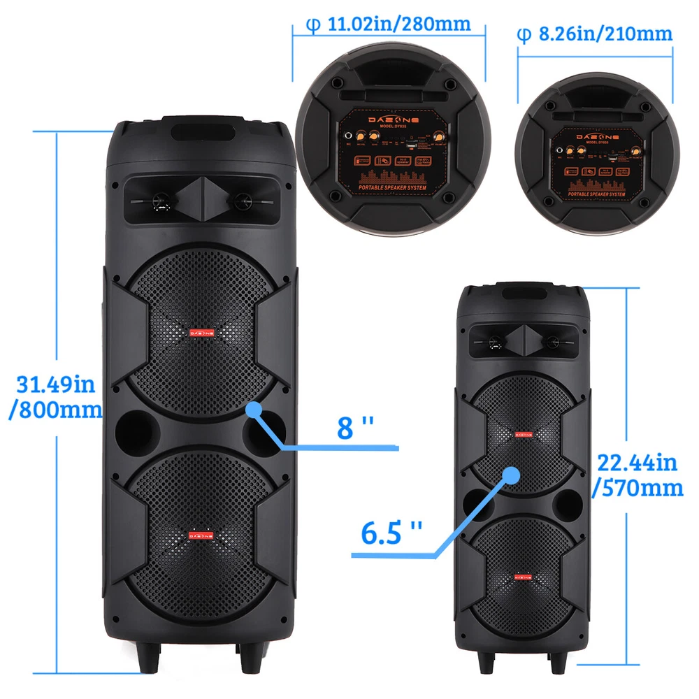 8'' Portable Bluetooth Speaker Sub woofer Heavy Bass Sound Party System W/ Mic Features: 【Dual Speakers & Powerful Bass】The efficient woofer can produce deep bass, and even if the volume is turned up, the midrange and treble can remain loud and clear. 【Smooth Bluetooth Connection】Allows you to stream your favorite music directly from a smart phone, iPod, tablet, or any other suitable BT device within 10M/32 feet, without cables and without any hassle. 【 Additional Audio Source】When the Bluetooth device is not available, you can insert a flash drive or micro SD card, or connect to a 3.5mm audio device such as an MP3/MP4/5 player to play your favorite music. 【 Rechargeable Design】Built-in 3000mAh rechargeable battery can provide up to 5 hours of playing time. 【 Portable】The speaker has a heavy-duty top handle and a retractable handle. You can carry this speaker as you like to host a party anytime, anywhere. Specification: Audio Input:Memory Card/Bluetooth/FM/AUX Built-in Battery: 18650 li-ion battery Battery capacity:3000mAh Charging time: 5-8 hours Play time: 5 hours (fully charged) Input Voltage: AC 100-240V 50/60Hz Output Power: 20W Peak Watt: 1000w Speacker Size:8"*2/6.5"*2 Color:Black Package Includes: 1 x Dual 8"/ 6" Wireless Party Speaker 1 x Wired Microphone 1 x Charging Cable 1 x 3.5mm AUX Cable 1 x Remote Control 1 x User Manual Contact us: Payment: Shipping: Warranty Return Contact us: We have always been trying to provide the best service and reliable products for every customer, however, accident may happen sometimes, please contact us to resolve any issue before leaving a negative feedback. Payment: 1. All payments must be prepaid before shipping. 2. We only accept payment via PayPal. Please kindly check if you can do the payment via PayPal before placing an order. Shipping: 1. Item will be shipped same business day if paid 4 pm EST 1 pm PDT (except weekends and holidays) and shipped from US. 2. Orders from the United States will all be shipped out via starnding shipping or economy shipping. The shipment usually takes 3-7 business days(Saturday and Sunday excluded), if you need the item urgently, please contact us for detail before purchase. Orders from overseas will be shipped via DHL Express, 3-5 business days. 3. Local pick up is not available. Warranty . The warranty shall not apply to the following circumstances: a) Damage caused by undue wear&tear, misuse, improper installation or operation, neglect, accidents. b) Damage caused by natural disasters, flood, fire, lightning or pollution. c) If item was opened, any parts removed or repaired by any unauthorized person. Return (1).We stand behind our items and offer 60 days warranty. All items are in brand new condition unless specified otherwise elsewhere in the description. (2).All returns - defective or otherwise - have to be preauthorized. Please contact us to get an authorization and returning address before sending the item back.If an item is returned because of an undeliverable shipping address, buyer agrees to pay the cost for re-shipment. (3).Please note that If the return/replacement is not a result of our mistake (not defective or wrong item), the buyer is responsible for return shipping, as well as a 20 percent restocking fee. (4).Replacement or refund will be made upon receipt of the returned item. If you do not want to wait for the replacement, you can just reorder one and then send the first one back for a refund.