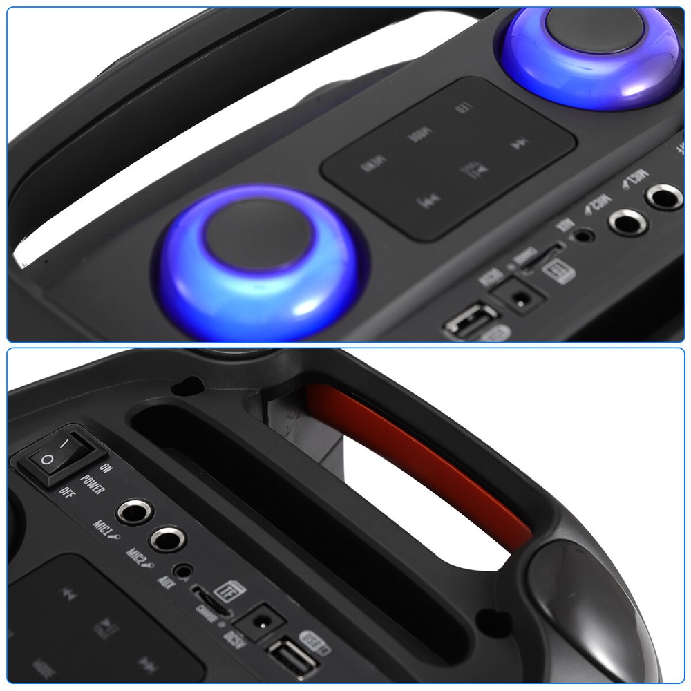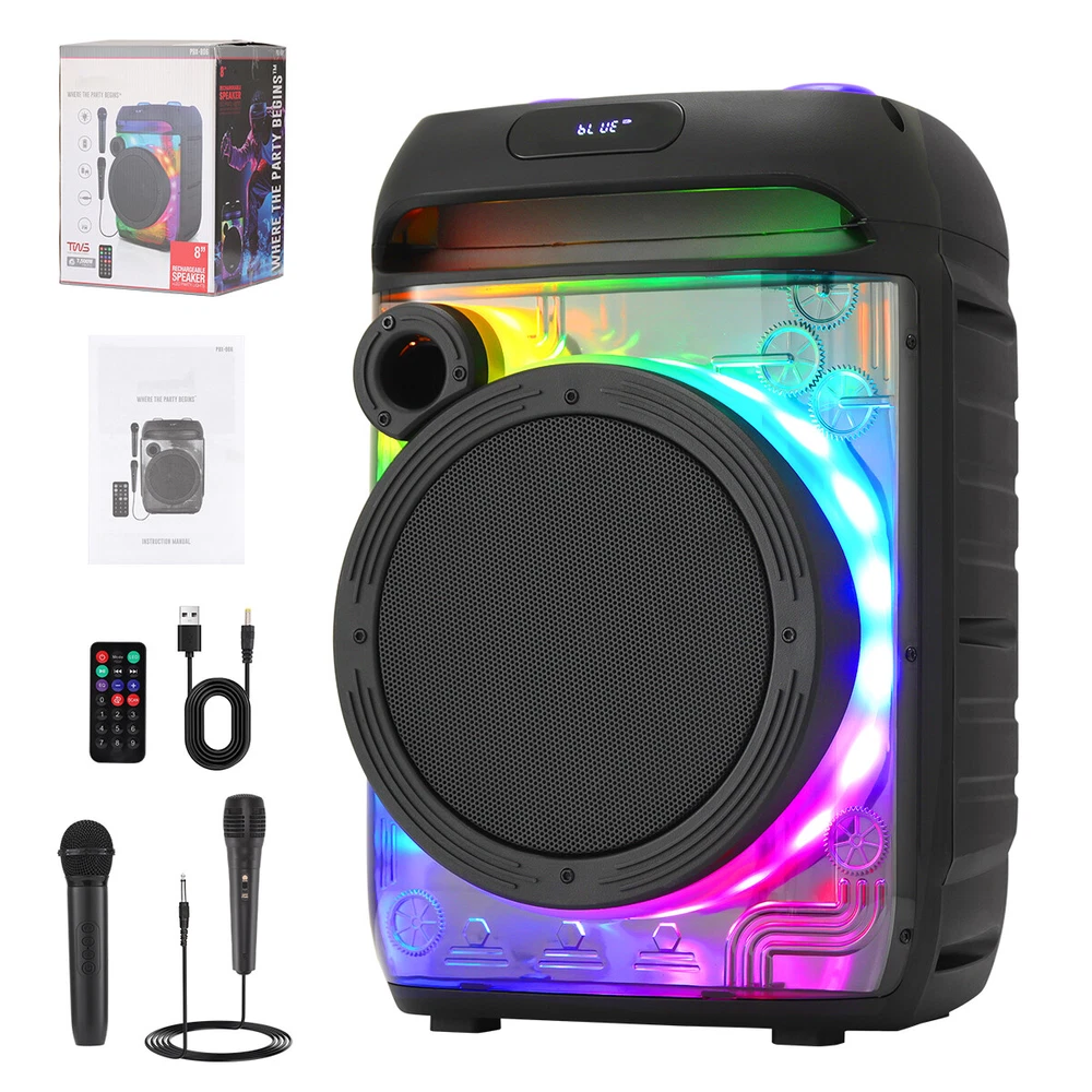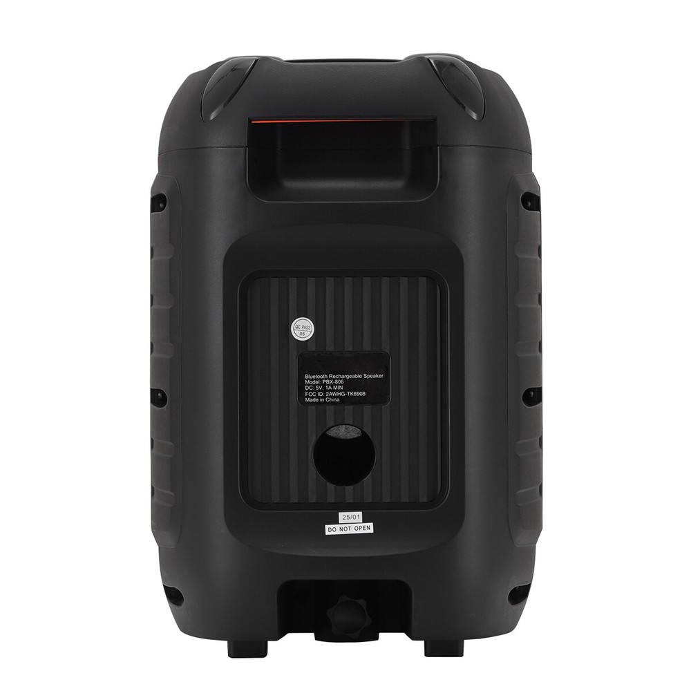 8" Portable Bluetooth Speaker Sub woofer Heavy Bass Sound System Home Speakers Feature: Material: ABS Color: Black Bluetooth name: PBX-806 Connection distance: < 10m Speaker: 8 inches Functions: USB, TF, FM, AUX, BT connection, TWS connection Input voltage: DC5v 1A Power (virtual standard) : 6000w Charge the red light on, full off Package Include: 1 X 8 "transparent mecha stereo 1 X Remote control 1 X Wireless microphone 1 X Wired microphone 1 X English instruction manual 1 X Ac adapter 1 X USB charging cable Contact us: Payment: Shipping: Warranty Return Contact us: We have always been trying to provide the best service and reliable products for every customer, however, accident may happen sometimes, please contact us to resolve any issue before leaving a negative feedback. Payment: 1. All payments must be prepaid before shipping. 2. We only accept payment via PayPal. Please kindly check if you can do the payment via PayPal before placing an order. Shipping: 1. Item will be shipped same business day if paid 4 pm EST 1 pm PDT (except weekends and holidays) and shipped from US. 2. Orders from the United States will all be shipped out via starnding shipping or economy shipping. The shipment usually takes 3-7 business days(Saturday and Sunday excluded), if you need the item urgently, please contact us for detail before purchase. Orders from overseas will be shipped via DHL Express, 3-5 business days. 3. Local pick up is not available. Warranty . The warranty shall not apply to the following circumstances: a) Damage caused by undue wear&tear, misuse, improper installation or operation, neglect, accidents. b) Damage caused by natural disasters, flood, fire, lightning or pollution. c) If item was opened, any parts removed or repaired by any unauthorized person. Return (1).We stand behind our items and offer 60 days warranty. All items are in brand new condition unless specified otherwise elsewhere in the description. (2).All returns - defective or otherwise - have to be preauthorized. Please contact us to get an authorization and returning address before sending the item back.If an item is returned because of an undeliverable shipping address, buyer agrees to pay the cost for re-shipment. (3).Please note that If the return/replacement is not a result of our mistake (not defective or wrong item), the buyer is responsible for return shipping, as well as a 20 percent restocking fee. (4).Replacement or refund will be made upon receipt of the returned item. If you do not want to wait for the replacement, you can just reorder one and then send the first one back for a refund.