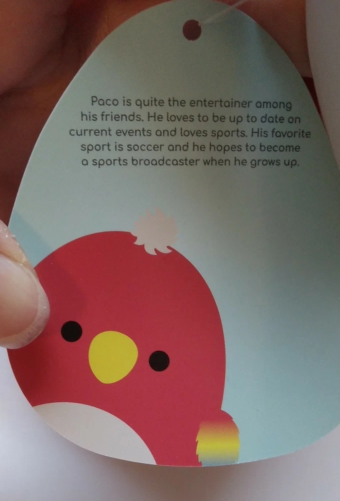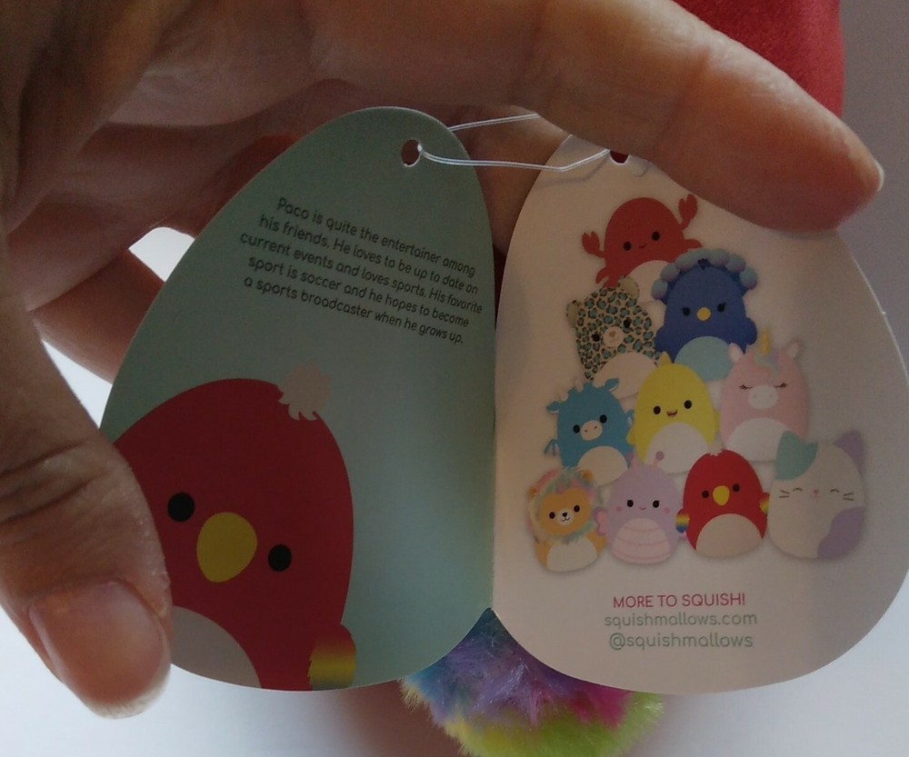 Absolutely love this adorable Squishmallows parrot! Paco is so soft, huggable, and the perfect size for cuddling. The vibrant colors and cute design make it a must-have for any plush toy collection. Super squishy and great quality—my new favorite!