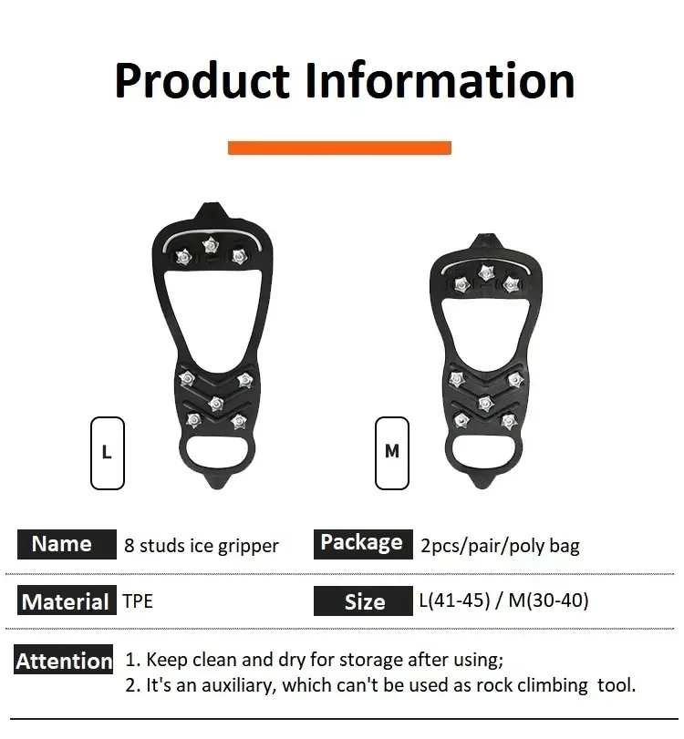8 Teeth Ice Gripper Spikes – Anti-Slip Winter Shoe Covers for Hiking & Climbing Stay safe and stable on icy surfaces with our 8 Teeth Ice Gripper Spikes . Perfect for winter hiking, climbing, snow walking, or everyday use, these anti-slip shoe covers provide superior traction and confidence on slippery surfaces. ❄️ Key Features 🛡 Durable Material Made from high-quality TPR with non-slip studs for maximum grip on ice. 👟 Easy to Wear Simply stretch the front over your shoe and secure the back to the heel. ❄ Anti-Slip Spikes 8-claw spikes ensure excellent traction and prevent slips on ice and snow. 👨👩👧👦 Universal Fit Suitable for adults and children; works for men and women. 🥾 Wide Compatibility Fits boots, sneakers, snow shoes, casual shoes, and dress shoes. 📋 Specifications Color: Black Material: TPR Size: L (EU41-45) High-Concerned Chemical: None Battery Included: No Electrical: No 📦 Package Includes 1 Pair of Ice Gripper Spikes 📝 Usage Instructions Place the front of the gripper over your shoe, then stretch the back over the heel. Use only on snow or ice to prevent premature wear of studs. After use, wipe clean with a dry cloth and store in a cool, dry place away from direct sunlight. ⚠️ Notes Manual measurement may cause 1–2mm size differences. Colors may slightly differ due to lighting or screen settings. Contact us first if any issues arise—we’ll resolve them promptly. 🌟 Welcome to bebestsofi! Thank you for choosing bebestsofi ! We are committed to providing quality products, reliable service, and a smooth shopping experience. Every order is carefully prepared and packed with care. 📦 Dispatch & Delivery (USA) 📬 Order Processing Orders are processed within 2–3 business days . 🚚 Standard USA Delivery Estimated delivery within 1–10 business days depending on location. 📍 Tracking Included All shipments include tracking for peace of mind. 🔒 Secure Packaging Items are carefully packed to ensure safe arrival. 🔄 Returns & Refunds ♻️ 14-Day Returns Accepted for faulty, damaged, or incorrect items. 💬 Easy Support Message us anytime for quick return assistance. 💯 Refund or Replacement Provided after inspection of returned items. 📩 Need Help? If you face any issue with your order, please contact us or drop us a message . We are happy to assist and will resolve concerns quickly. 💌 A Note from Us Your support means a lot to bebestsofi . We strive to provide great value, reliable service, and products you’ll love. Thank you for shopping with us! ✨
