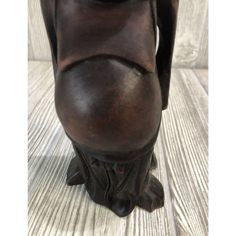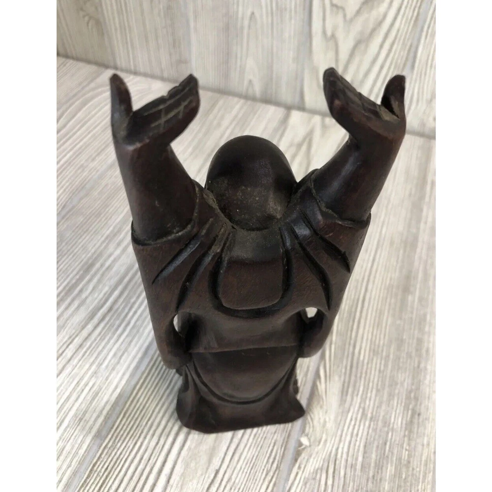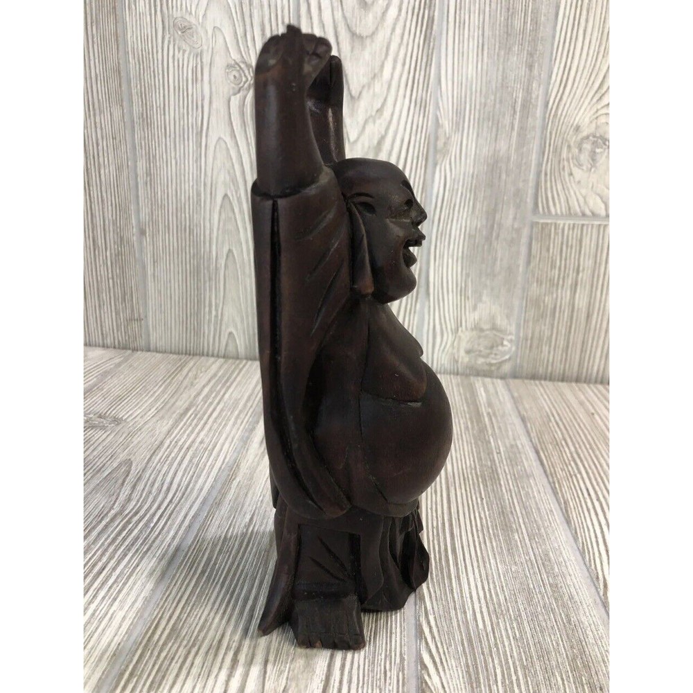 For sale is this 8" tall wooden Buddha statue. Vintage. Happy, Smiling Asian. Handcarved. Good condition, minor wear consistent with age and use. Chip on foot. See photos.
