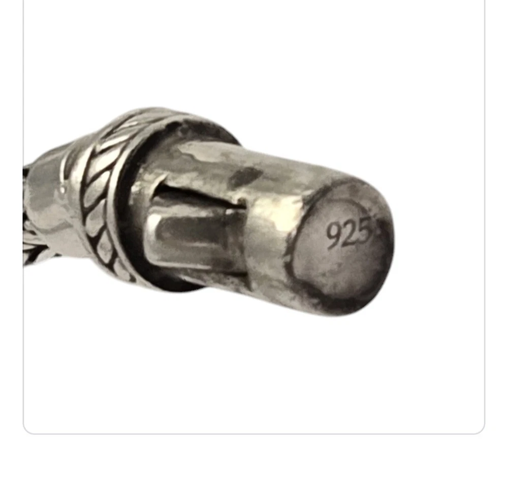Vintage Modernist Balinese Sterling Silver 5mm Wheat Chain Bracelet - 8"⅛ | Cut Leaf Centerpiece wheat chain bracelet that has a centerpiece depicting a bunch of cut leaves - and yes, there is openwork between the leaves. Thickness at the chain is 5mm (1/4"); at the center 7.5mm (or 5/16"). Weight is 30.5 grams. Condition is wonderful with a push button tab closure; good strong hold. Absolutely lovely with a designer look! The Rich Tapestry of Balinese Jewelry HistoryYou might have marveled at the intricate designs and fine detailing that Balinese jewelry pieces carry. These design details are not mere ornaments, they are a testament to the mastery of Indonesian artisans who have passed down century-old techniques through generations. Specialties like fine filigree work, granulation, and jawan are trademark elements in these pieces The artisans perform these operations faithfully according to age-old practices handed down over generations. These details transform each piece into a miniature artwork, resonating with the highly recognised quality and uniqueness of Balinese art. As you wear Balinese jewelry, you're not just donning beautiful accessories; you're carrying a piece of history and cultural identity with you. Both gold and silver pieces resonate with age-old traditions and a deep appreciation for abundance in nature. Balinese people see these precious metals as gifts from the earth's heart, infusing spiritual significance into each exquisite creation