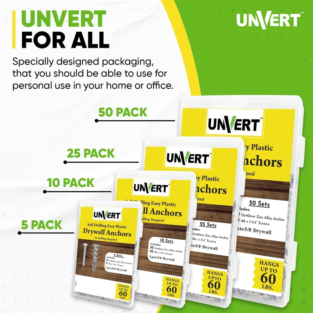 #8 Drywall Anchors and Screws Kit, Zinc Dry Wall for #8, Silver Description: Features: PREMIUM QUALITY: Investing in Unvert's drywall anchors is a must if you want exceptional quality that will last a lifetime. Say goodbye to the constant hassle of replacing cheap wall anchors by making the switch to high-quality heavy duty drywall anchors. Don't settle for less and make the smart choice for your home or business. The dry wall anchors and screws kit from Unvert is packaged in a convenient clip box that can be stored away for future use. AN IDEAL SOLUTION: Are you searching for sturdy wall anchors for drywall heavy duty to hang decorative plates, pictures, or shelves? Look no further than Unvert's self-drilling Zinc anchors. These drywall anchors heavy duty are suitable for a wide range of materials, such as drywall, concrete, brick, tile, plaster, stucco, and wood, making them a reliable and versatile choice for all your hanging requirements. EASY TO INSTALL: Our wall anchors for drywall heavy duty confidently supports a weight capacity of up to 75 lbs. and can be easily installed on a 3/8", 1/2", or 5/8" gypsum wallboard, with simple removal as well. Constructed with high-quality Zinc material, the anchor pairs perfectly with the widely-used zinc screw for long-lasting durability. These self drilling anchors screws are easy to install and meant to last. BUNDLE KIT INCLUDES: The dry wall anchors and screws kit consists of 5 Zinc anchors and 5 Phillips screws #8 x 1-1/4", making it a total of 10 pieces. Additionally, the drywall screws kit comes with a clear plastic organizer box that is visually appealing; making storage convenient. SHIPPING: We are always working hard to ensure your package arrives as soon as possible. Please understand that some factors like weather, high postal traffic, and the performance of shipping companies are outside of our control. We offer free shipping to the lower 48 states and ship within 3 business days of payment, usually sooner. We do not accept P.O. Boxes. Please provide a physical address. For shipping outside of the continental USA, we only use eBay's Global Shipping Program. The item is shipped to KY and then sent to the rest of the world. International customers are responsible for all duties and taxes. Continue to check out in order to calculate costs for shipping the item to your country. Messages regarding eBay's Global Shipping Program MUST be directed at eBay EXCLUSIVELY. PAYMENT: We accept payment by PayPal only (Can accept all kind of credit cards). Please pay as soon as possible after winning an auction, as that will allow us to post your item to you sooner. Payment must be received within 3 business days of auction closing. Before buying, please make sure your PayPal and eBay address is correct. If not, please correct it before payment. We have confidence in our products, but if you are not fully satisfied please contact us within 30 days of purchase and you will get full refund of your money. Return the product in the same condition you received it. Please note - return shipping will be paid by the buyer.