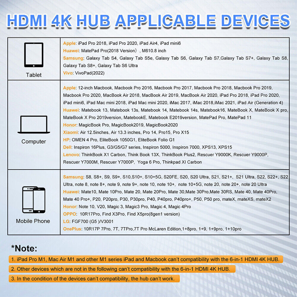 You may also like 8-Push 4-Pins Massage Chair Remote Control 6806 Compatible AM989 Massage Chair 63.8 USD 67.16 USD Free shipping 5% off 1080P 1x8 HDMI Splitter 1 in 8 Out, 8 Port Powered HDMI Splitter Multi Monitor 30.39 USD 31.99 USD Free shipping 5% off Car Cup Phone Holder 2in1 Car Cup Holder with Phone Mount, Cell Phone Cup Holder 13.29 USD 13.99 USD Free shipping 5% off Control Circuit Board Dashboard Assembly Set for Ninebot Segway ES1 ES2 ES3 ES4 28.49 USD 29.99 USD Free shipping 5% off Mini Fridge Stand Cart with Wheels - 220 LBS with Charging Station For Kitchen 59.99 USD Free shipping Waterproof Smart Bluetooth Fingerprint Padlock&keys Heavy Duty Locker Lock APP 46.54 USD 48.99 USD Free shipping 5% off 8 in 1 USB-C Hub Type C To USB 3.0 4K HDMI PD Adapter For iPhone Macbook Pro/Air Feature: -You can connect USB drivers, external disks to MacBook Pro, and other USB-C port equipped devices with this 8 in 1 Type C adapter. 4K HDMI-compatible video output, 1 Ethernet RJ-45 Port, 2 USB 3. 0 Ports, 2 Type C PD port, SD & TF card reader. It is also portable. You just need to slip this adapter into your bag for movies or business presentations on-the-go, etc. -4K 30 Hz or 2K 60 Hz displays are supported by the HUB HDMI-compatible Port. The Type-C to HDMI-compatible Adapter lets you extend the screen of your device and receive images in 4K UHD or full HD 1080P on HDTVs and PC Monitors or Projectors. -You can download more quickly and steadily when working or playing on the RJ45 Ethernet connection. Instant Ethernet is available at speeds of up to 100Mbps. -Three 3.0 USB ports to support transmission speed rates of up to 5 Gbps, which can connect to your smart phone, tablet and hard drive for effortless data transfer. -This product adopts cutting-edge heat dissipation technology to increase working life and provide superior performance, making it reliable and safe when 8 ports are used. Description: The 8-in-1 multifunctional Type-C HUB multiport adapter can solve the problem of a single device interface, and it can connect a variety of devices. The product is equipped with 4K HD dual-screen display, which can be connected to large-screen devices such as projectors, TVs, monitors, etc., and greatly improve office efficiency. Specification: Material: Aluminum Alloy Color: Silver HDMI-compatible Output Resolution: Up to 4K UHD Gigabit Ethernet: Up to 100Mbps USB-C Charging Port: Up to 60W Type: 8 in 1 USB C Hub Multiport Adapter 1 * 4K Ultra HD HDMI-compatible Port - Connect the device to the HDMI-compatible Port, your TV or computer or projector will deliver you 4K * 2K (3840 * 2160) high quality video and audio. Enjoying your big screen time. 1 * Ethernet - Max Ethernet speed 1000mbps. 1 * USB C PD Port - 3A/20V support max 87W power adapter. You can charge your phone faster while working. 1 * USB C Data Port - High Speed Power Supply Up to 4.5W Max. 1 * USB 2.0 Port- High Speed Power Supply Up to 4.5W Max. 1 * USB 3.0 Port - High Speed Power Supply Up to 4.5W Max. Supports USB flash drive, external hard drive, keyboard, mouse, printer, MP3 player etc. 2 * SD/TF Card Reader - SD/TF can work simultaneously. Read an werite speed depends on card's quality. Examples of compatible devices: Applicable to Apple MacBook, Huawei MateBook, Xiaomi notebook and Huawei P30, Mate20, Samsung S9, S10 series mobile phones. Laptop Support list: For Apple: 12-inch MacBook, 2016/2017/2018 MacBook Pro, Mac Mini/ 2018 MacBook Air For Huawei: MateBook13, MateBook, MateBook X, MateBook X Pro, MateBook E For Glory: MagicBook For Xiaomi: Air 12.5, 13.3-inch, Pro 15.6-inch, 15.6-inch GTX version, Xiaomi game book, Xiaomi game book 8th generation For HP:Pavilion x2, Spectre 13, EliteBook Folio G1, Envy 13 For ASUS:Lingyao 3, U306, U321 series, U4100, ROG series For Dell : XPS13, XPS15 For Lenovo : Xiaoxin Air 12 inches, Yoga5 Pro, Yoga900 13 inches, ThinkPad X1 Carbon 2017 For Samsung: NoteBook series, GalaxyBook series For Google : ChromeBook Pixels, PixelBook Pen For Razer: Blade Stealth Spirit Blade, Spirit Blade Stealth Edition For Microsoft : Surface Book2, Surface GO PC Support list: For Apple: 2018 11-inch iPad Pro, 2018 12.9-inch iPad Pro For Huawei: HuaweiM6 10.8 inch, Matepad Pro Mobile phone Support list:For Samsung: S8, S8+, S9, S9+, S10, S10+, Note 8, Note 9, Samsung Galaxy For Huawei: Mate 30, 30 Pro, 30 RS, Mate 20, Pro Mate 20X, Mate RS, P20/Pro, P30/Pro, P40/P40 Pro/P40 Pro+Mate 10/10 Pro For Glory: Note 10, V20 For Microsoft: Microsoft 950XL Microsoft 950 For OPPO: R17 Pro For LG: FGF70 (G5), V300L For One Plus: 7 Pro, 7T/7T Pro, 7T Pro McLaren Edition For Awl: Nut R1, Nut Pro 2S For Black Shark: Black Shark 2 For ZTE: Tianji 9 Package Content: 1*8 in 1 USB C Hub Multiport Adapter