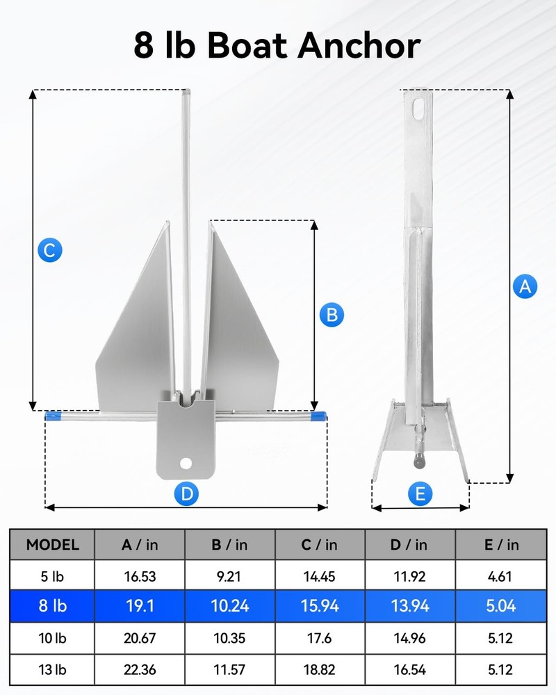 ► 8 lb Galvanized Fluke Anchor Kit Complete Boat Anchoring System for 12–22 ft Boats A reliable all-in-one anchoring solution designed for pontoons, fishing boats, dinghies, bass boats, and similar vessels between 12 and 22 feet. Perfect for lake days, coastal cruising, offshore fishing, and weekend boating trips. ✔ Fits 12–22 ft Boats Ideal for pontoons, fishing boats, dinghies, and bass boats Designed for vessels in the 12–22 ft range Suitable for lake, coastal, and nearshore use Provides dependable holding power for recreational boating ✔ Complete All-in-One Anchor Kit Includes everything needed for secure anchoring. No additional purchases required: (1) 8 lb Hot-Dip Galvanized Fluke Anchor (1) 6.5 ft Steel Anchor Chain (2) D-Ring Shackles (1) 100 ft Nylon Anchor Rope ✔ Strong Holding in Sand & Mud Fluke design digs deep into sand and mud bottoms Weighted chain improves anchor angle and grip Helps prevent dragging in wind or current Keeps your boat stable in changing conditions ✔ Hot-Dip Galvanized Steel Construction Rust-resistant finish Corrosion-resistant in saltwater and freshwater Built for long-term marine exposure Designed to withstand harsh environments ✔ Durable Nylon Anchor Rope 100 ft marine-grade nylon rope Excellent tensile strength Shock-absorbing stretch Soft to handle yet tough under load Provides flexibility and secure anchoring performance ⚠ Important Note Recommended for 12–22 ft boats under typical recreational conditions. Always verify proper anchoring technique and bottom conditions before use. On Apr 3, 2026 at 08:57:01 PDT, seller added the following information:
