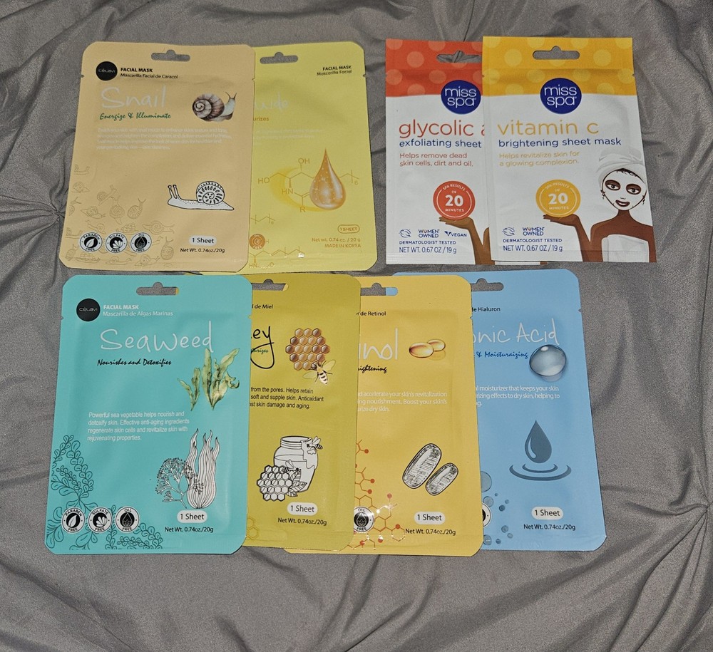 ☆ 8 x Sheet Mask Bundle- Korean Skincare- Snail, Seaweed, Ceramides + More • Celavi Seaweed Sheet Mask • Celavi Honey Sheet Mask •Celavi Retinol Sheet Mask •Celavi Hyaluronic Acid Sheet Mask •Celavi Snail Sheet Mask •Celavi Ceramides Sheet Mask ☆ Miss Spa Glycolic Acid Exfoliating Sheet Mask • Gentle acids help exfoliate dull skin for a fresh, revitalized complexion. ☆Miss Spa Vitamin C Brightening Sheet Mask • Infused with fruit acids rich in Vitamin C to help fade dark spots & reveal a brighter complexion. #skincare #koreanskincare #sheetmasks #sheetmaskbundle #bundle #celavi #missspa #retinol #Seaweed #honey #ceramides #Snail #honey #hyaluronicacid #glycolicacid #vitaminc
