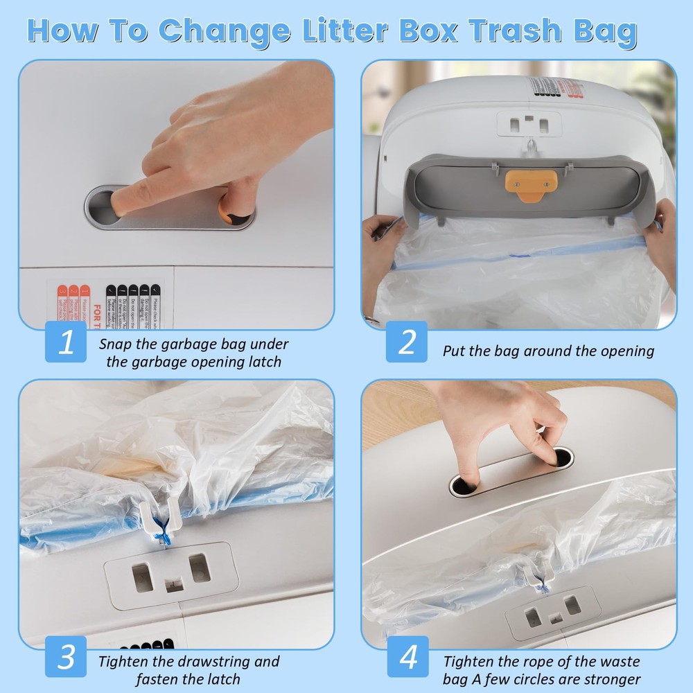 【18.2 x 18.2 inches】 This cat litter bag is only suitable for small-caliber self-cleaning cat litter boxes, and cannot be used for ordinary cat litter boxes. In addition, it is suitable for collecting other garbage, such as kitchen garbage, bathroom garbage and so on 【80 Counts/4 Rolls】 There are 4 rolls of cat litter bags in a box, a total of 80. If you change it twice a week, it will last ten months! 【Thicker and stronger】 This cat litter bag is specially designed for cat litter. The thickened material can effectively prevent cat litter from scratching the cat litter bag, and can prevent liquid from leaking 100% 【Drawstring Bags】 The rope-drawing cat litter bag can be suitable for many scenes, and it is convenient enough in the process of throwing garbage. 【Odour Removal】 The waste collection box is a separate module designed to isolate odors, and the device uses negative ion technology to neutralize odors, ensuring the indoor air remains fresh. All parts inside the machine are easily removable for hassle-free cleaning 【18.2 x 18.2 inches】This cat litter bag is only suitable for small-caliber self-cleaning cat litter boxes, and cannot be used for ordinary cat litter boxes. In addition, it is suitable for collecting other garbage, such as kitchen garbage, bathroom garbage and so on 【80 Counts/4 Rolls】There are 4 rolls of cat litter bags in a box, a total of 80. If you change it twice a week, it will last ten months! 【Thicker and stronger】This cat litter bag is specially designed for cat litter. The thickened material can effectively prevent cat litter from scratching the cat litter bag, and can prevent liquid from leaking 100% 【Drawstring Bags】The rope-drawing cat litter bag can be suitable for many scenes, and it is convenient enough in the process of throwing garbage. 【Odour Removal】The waste collection box is a separate module designed to isolate odors, and the device uses negative ion technology to neutralize odors, ensuring the indoor air remains fresh. All parts inside the machine are easily removable for hassle-free cleaning