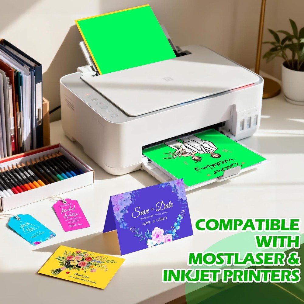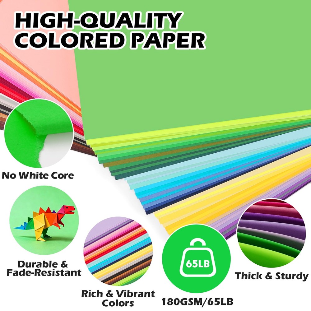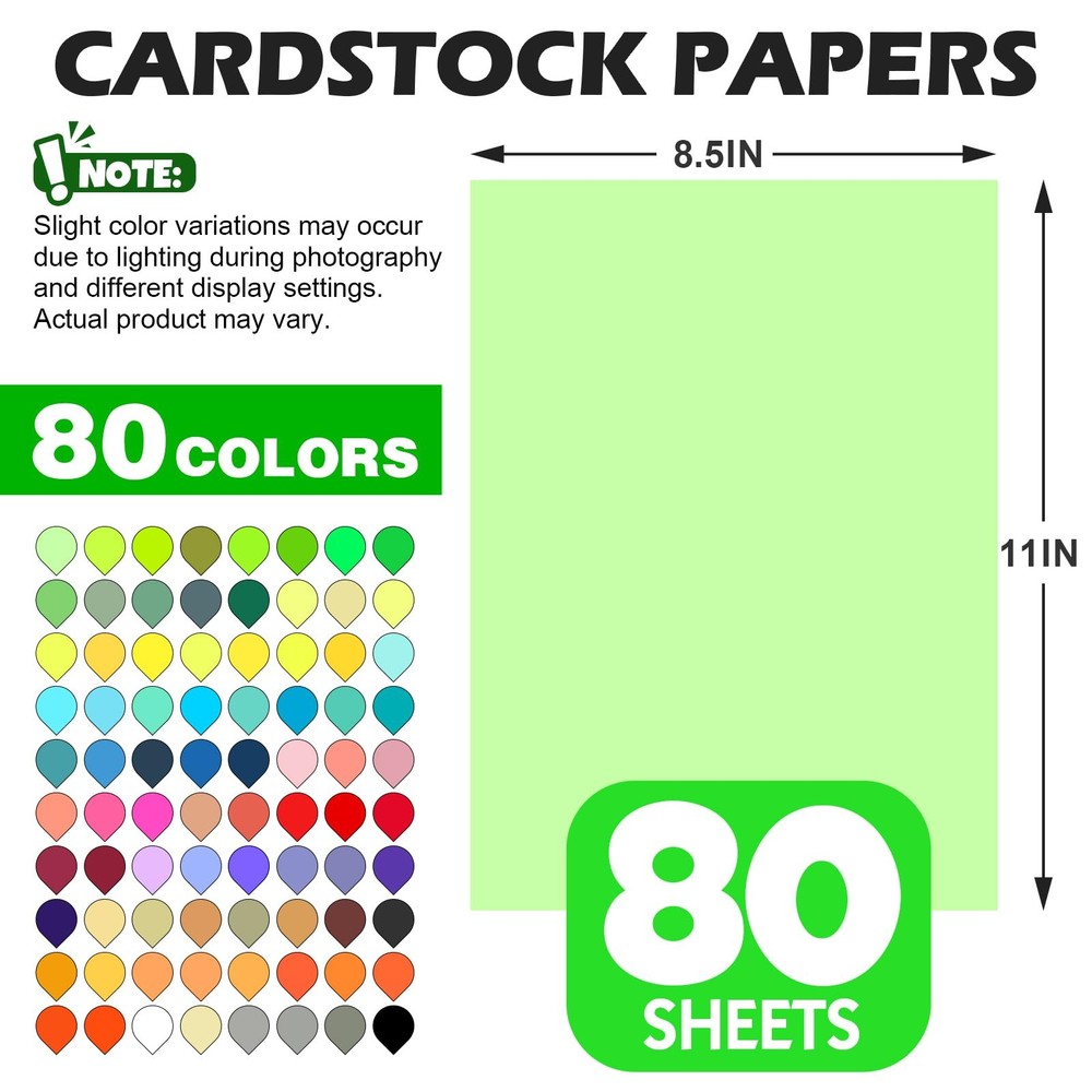 80 Sheets 8.5" X 11" Colored Cardstock, 80 Assorted Colors Construction Paper Card Stock Printer Paper for Printing, Card Making, DIY Crafts, Kids School Supplies,Party Decorations (180 GSM) 【Colorful Cardstock】:Our construction paper assorted colors 80 Sheets contains 80 beautiful and popular colors to meet your handmade needs. You'll get 1 sheets of each color, including:Pink, Light Yellow, Bright Red, Light Green, Light Blue, Lavender, Golden, Lake Blue, Light Olive, Light Gray, Black, Crimson, Wine Red, Forest Green, Royal Blue, Lemon Yellow, Parrot Green, Hot Pink, White, Fluorescent Green, Fluorescent Yellow, Hot Pink, Silver Gray, Wine Red, Scarlet, Fluorescent Orange, Lilac, Orange, Light Green, Fluorescent Vermilion, Lake Blue, and so on. 【Premium Quality】 – This paper 8.5 x 11 inch colored cardstock features a sturdy 180 gsm weight, ensuring compatibility with most laser and inkjet printers. Crafted from high-grade virgin wood pulp, it is acid-free and long-lasting, delivering vivid colors while reducing ink consumption—especially for full-background printing. The thick, durable paper resists fading and tearing, while its smooth, refined finish offers an exceptional printing and handling experience. 【Full Core Dyed Cardboard】:Our premium cardstock is dyed all the way through with no white core, so folds, tears, punches, and cuts always reveal rich, consistent color—never white edges. Perfect for flawless, professional-quality crafts every time. 【Versatile Crafting Paper】:Perfect for creating card toppers, cake decor, invitations, gift tags, party bunting, origami, scrapbooking, banners, and rolled paper flowers. Its adaptability unlocks endless creative projects—from festive decorations to personalized gifts. 【Wide Applications】:Our colored cardstock is perfect for teachers' school supplies and parents' home activities. The vibrant colors help children with color recognition, stimulate imagination, and develop practical skills. It's great for educational games, crafts, and as gifts for kids, students, adults, and art lovers. Additionally, colored construction paper can be used for decorations at weddings, anniversaries, birthdays, parties, and holidays like Easter, Valentine's Day, Halloween, and Christmas.