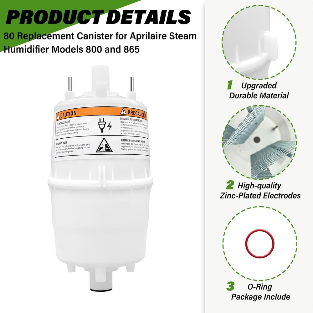 Store New Arrivals Add to Favorite View Feedback Contact 80 Steam Canister Replacement for Aprilaire Steam Humidifier Models 800 and 865 with O-Ring Seal (2 Pack) Description Item model number 800&865 replacement canister Room Type Bedroom, Living Room Capacity 0.75 Gallons Number of Items 2 Floor Area 5200 Square Feet Color White Operation Mode Manual Item Weight 1.87 pounds Shape Oval Voltage 220 Volts Model Name 80 Replacement Canister for Steam Humidifier Models 800 and 865 Special Feature Service Filter Indicator Product Dimensions 12.8"D x 6.5"W x 6.5"H Included Components Steam Canister, O-Ring 【Trustworthy 80 Replacement Canister】:The 80 replacement canister is made of durable and high-quality materials with the same fit, form and function, which is perfectly compatible with Aprilaire Steam Humidifier Models 800 and 865. Please use it with confidence 【Easy to Install and Save Money】:The 80 steam canister is easy to install and replace, so don't worry if it's too difficult for you to try. Please have a try with confidence! You can refer to Picture 5 for the installation procedure. You'll find the installation process simple and money-saving. But Most Importantly, please turn off the power after draining the water to ensure your safety 【Working Principle】: The steam canister is responsible for generating the steam that your humidifier then distributes throughout your home. Current runs between two electrodes within the canister, heating your water to a boil and creating steam that is distributed through your HVAC system. But because the water quality has everything to do with the canister's longevity. FOR OPTIMAL PERFORMANCE, replace canister annually 【Reliable Functionality】: The Aprilaire Humidifier can help you maintain an optimal humidity level of 40% - 60% in your home and create a comfortable living atmosphere, which can prevent dryness problems and promote skin health, help to relax tense nerves, reduce stress, improve mood and and slow down the aging of furniture 【Warm Tips】: You will receive two 80 replacement canisters with o-ring seals for Aprilaire Steam Humidifier Models 800 and 865. If you have any problems during the installation process, please contact us, we will reply to you and solve them in the first time Product description Installation Steps ABOUT US We offer the best prices around on high quality products. Our E-store includes media such as books, movies, music and games while offering electronics, toys, sporting apparel, clothing, tools, general home, garden items and more. SHIPPING We are always working hard to ensure your package arrives as soon as possible. Please understand that some factors like weather, high postal traffic, and the performance of shipping companies are outside of our control. We offer free shipping to the lower 48 states and ship within 2 business days of payment, usually sooner. We do not accept P.O. Boxes. Please provide a physical address. For shipping outside of the continental USA, we only use eBay's Global Shipping Program.The item is shipped to KY and then sent to the rest of the world. International customers are responsible for all duties and taxes. Continue to check out in order to calculate costs for shipping the item to your country. Messages regarding eBay's Global Shipping Program MUST be directed at eBay EXCLUSIVELY. RETURNS We offer a 30-Day Return Policy on items which you are not completely satisfied with. You have the option for a full-refund or an exchange of the item. No returns are available on items shipped outside of the USA. PAYMENT We accept PayPal. CONTACT US This page content is yet to come Please ad us to your favorite seller and visit again later Thank You CUSTOMER SATISFACTION We try our very best to make sure every customer is completely satisfied. If there's a problem, message us! We're happy to help. WE ACCEPT Copyright © 2021 AutoDS. | All Rights Reserved