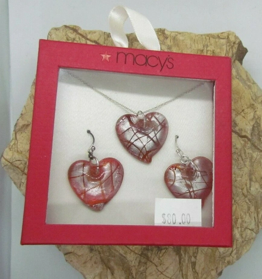 $80 Sterling Silver HEART GLASS Necklace Earring Set 925 New 18" Pendant