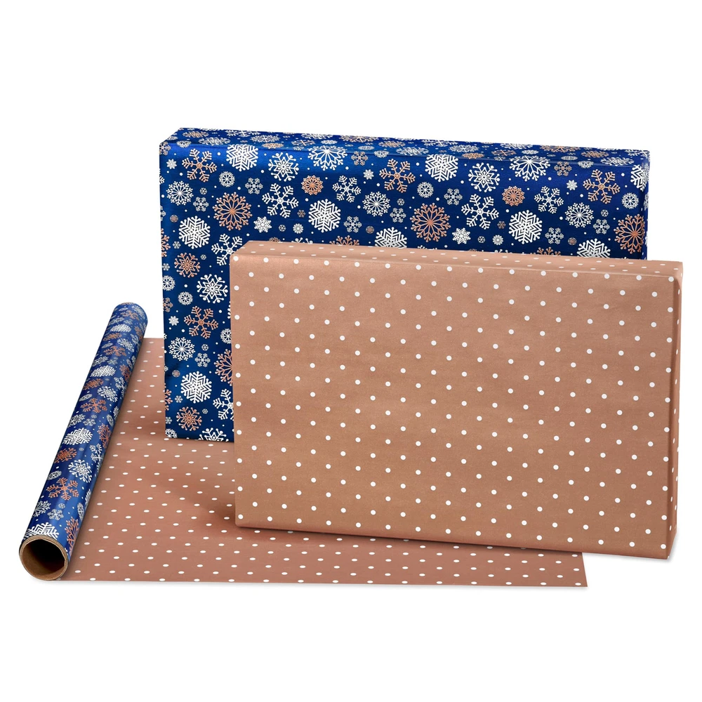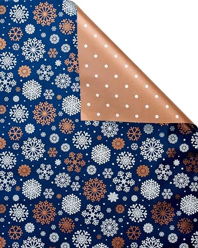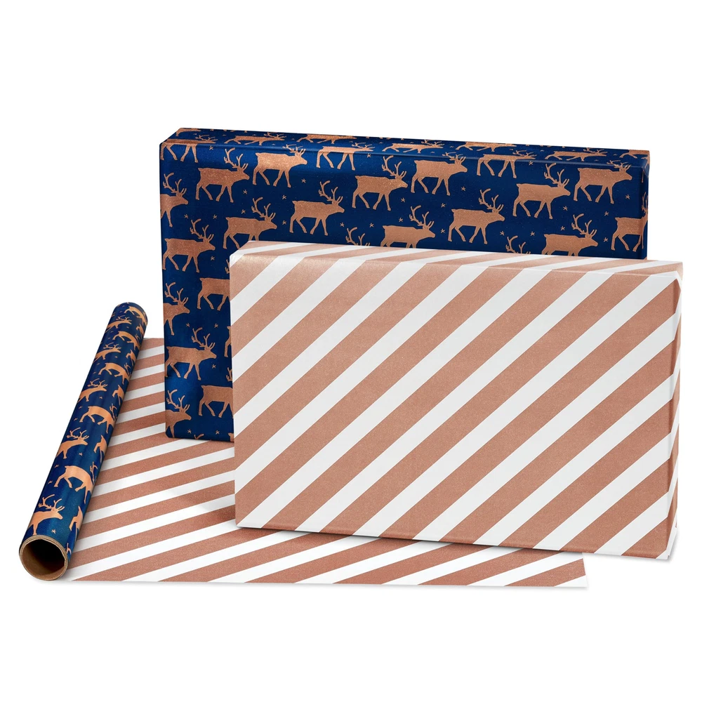 Wrap up your holiday gift wrapping with this 4-pack of reversible wrapping paper rolls. Each roll can wrap about 7 average-sized shirt boxes, so you’ll have plenty of room to wrap gifts of any size. And since each roll features coordinating designs on either side of its heavyweight paper, it’s easy to give your tree display some festive variety. offers exceptional greeting cards, gift wrap and celebration products so you can connect in ways that fit your personality and authentic style! Includes 4 rolls of reversible wrapping paper Each roll measures 30 inches wide by 8 feet, 20 total square feet. 4 rolls measure 80 square feet total. Each roll can wrap approximately 4 shirt boxes that measure 14.75 inches x 9.5 inches x 1.88 inches. The 4 roll pack can wrap 28 shirt boxes! Made with heavyweight paper that’s recyclable and assembled in the USA These navy and rose gold Christmas wrapping paper rolls have a metallic foil finish and features festive designs including reindeer, snowflakes, Christmas trees, stripes, polka dots and lettering with warm holiday messages. These wrapping paper rolls are the perfect gift packaging option with coordinating designs will add variety and style to your holiday Christmas gift wrapping! Perfect for wrapping Christmas gifts for family and more!