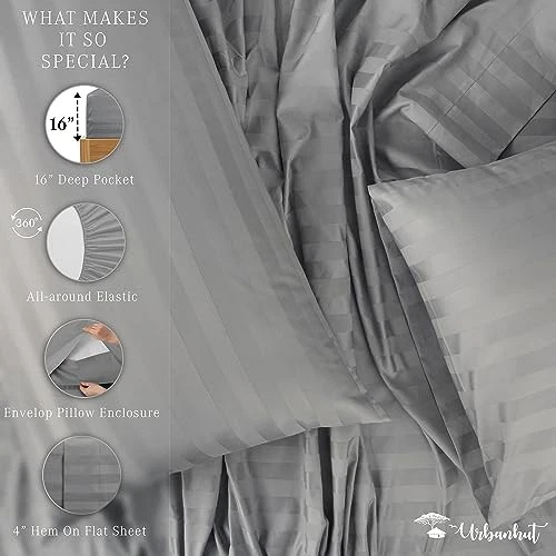 Return Policy Fast Delivery Trusted seller 800 Thread Count Egyptian Cotton Full Size Damask Striped Sheets Set (4 Pc) - Ultra Soft & Smooth, Thick & Crisp Sateen Weave Full Bedsheets, Fits Upto 16" Mattress - Dark Grey Product Description 100% PURE COTTON FOR PREMIUM COMFORT & SOFTNESS: Experience the luxury and silky-soft feel brought together by 800 threads woven per square inch with our premium cotton Full size sheets. These 800 thread count sheet sets are the perfect blend of breathability and durability, making them the ideal remedy for night sweats. 100% natural long staple cotton yarns are woven together using sateen weave to give you the ideal comfort and smoothness of 5-star hotel bedding. PERFECTLY FITTING SHEETS WITH ELASTIC DEEP POCKET: Snuggle up in these thick and soft 100 percent cotton sheet sets which keep you cool during summers and warm during winter. Each 4 piece Full sheet set has 1 flat sheet (84" W x 96" L), 1 fitted sheet (54" W x 76" L + 16" deep pocket) and 2 Queen pillowcases (21" W x 32" L). Sleep peacefully knowing your sheets are perfectly fitting the mattress and won’t bunch up in the night with our all-around elasticized deep pocket sheets. HIGH QUALITY & CRAFTSMANSHIP DELIVERED WITH EVERY SHEET: Urban Hut premium bedsheets resist fading and get softer with every wash, giving you a of comfort in just one buy. To provide you with utmost comfort, and durability, every sheet is measured and stitched individually. They also undergo thorough testing for various features like color fastness, minimum shrinkage, and no-pilling. We recommend a regular wash and short dry cycles to attain long-lasting, superior smoothness. ECO-FRIENDLY & ETHICALLY CRAFTED: Made from ethically sourced pure cotton known for softness and durability, our sheets are stitched with precision. Long fibers in our sheet sets create smoother, tear-resistant & pill-resistant bedding for comfort and longevity. We take pride in our eco-friendly processes, earning OEKO TEX certification for being free from harmful chemicals.. YOUR SATISFACTION IS IMPORTANT TO US: Along with superior comfort and luxury, our products also come with incredible customer service and 100% satisfaction . Gift them to your loved ones and family or simply add them to your stunning room decor and enjoy bespoke californian luxury with our high quality sheets. Shipping Returns Payment Shipping Shipping is FREE to all addresses other than APO/PO boxes in the lower 48 states. All our stock ships from US-based warehouses. Shipped via USPS or UPS (depending on location and package weight) Unless stated otherwise, all orders will ship within 24-72 hours of your payment being processed. Check our feedback to see the great reviews of FAST shipping we offer. Returns Seller does not accept returns Payment We currently accept payment via eBay managed payments only. Once payment is cleared, we will dispatch your shipment within 1-3 business days. Please refer to the "Shipping" tab for more information regarding shipping speed to your destination.