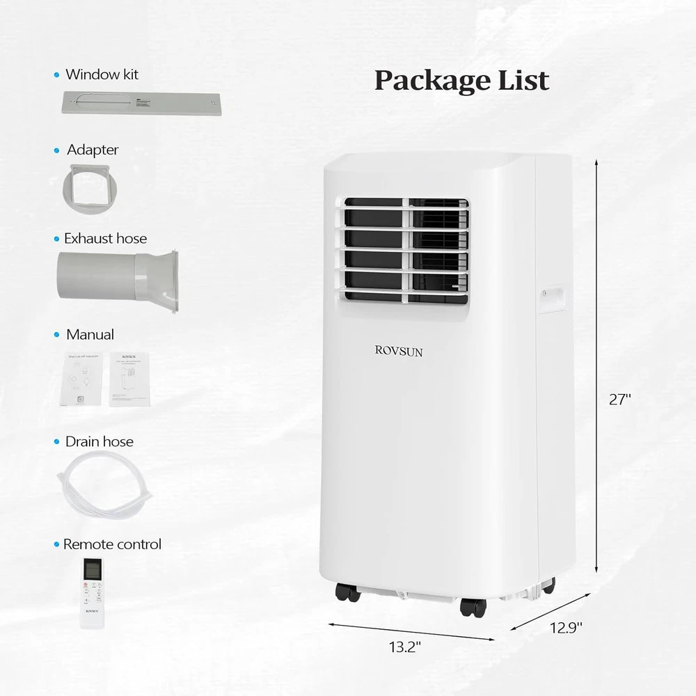 Power Source: Electric Features: Dehumidifier, Timer, Indoor, Portable, Remote Control, Fan Only option, Fan Area Covered: 200 Sq. Ft. ​ Mounting Location: Floor Type: Portable Air Conditioner BTU Cooling Rating: 8000 BTU/H (ASHARE) / 5100 BTU/H (SACC) Cooling Method: Air Timer Control: 1-24 Hours CEER: 6.5 Length Of Exhaust Hose: 59 inch / 150cm (Diameter: 5.9 inch / 15cm) Brand: ROVSUN Noise: 53/52 dB Air Flow: 163 CFM gtin13: Does not apply Temperature Setting Range: 61-88°F (16-31°C) Voltage: 115V/60Hz UPC: Does not apply Material: Plastic Filter Type: Washable Control Style: Remote Control Heating Capacity:: 8000 BTU/H Color: White Power: 771W