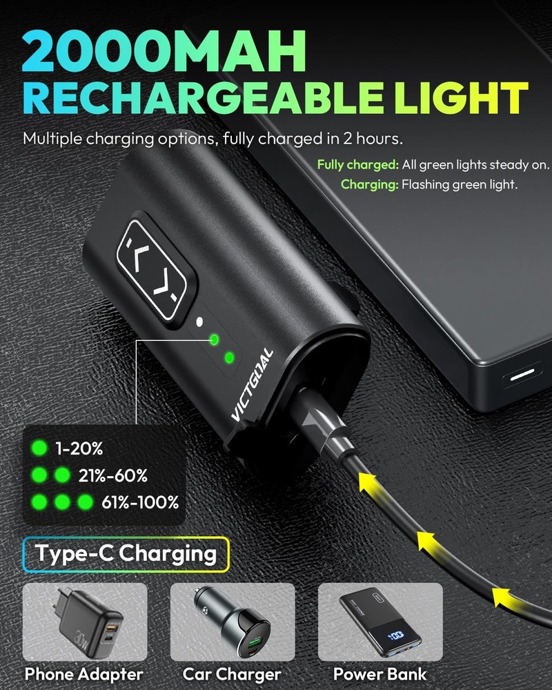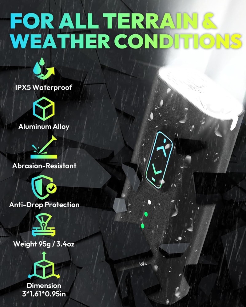 Product Description: Brightness: 800 Lumen Waterproof: IPX5 Size: 4.1*7.5*2.4cm Weight: 105g Material: Aluminum alloy Battery: 2000mAh rechargeable LED Bulb: LED*2 Lighting Modes: 13 lighting modes High Beam Modes: High-Medium-Low-Strobe-SOS Low Beam Modes: High-Medium-Low-Strobe-SOS Double Click to switch dual light mode: High-Medium-Low Battery Display: 3-level battery indicator Package include: helmet light*1, adjustable helmet mount *1, handlebar mount*1, type-C cable*1, instruction*1. Features: 1.The Powerful Bike Headlight that fits any bike or scooter handlebar is the essential accessory for night rider. 2.The High performance front bike helmet light that can be mounted to any helmets will enhance visibility and safety while illuminating your path. 3.The cycling helmet light is equipped with dual beam, can help us deal with different situation and demands while providing 13 modes and 3 brightness levels. 4.The light for bike helmet is so portable and waterproof that can be perfect for multi-activities as cycling, hiking, camping and repairing. 5.The front helmet lamp with 2000mAh battery provide long battery life on a single charge, can be speedy Type-C charging and easy battery monitoring. High Brightness & Easy Operation: Super bright 800 Lumens bike helmet light with dual beam can provide 13 modes and 3 brightness by 2 buttons. Easy switch between High and Low Beam of the bicycle headlight can ensure the maximum visibility in night cycling, farther, wider and safer. Mount on Helmet & Handlebar: The bike helmet light provides an adjustable helmet mount and a handlebar mount that suitable for most helmets or the handlebar of any bikes and scooter. Ensuring the front bike light always illuminates the path effectively and safely as a perfect addition for biking, hiking, or any nighttime adventure. Long Battery Life & Quick Charge: Helmet light features a 2000mAh battery to provide extended use of 8 hours on a single charge, ensuring stay illuminated during outdoor activities. Type-C quick charging and battery indicator of the bike front light makes it easy to power up and monitor before next outing. Durable, Lightweight & Waterproof: Bike headlight is crafted from high-quality aluminum alloy, weighs only 105g making the helmet light easy to carry and mount. Its IPX5 waterproof rating offers protection against rain and splashes, ensuring use in various weather conditions. Versatile Use of Helmet Light: With the handlebar base and helmet mount, the portability, high brightness and IPX5 waterproof of the front bike light is ideal for multiple outdoor activities, including cycling, camping, camping and repairing. Being safe in low-light situations with our reliable illumination bicycle headlight.