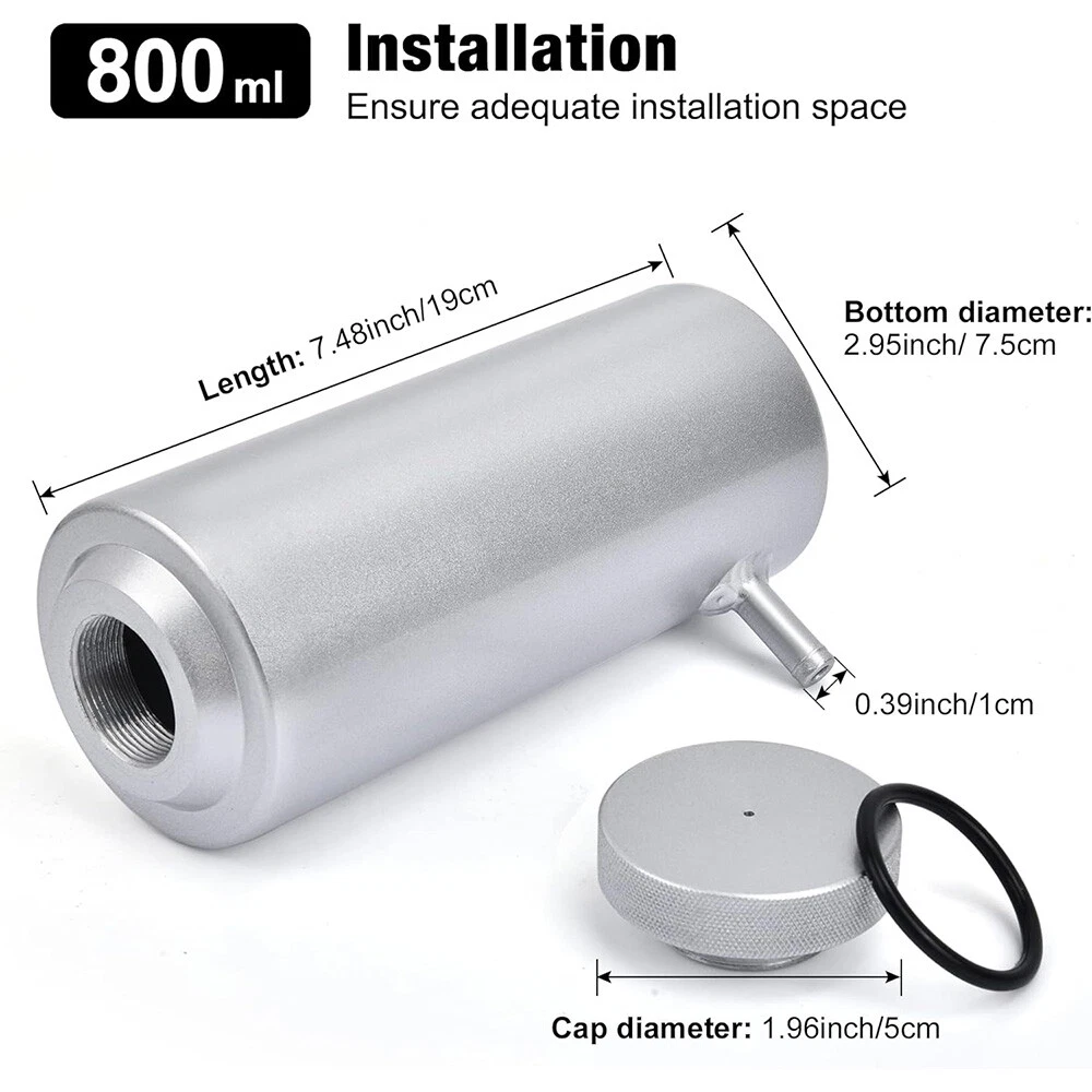 800ML Universal Radiator Coolant Catch Tank Kit Overflow Reservoir Aluminum NEW Product Description Description: Material:Aluminum alloy Length: 19cm/7.48inch Bottom diameter:7.5cm/2.95inch Cap diameter: 5cm/1.96inch Volume:800ml Hose ID: 5/16inch Working temperature range:-30 ° to 120 ° Maximum working pressure: 1MPA Burst pressure: 2MPA Feature:Designed with a 1/16" ventilation hole in the overflow bottle top for heat dissipation. O-ring seal to effectively prevent coolant leakage Package: 1 x Overflow Catch Tank Set Payment Delivery details Terms of sales About us Contact us Payment 1.We only accept PayPal. PayPal is the only online payment method we accept. Please make sure you have a valid/confirmed PayPal account prior bidding. 2.All Paypal Payments must be Confirmed. Payment must be made within 48hrs of the auction end time. Non-Paying bidders will be reported. 3.When you get your package,maybe you will pay some charges, it's taxes for local customs,not pay to us, and the fees are depends on the customs, all buyer are same. Delivery details 1.Items will be shipped within 2 business days after payment is received. 2.We ship to your eBay address. Please make sure your eBay address is correct. Buyer takes responsibility if eBay address is wrong. 3.Import duties, taxes and charges are not included in the item price or shipping charges. Please check with your country customs office for these additional charges. 4.We shipping using UPS or USPS from our nearest warehouse to you. Tracking numbers will be emailed upon shipment. Terms of sales 1.Please feel free to email us if you have any question. 2.We appreciate you contact us via eBay message when you are not satisfied rather than open case or leave negative feedback directly. We'll try our best to solve the issue. 3.Refund will be issued once we receive your returned items. Buyer is responsible for all return shipping charges. 4.Please contact us for return process before you return the item. 5.All items for exchange or refund must be returned in "as new" condition. About us We are the responsible seller ,always provide high-quality products and best service .If you have any questions, please contact us, and will try our best to help you. Please contact us by eBay Message, and we will reply you within 24 hours. Thank you very much! Contact us We are the professional auto parts manufacturer , and provide line lock, AN hose end fittings , fuel line , fuel filter , fuel regulator , exhaust cutout , exhaust tips , exhaust muffler and so on .The quality of the product to be secured. If you have any questions or any needs , please contact us , and will try our best to help you.