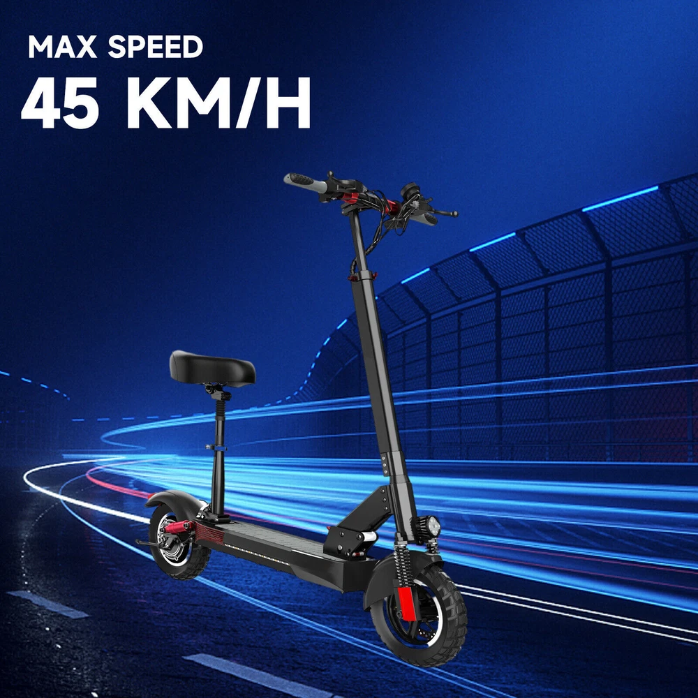 This scooter is a beast! The 800W motor delivers smooth, powerful acceleration, and the 10" off-road tires handle rough terrain effortlessly. With a top speed of 45km/h and a 55km range, it's perfect for commuting or adventure. The sturdy seat adds comfort, and the dual disc brakes ensure safety. The LCD display keeps you informed, and the IP55 waterproof rating means no worries in light rain. At 24kg, it's lightweight yet durable, supporting up to 150kg. Absolutely worth every penny—fun, reliable, and built to last!