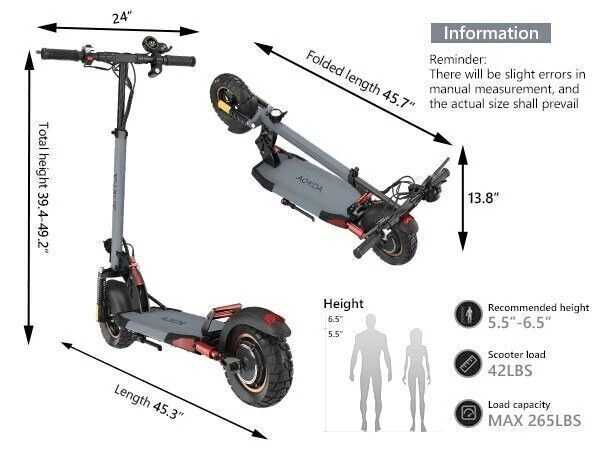New Way to Across the City Freely The AOKDA electric scooter for adults which is powered by 48V/10Ah battery, makes it easier for you to complete daily travel. One charge is enough for you to ride for 20 miles under specific conditions. Max load 265 lbs. Let You Ride As You Want, Easy to Drive Our e-scooter has three different riding modes (Eco: 15Mph, D: 22Mph, S: 28Mph), you can choose the most suitable mode for you according to your needs, and the strong 800W brushless motor allows you ride speed up to 28Mph. Comfortable Riding Experiences, Enjoy Every Trip Our electric scooter for adult adopts front and rear wheel suspension system and 10-inch pneumatic tires, which means you can enjoy a smoother and more comfortable riding experience, even on rough roads. Make Riding More Safety Our e-scooter for adult is not only equipped with super bright headlight & taillight, but also has a side ambient light, which improves the safety of night riding and allows you to travel with peace of mind at any time. The perfect front & rear dual brakes and electronic braking system allow you to stop whenever you want. Easy to Fold & Carry You can fold the electric scooter for adults with two-steps only in a few seconds for carrying and storage. The unfolded size: 45.28"L x 23.62"W x 47.24"H. The folded size is 45.28"L x 8.66"W x 17.72"H, easy to put in your garage or office. Buy with Confidence We have always focused on the quality and technical improvement of electric scooters. Our adult electric scooter is designed to be the most sturdy and powerful electric scooter which will quickly become your favorite commuting or outdoor travel companion. We offer 180-days warranty for different parts, contact us to get fast and professional service. Important Note The max speed and max range per full charged vary based on several factors, including: rider weight, riding surface, incline, ambient temperature, battery level, riding style (stop/start vs cruising), etc. Q&A: How fast can the electric scooter go? Top Speed: 28MPH / 45KMPH (the speed greatly depends on the rider weight, road condition, riding mode...etc) How long do the electric scooter last? Well, with proper care and maintenance, this e-scooter can last anywhere more than 5 years or even longer. What are the benefits of this off road electric scooter? This off road electric scooters with high power motor, fast, portable, and with detachable seat. Not only good for off road riding, but also good for urban commuting. It also save you money on gas because they can be charged quickly. Do this electric scooter work in the rain? Well, it support IP6 waterproof. It's OK to work in small rain, but not recommend in heavy rain. And the pedal of the e scooter cannot be submerged in water. Or the battery and controller will be damaged.