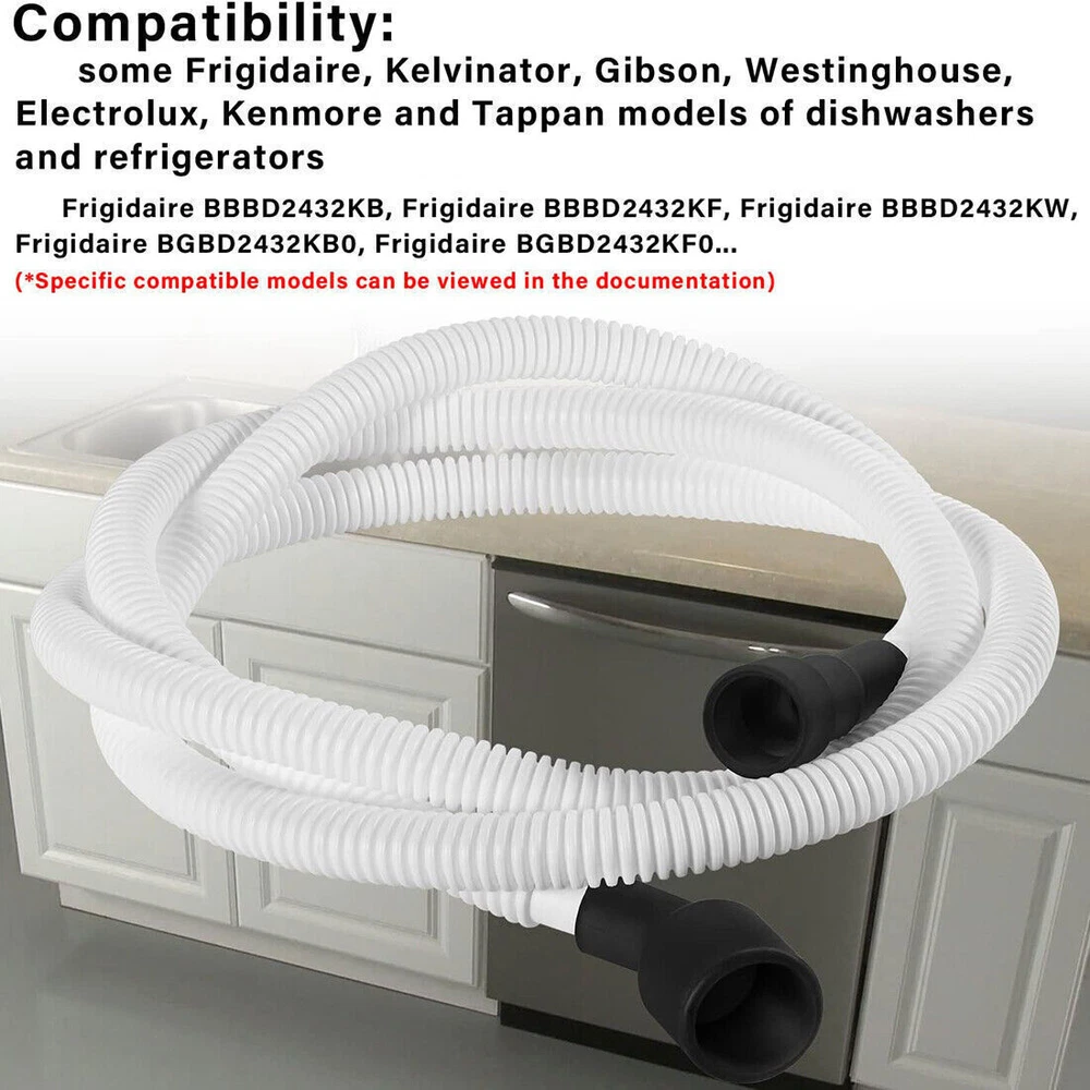 Fitment: The 807117001 drain hose is compatible with some Frigidaire, Kelvinator, Gibson, Westinghouse, Electrolux, Kenmore and Tappan models of dishwashers and refrigerators. Compatible with the following models: Frigidaire BBBD2432KB, Frigidaire BBBD2432KF, Frigidaire BBBD2432KW, Frigidaire BGBD2432KB0, Frigidaire BGBD2432KF0... (*Specific compatible models can be viewed in the documentation) Material: 807117001 drainage hose is made of plastic and rubber, durable and good sealing. The drain hose is 96" long. The drain hose carries drainage from the dishwasher drain pump to the kitchen sink drain. Function: Simple and easy to install, just follow the instructions. 807117001 drainage hose can solve the problem of not draining, draining too slowly and leaking. Set Includes: 1*807117001 drain hose. Replacement part numbers: 807117001, AP5806794, PS9494138, 154753201, 154369601, 154411001, 154411002, 154411003, 154525301, 154606701, 3276641, 5304435286.