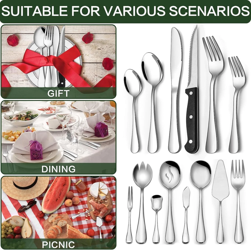 80 Pieces Silverware Set with Serving Utensils Set, CEKEE 80 PCS, Silver Product Details Brand: CEKEE Number of Pieces: 80 Material: Stainless Steel Flatware set Color: Silver Product Care Instructions: Dishwasher Safe Recommended Uses For Product: Wedding, Dinner, Home, Hotel, Gift or Party Special Feature: Rust Resistant Finish Type: Polished Included Components: 12 dessert spoons, 8 Serving Set, 12 dinner forks & 12 salad forks, 12 dinner knives, 12 serving spoons Style: Modern Item Weight: 8.49 Pounds Is Stain Resistant: Yes Is Dishwasher Safe: Yes Manufacturer: CEKEE Package Dimensions: 9.53 x 8.11 x 2.24 inches Item Weight: 8.49 pounds Country of Origin: China Included Components: 12 dessert spoons, 8 Serving Set, 12 dinner forks & 12 salad forks, 12 dinner knives, 12 serving spoons 12 dessert spoons, 8 Serving Set, 12 dinner forks & 12 salad forks, 12 dinner knives, 12 serving spoons12 dessert spoons, 8 Serving Set, 12 dinner forks & 12 salad forks, 12 dinner knives, 12 serving spoons See more 80 PIECES SILVERWARE SETS FOR 12: This flatware set contains 12 Steak Knives, 12 dinner forks, 12 salad forks, 12 serving spoons, 12 dessert spoons, 12 dinner knives and 8-piece matching serving utensils set. The cutlery set is also an irreplaceable dining tool whether it is for daily use or for preparing restaurants, pubs, cafes, hotels, dinners or parties PREMIUM STAINLESS STEEL FLATWARE SET: Made of high quality food-grade stainless steel, providing the longest term value and the best properties, silverware set stainless steel is highly resistant to corrosion, rust, staining and will not produce residues or odors like other materials. Most importantly, forks spoons and knives set are DISHWASHER SAFE FINE WORKMANSHIP: Highly mirror polished always keep shiny, smooth edges without rough spots, will not hurt your mouth or hand. Stainless steel silverware set is sleek and modern design, which makes a touch of elegance to any dining table. The dinner knife blade design has serrated edges, sharp enough to easily cut through food COMFORTABLE & ERGONOMIC HANDLE: Flatware set for 12 is easy to hold. The proper weight and perfect balance is added to ensure maximum comfort during use that avoids you feel tired.This forks and spoons silverware set makes you enjoy the food comfortably USE AND MAINTENANCE: For long-term use and shines, recommend hand wash first, storage them after drying. Wire brush, hard sponge, cleaning cloth or any other hard material are not recommend, kitchen silverware will damage the silver CEKEE stainless steel cutlery set is perfect for various special occasions. Whether it's a family gathering,holiday celebration,or dinner party,this set adds a sophisticated touch to your table setting,making every meal a memorable experience. Enjoy the versatility and timeless elegance of our 80-piece utensil sets silverware.