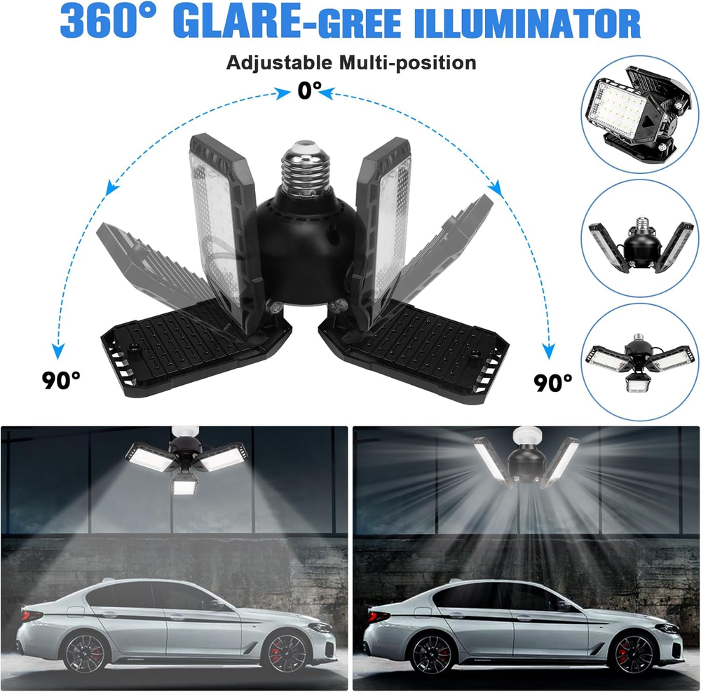 These LED garage lights are a game-changer! Super bright at 8000LM, they light up my workspace perfectly. The three adjustable panels let me direct light exactly where needed, and they’re easy to install with E26/E27 sockets. Great for garages, basements, or workshops—durable, energy-efficient, and worth every penny. Highly recommend!