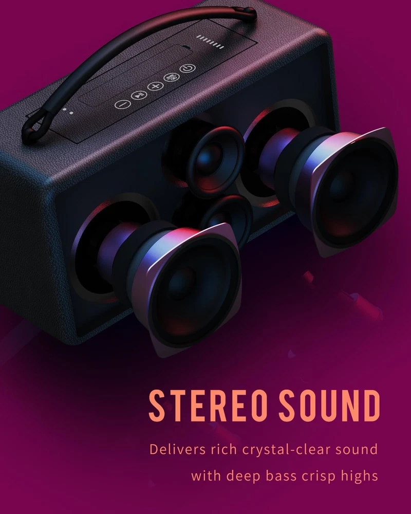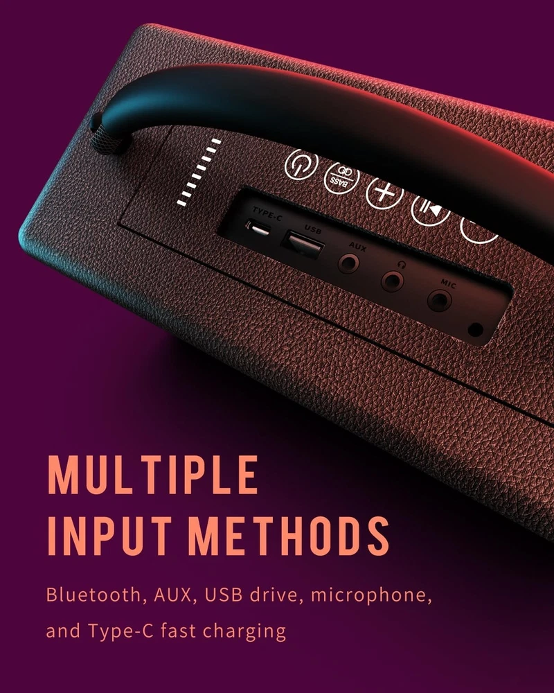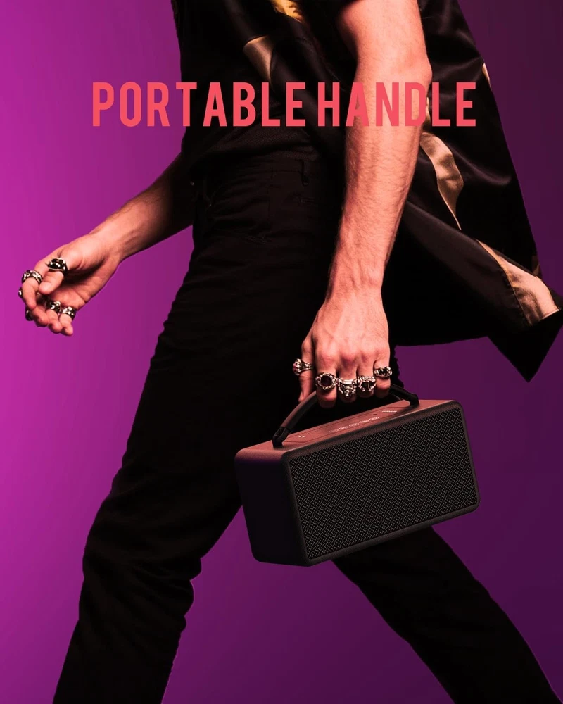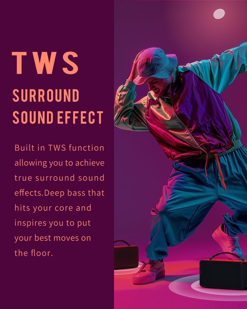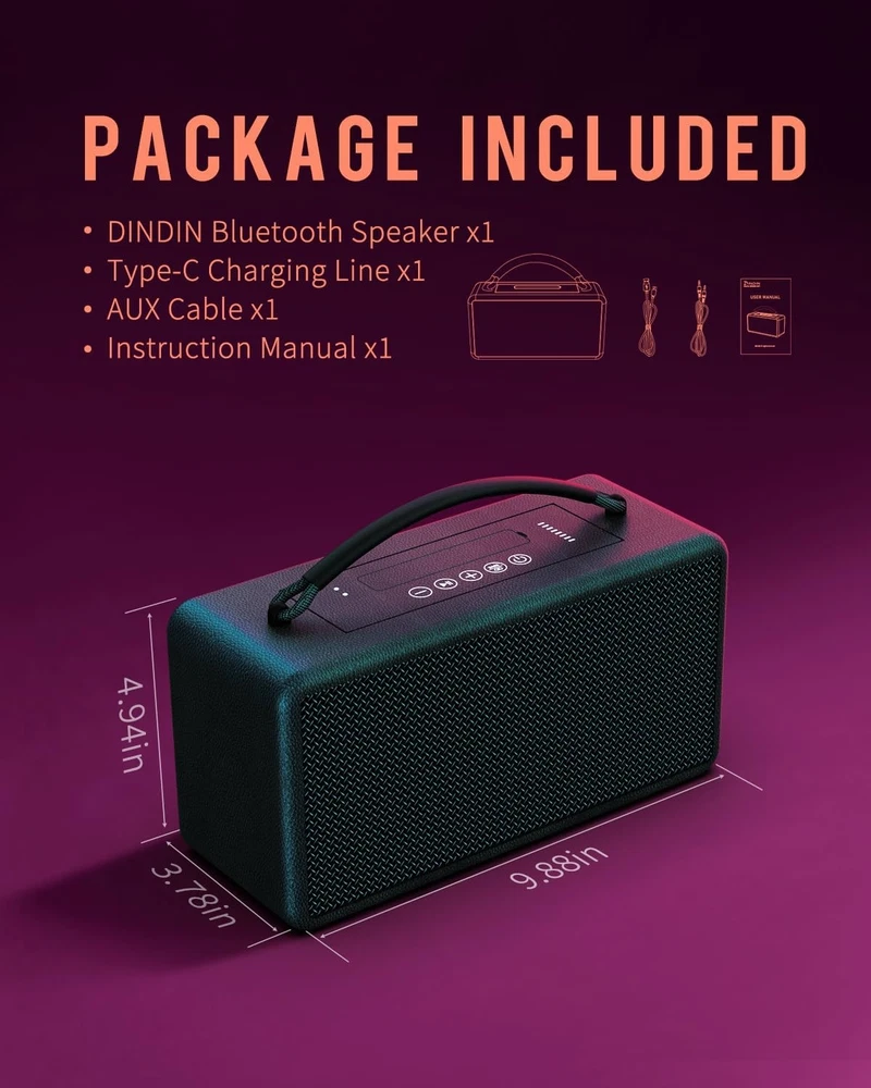 DINDIN Portable Bluetooth Speaker: 80W (Peak), 20H Playtime, Loud Black Product Details Input Voltage: 5 Volts Mounting Type: Floor Standing Material: Wood Model Name: MA-B Speaker Type: Floorstanding Special Feature: Bass Boost, Built-In Powerbank, Portable, Stereo Pairing, USB Port Recommended Uses For Product: Indoor/Outdoor Compatible Devices: Desktop, Laptop, Projector, Smartphone, Television Unit Count: 70.4 Ounce Surround Sound Channel Configuration: 2.0 Color: Black Battery Life: 20 Hours Included Components: 1*3.5 MM AUX cable, 1*DINDIN-007 portable Bluetooth speaker, 1*Type-C charging cable, 1*instruction manual Product Dimensions: 9.88"D x 3.78"W x 4.92"H Age Range (Description): Adult Battery Capacity: 10000 Amp Hours Charging Time: 6 Hours Maximum Range: 33 Feet Number of Items: 1 Control Method: Touch Wireless Communication Technology: Bluetooth Speaker Size: 2.5 Inches Power Source: Battery Powered Signal-to-Noise Ratio: 85 dB Customer Package Type: Paper Box Number of Batteries: 4 A batteries required. (included) Audio Encoding: Audio 5.1 Audio Driver Type: Bass Driver Bluetooth Range: 10 Meters Connectivity Protocol: Bluetooth Processor Count: 1 Specific Uses For Product: Outdoor, Home, Office Style: Black Whirlwind Manufacturer: DINDIN Item Weight: 4.13 pounds Item model number: DINDIN-007 Batteries: 4 A batteries required. (included) Brand: DINDIN Speaker Maximum Output Power: 80 Watts Frequency Response: 20000 Hz Connectivity Technology: Bluetooth Audio Output Mode: Surround 80W PEAK POWER & BASS UP: small body and big heart, DINDIN-007 Bluetooth speaker is equipped with two 3-inch full-range speakers and two Silk tweeter. The four-unit configuration has been adjusted by professional tuners, giving it a strong heart and a strong 80W Bluetooth speaker (PEAK) sound. 20H PLAYTIME BUILT-IN POWER BANK: This 10000mah capacity wireless Bluetooth speaker meets the daily speaker battery life needs and is suitable for parties and garden barbecues. In outdoor emergencies, this wooden speaker can reverse charge the phone to deal with emergencies. EXQUISITE WOODEN BOX HANDMADE: The pure wooden speaker box has uniform density, which can effectively suppress the noise of the box resonance, making the low frequency dive deeper and more volume to enhance the bass. The duct design releases the gas in the closed cavity, significantly expanding the low-frequency response range. The duct design can better dissipate heat, reduce this portable bluetooth speakers power loss and heat generation, and extend battery life. TWS BLUETOOTH 5.3 SPEAKER: This loud bluetooth speaker is equipped with Bluetooth 5.3, which connects faster. It also has TWS pairing technology, allowing you to enjoy 160W surround sound immediately. Whether it is in the garage, backyard, camping or at work, this speakers bluetooth wireless can meet the various scenarios of using speakers in your daily life. PORTABLE HANDLE SPEAKER: The woven handle wrapped in silicone is non-slip and firm, so you can carry it with you and keep your music with you. The speaker body with a golden ratio is stylish and durable, which can perfectly decorate your bookshelf and desk. This outdoor bluetooth speakeris an exquisite decoration and a great gift.