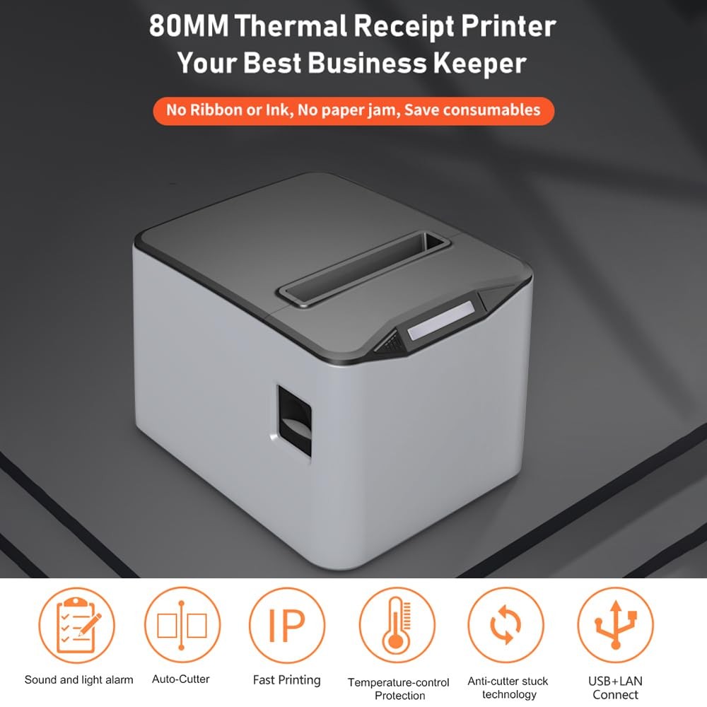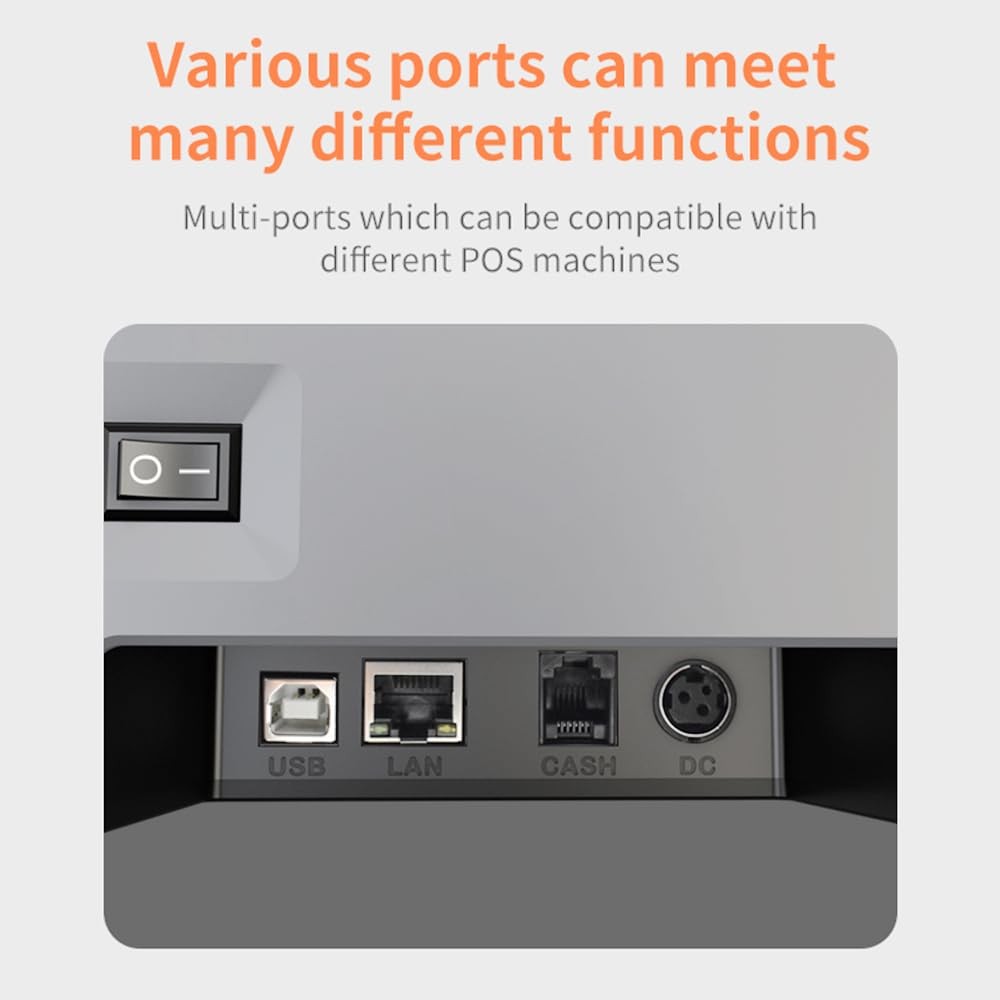 Specification: Model: POS-8370 Color: Black, Grey, White (Optional) Product Size: 17.5x14.2x12.2cm/6.8x5.5x4.8in Product Weight: 0.84kg/29.6oz Print Method: Direct Line Thermal Interfaces: USB+LAN Print Command: ESC / POS command Print Speed: 220mm/s Resolution: 203DPI (8dot/mm) TPH Reliability: 100km Auto Cutter: Partial Cutter Life: 1 million cuts Logo: support downloading and printing logo Line Spacing: 3.75mm (Adjustable by commands) Paper Types: Thermal Roll Paper Paper Width: 79.5±0.5mm / φ 80 mm Print Width: 72mm Paper Thickness: 0.06-0.08 mm Extension Character Sheet: PC437(Standard Europe), Katakana, PC850(Multilingual), PC860(Portuguese), PC863(Canadian), PC865(Nordic), West Europe, Greek, Hebrew, East Europe, Iran, WPC1252, PC866(Cyrillic#2), PC852(Latin2), PC858, IranII, Latvian, Arabic, Thai, PT151(1251) Character Size: ANK,Font A: 1.5x3.0mm(12x24 dots) Font B:1.1x2.1mm(9x17 dots) Chinese, Traditional Chinese:3.0x3.0mm(24x24 dots) Supported Code: 1D: UPC-A / UPC-E / JAN13 (EAN13) / JAN8 (EAN8) / CODE39 / ITF / CODABAR / CODE93 / CODE128 2D: QR CODE, PDF417 Input Buffer: 96K bytes NV Flash: 256K bytes Driver: Win2003 / WinXP / Win7 / WIN8 / WIN10; Linux; MAC; Power Input: AC 110V/220V, 50~60Hz; Power Output: DC 24V/2.5A Package Size: 20.3x18.6x13.9cm/7.9x7.3x5.4in Package Weight: 1220g/43oz Note: Please download the driver via http://www.cnfujun.com/d/33 Packing List: 1 x Thermal Receipt Printer 1 x Power Cable 1 x USB Cable 1 x Paper Roll (80*30mm) 1 x User Manual ▶ USB Receipt Printer: Work with USB / LAN, easy to operate and convenient to print. Compatible with Win2003/ XP/7 /8 /10, Linux and MAC OS. Support cash drawer driving, compatible ESC/POS print commands. ▶ Efficient & Affordable Printing: The thermal receipt printer high efficiency with auto cutter and the fastest printing speed can up to 220mm/sec. Easy for paper installation, Easy maintenance, and excellent structure. Adopting thermal print head, no need of ink cartridges or ribbons, clear printing, low operation cost, thermal paper is easy to buy. ▶ Thermal Printer Spec.: 80mm paper width, 72mm print width, and able to hold maximum 83mm paper roll diameter, 203dpi resolution. Clear printing quality and reliable performance. Support a variety of content can be printed, multi-language text/picture/logo/1D/QR code all support printing. ▶ Wall Hanging Design: Kitchen printer with 2 hanging holes on the bottom support wall mount hanging. Easy to use, save the place. ▶ Wide Application Range: This POS printer is a better choice for your retail stores, grocery stores, clothing stores, supermarkets, cafés, restaurants, or any other business that uses receipts. Note: Please download the driver via http://www.cnfujun.com/d/33
