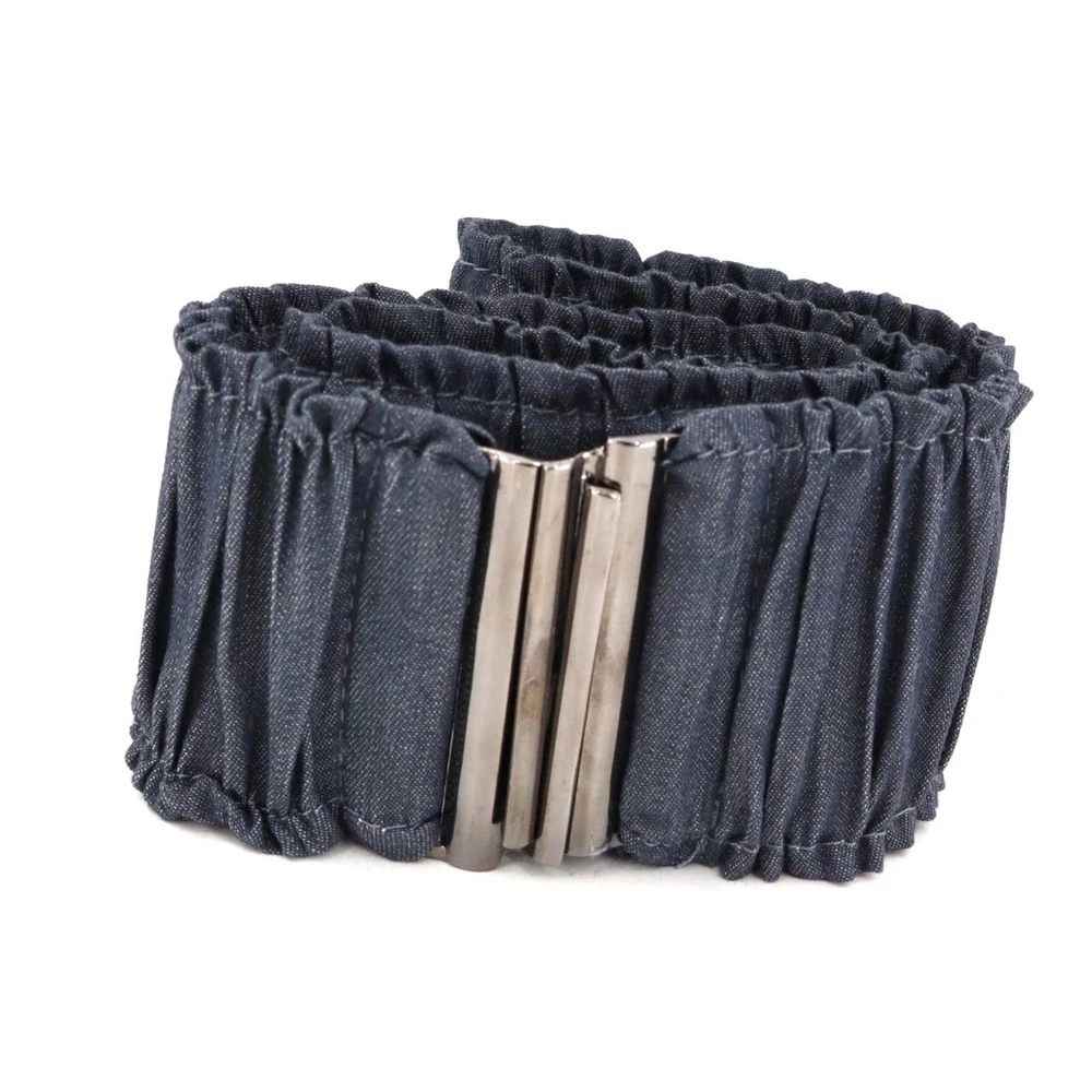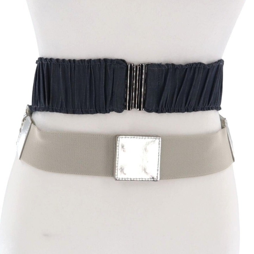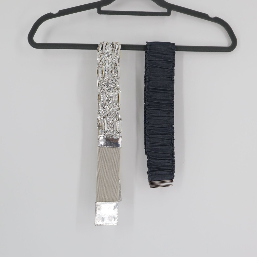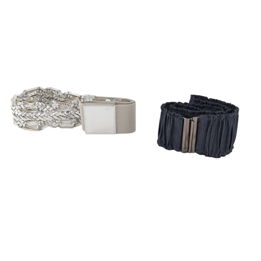 Stretchy 80's Belt Set of 2 Women's Blue Silver Ruffle Metallic Y2K Retro Fashion These belts are ready to stretch your style to new heights, literally! They're perfect for those days when you want to feel like you're in a retro music video. Whether you're cinching a dress or adding flair to jeans, these belts have got your back – and your waist! • Elastic stretch material • Metallic silver and blue color • Snap button closure • Adjustable fit • Blue Belt - 22" length • Silver Belt - 27" to 30" length