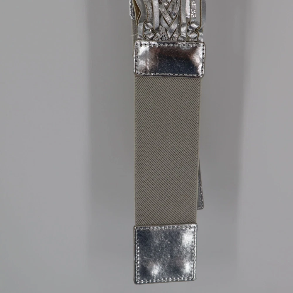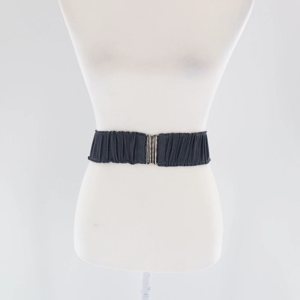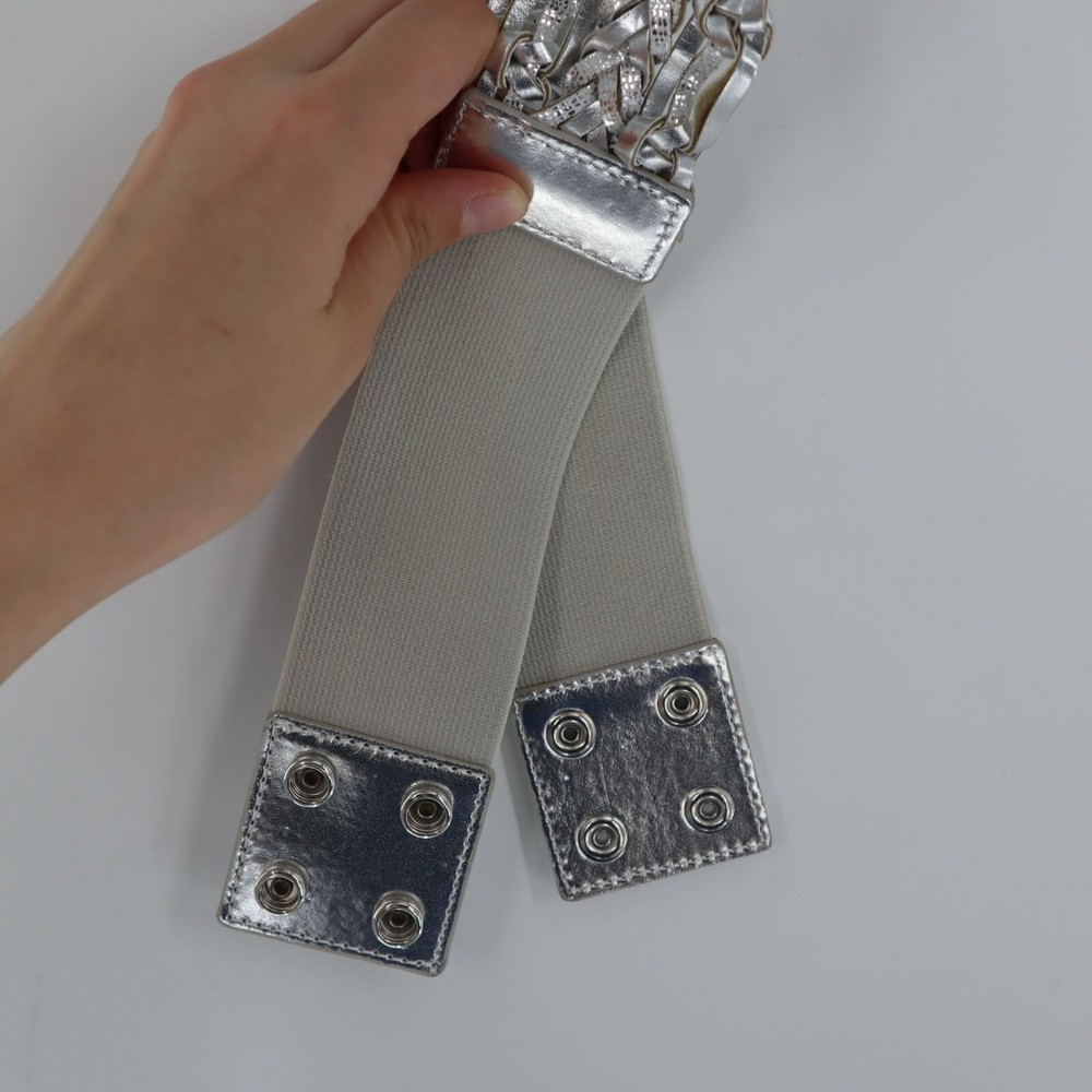 Stretchy 80's Belt Set of 2 Women's Blue Silver Ruffle Metallic Y2K Retro Fashion These belts are ready to stretch your style to new heights, literally! They're perfect for those days when you want to feel like you're in a retro music video. Whether you're cinching a dress or adding flair to jeans, these belts have got your back – and your waist! • Elastic stretch material • Metallic silver and blue color • Snap button closure • Adjustable fit • Blue Belt - 22" length • Silver Belt - 27" to 30" length